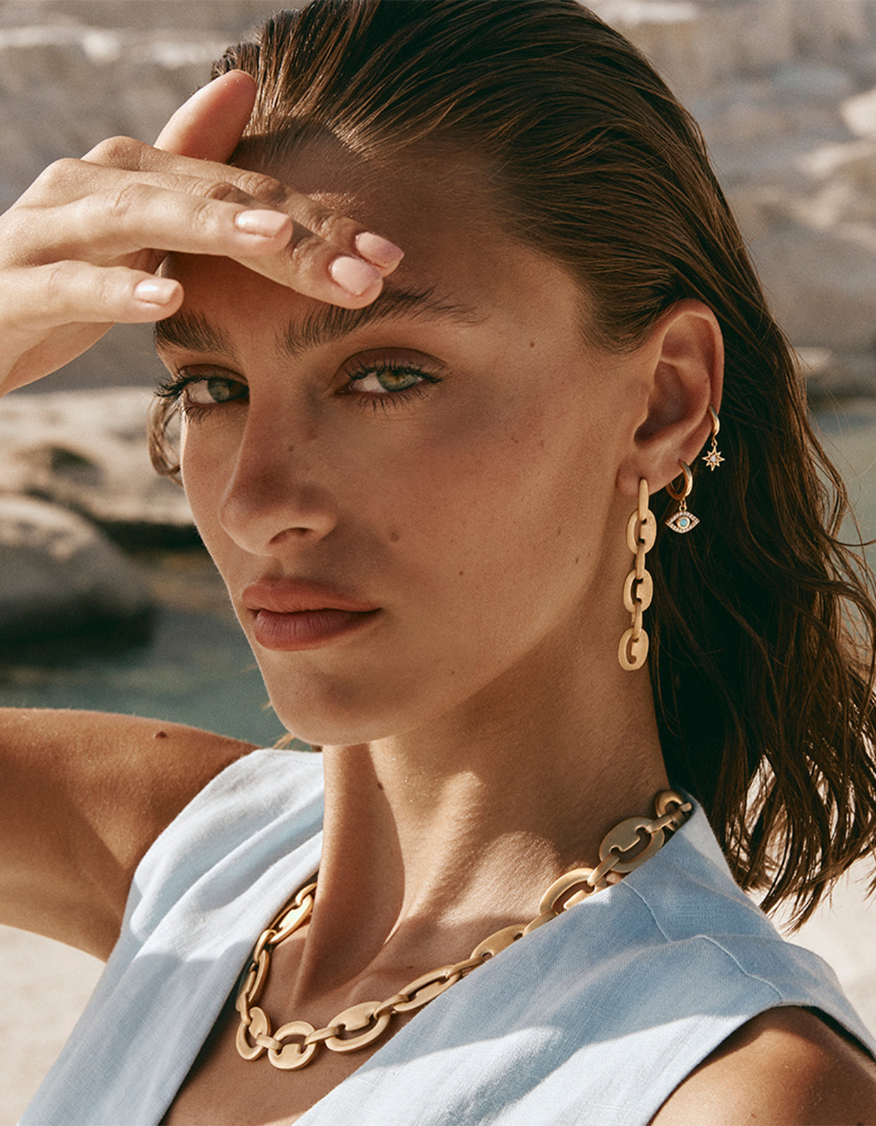 These modern earrings feature a mesmerizing turquoise evil eye, believed to ward off harm and bring good fortune. Versatile for any occasion, these hoops are a mystical must-have for your collection.