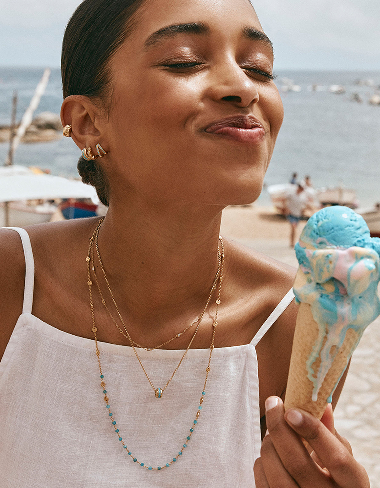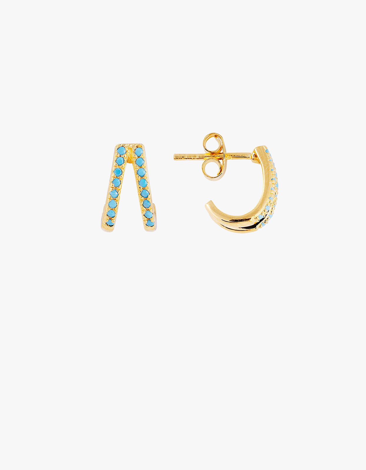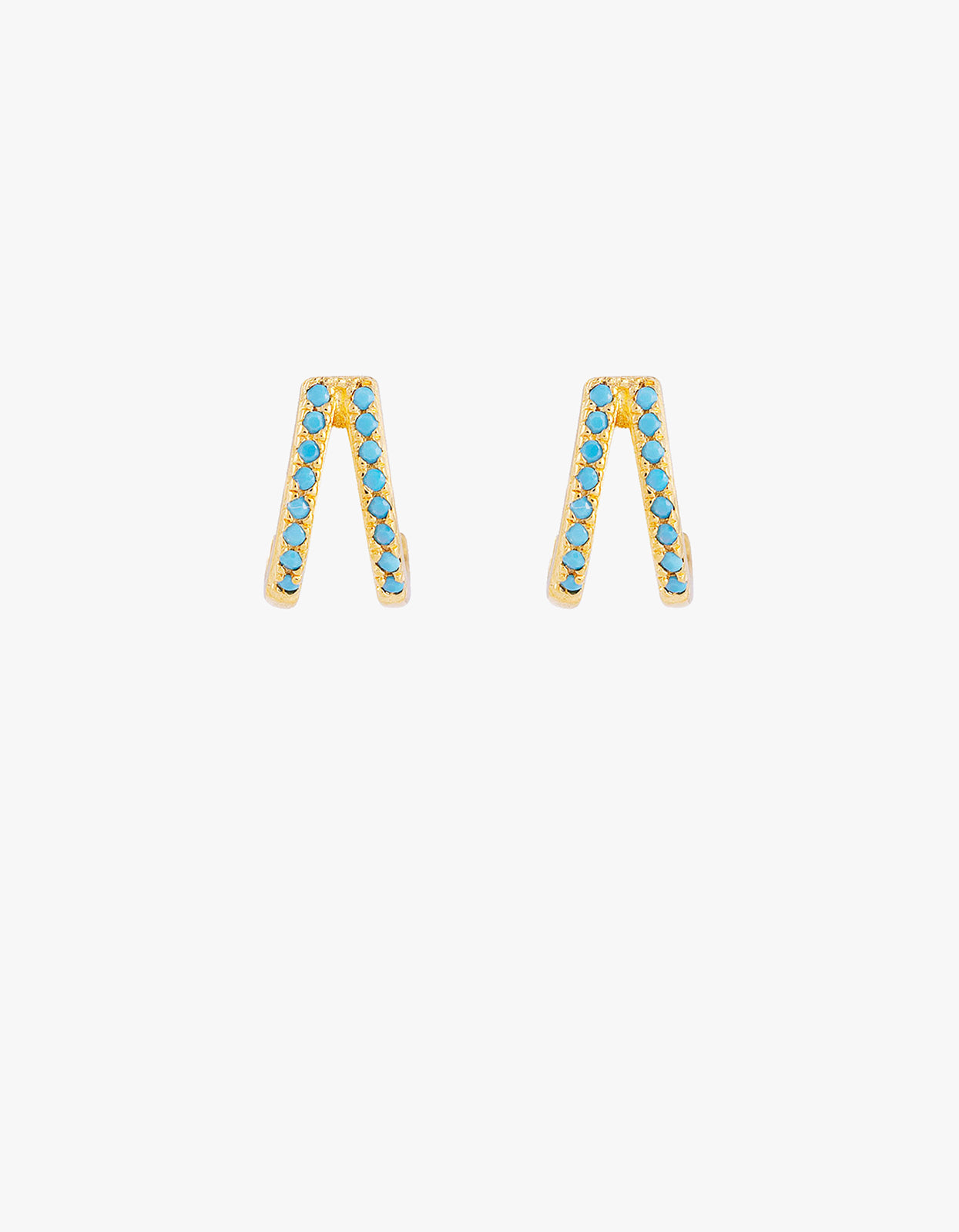 The Turquoise twin Pave Huggies are crafted from 18k gold-plated sterling silver and finished with a striking row of turquoise crystals. Bold yet refined, these little gems sit snug for that effortless coastal-luxe vibe. Wear them stacked or solo— either way, they’re bringing the glow.