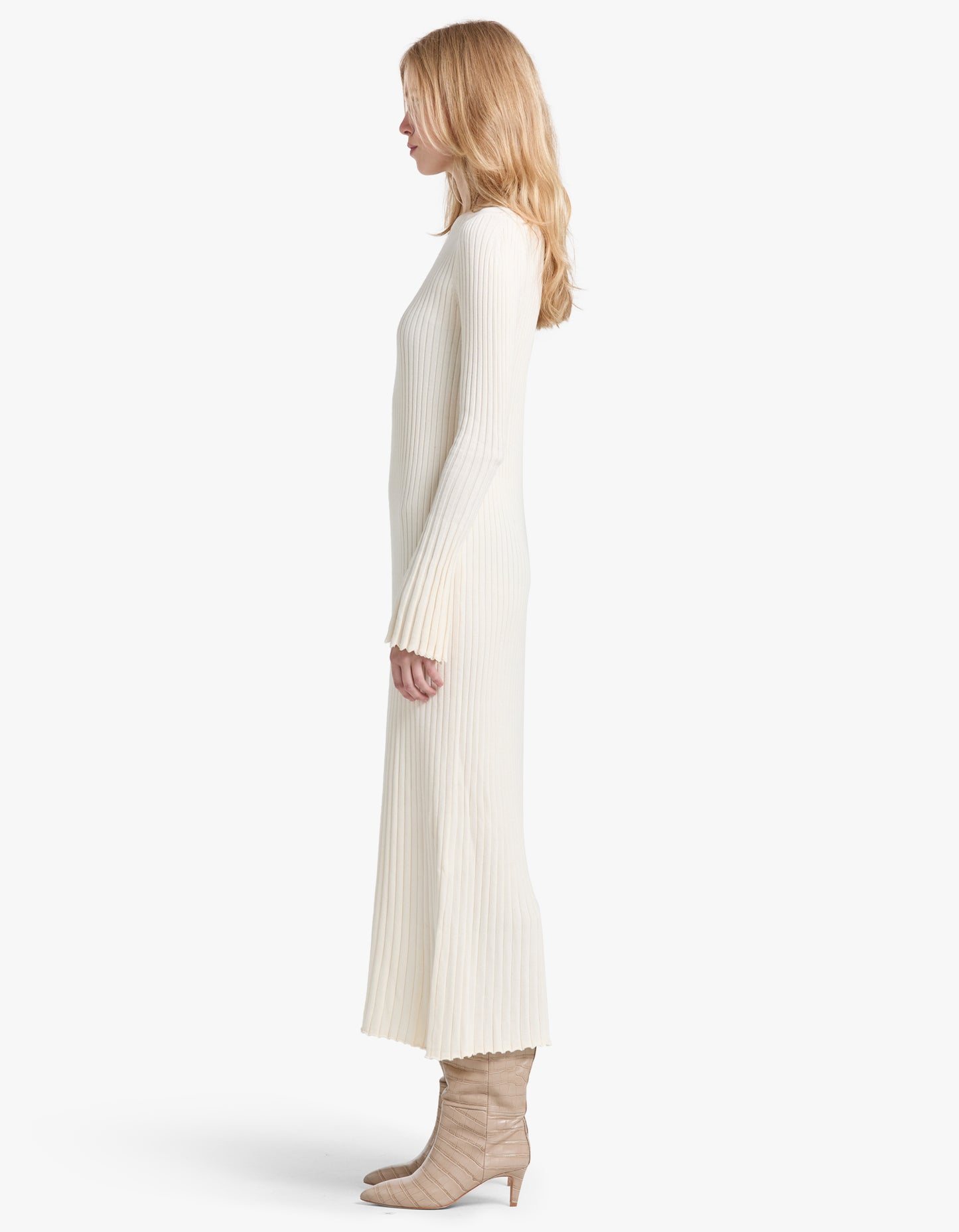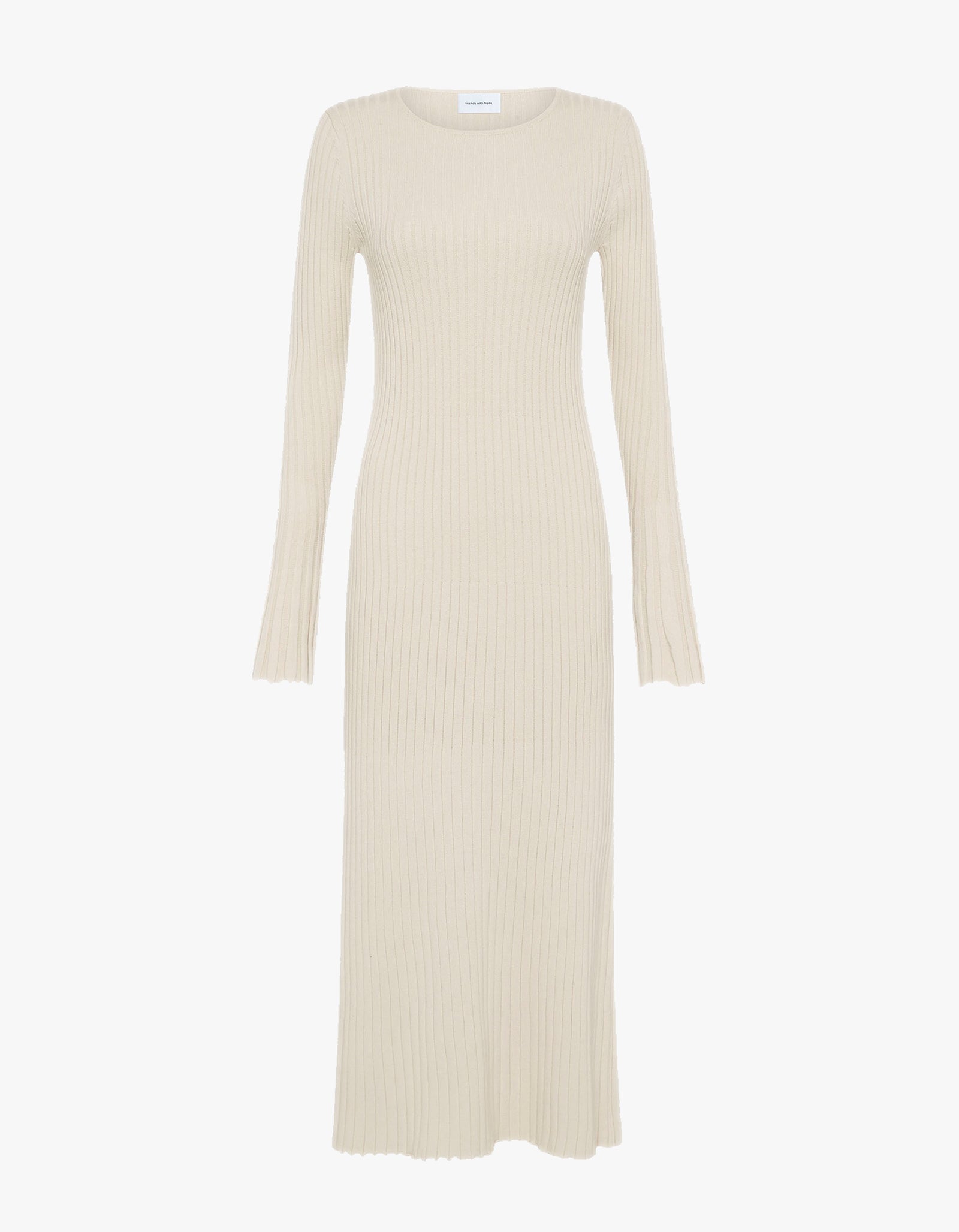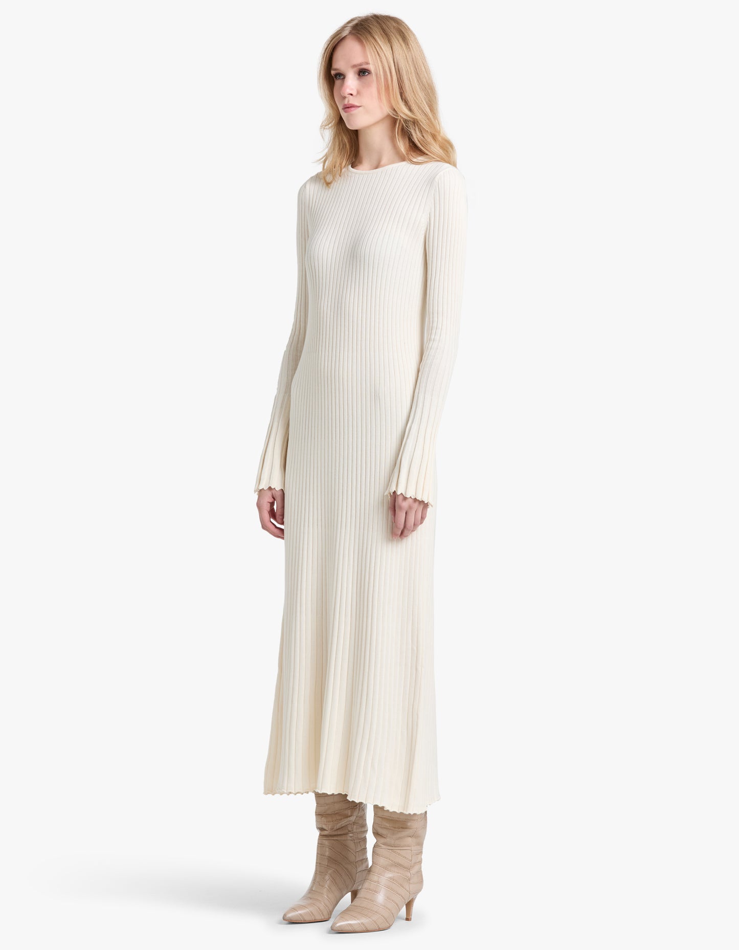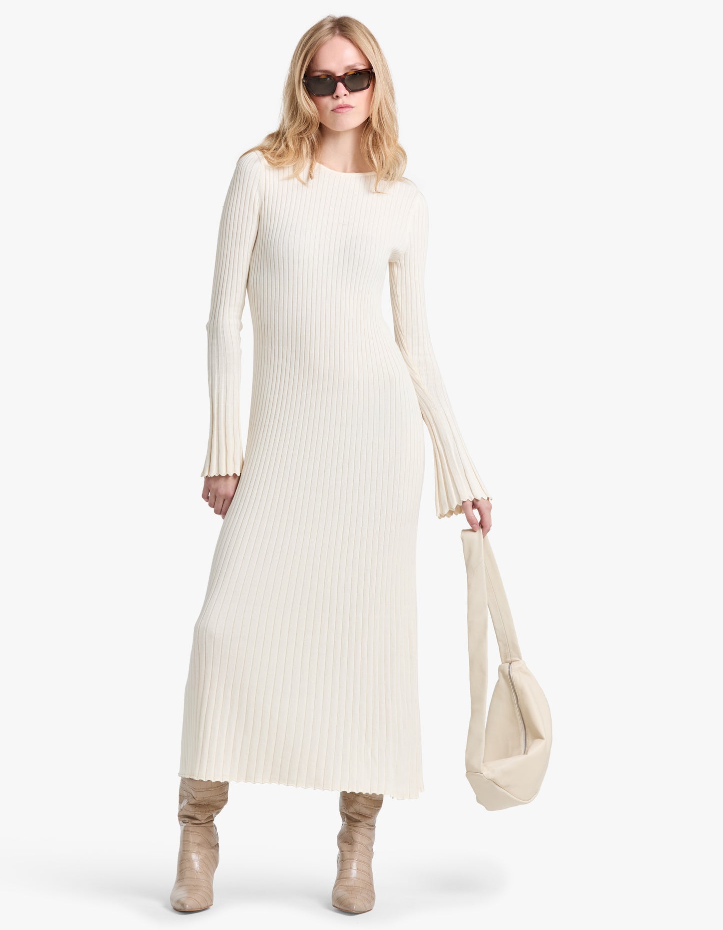 Crafted from breathable ribbed cotton for ultimate comfort. The minimalist design features a draped flare sleeve and textured ribbed knit. This easy-wear dress effortlessly transitions from desk to dinner, making it a versatile piece in any wardrobe. Elevate your style with the Cleo Dress in elegant cream.