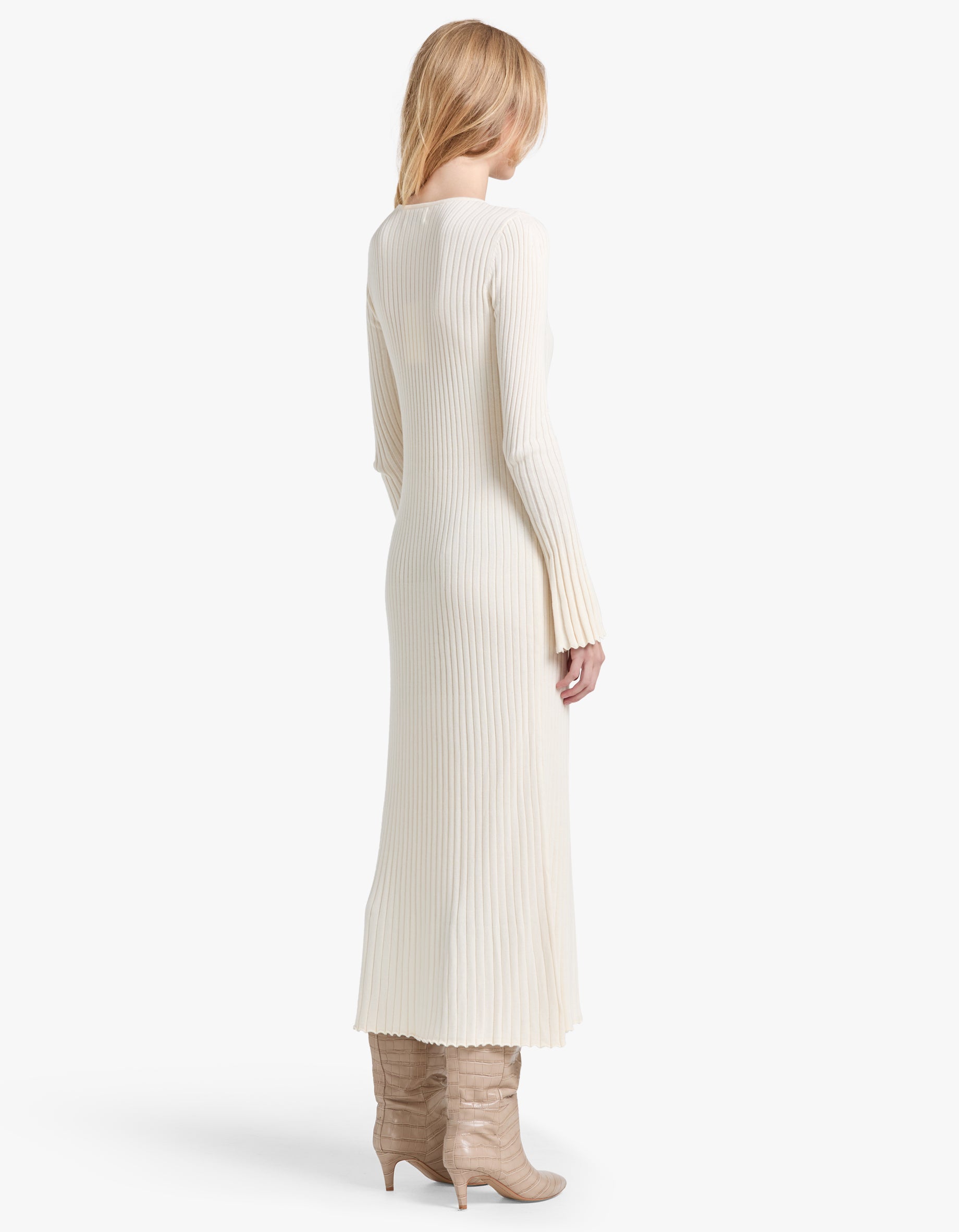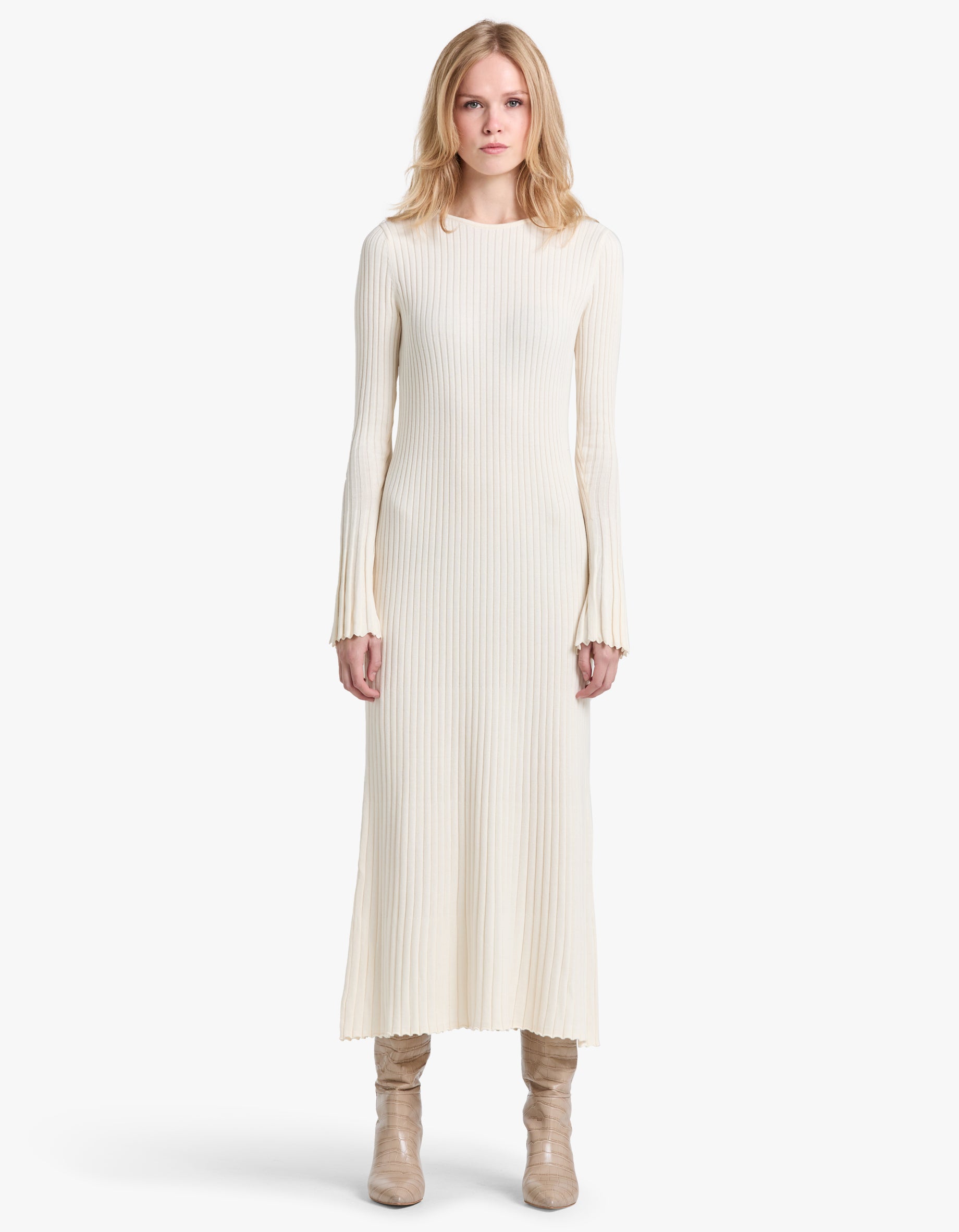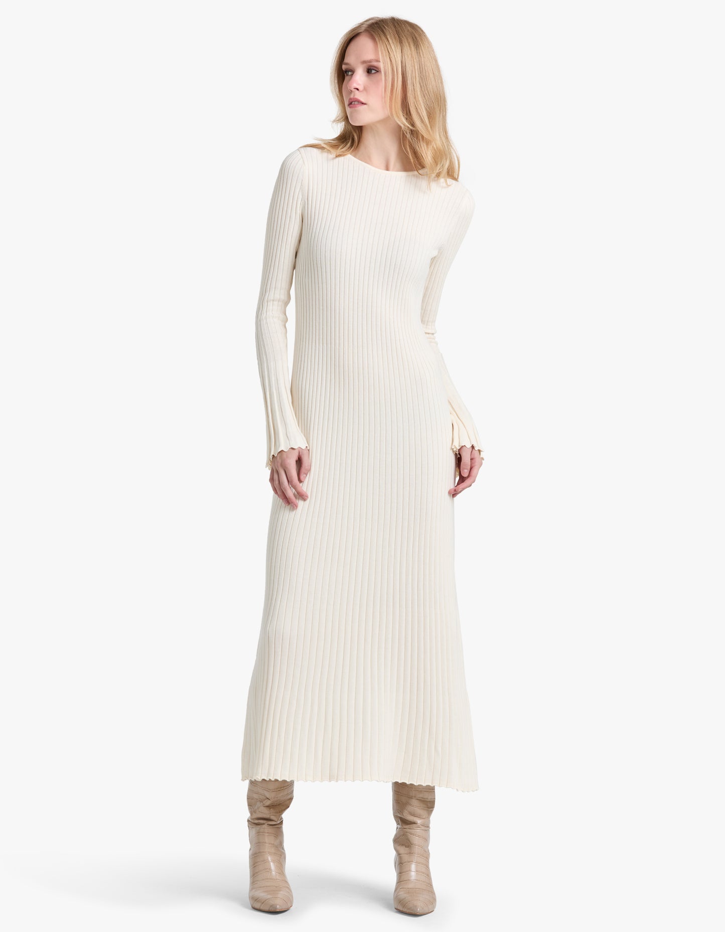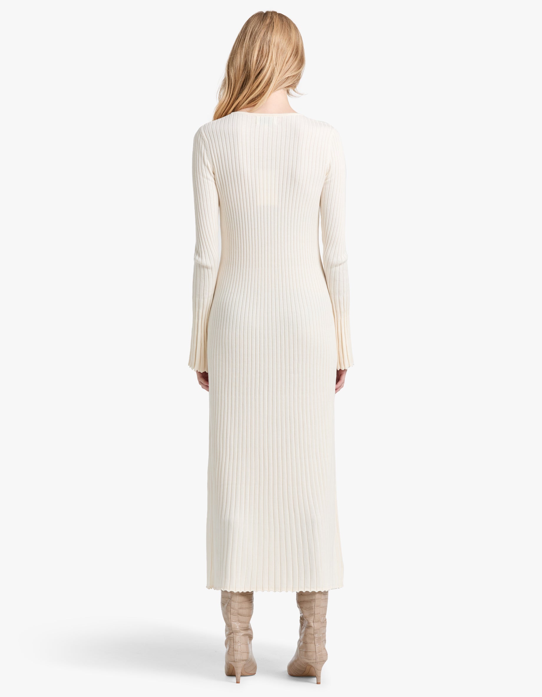 Crafted from breathable ribbed cotton for ultimate comfort. The minimalist design features a draped flare sleeve and textured ribbed knit. This easy-wear dress effortlessly transitions from desk to dinner, making it a versatile piece in any wardrobe. Elevate your style with the Cleo Dress in elegant cream.