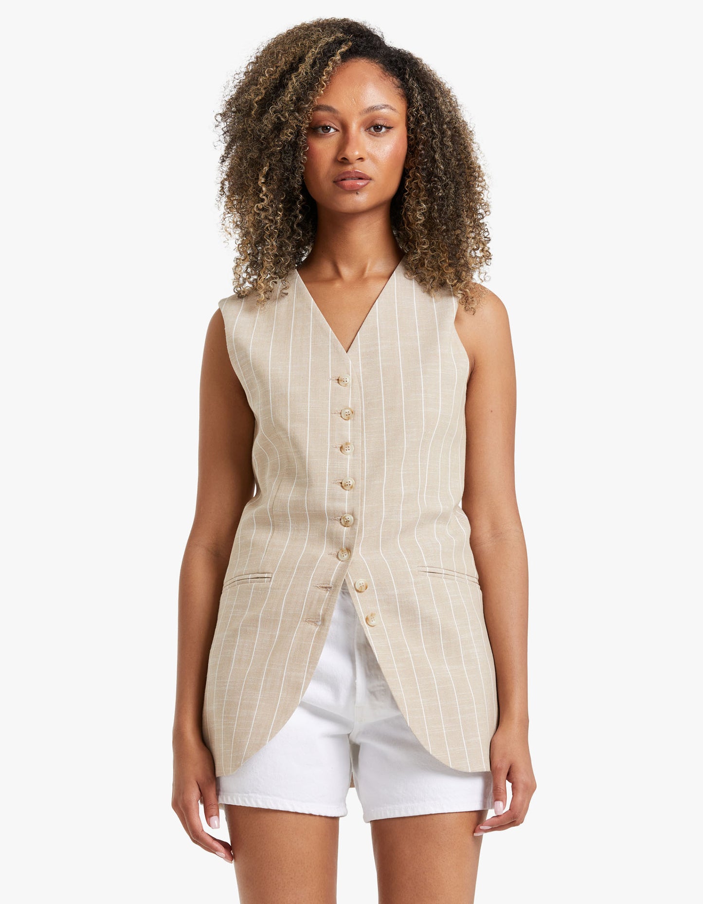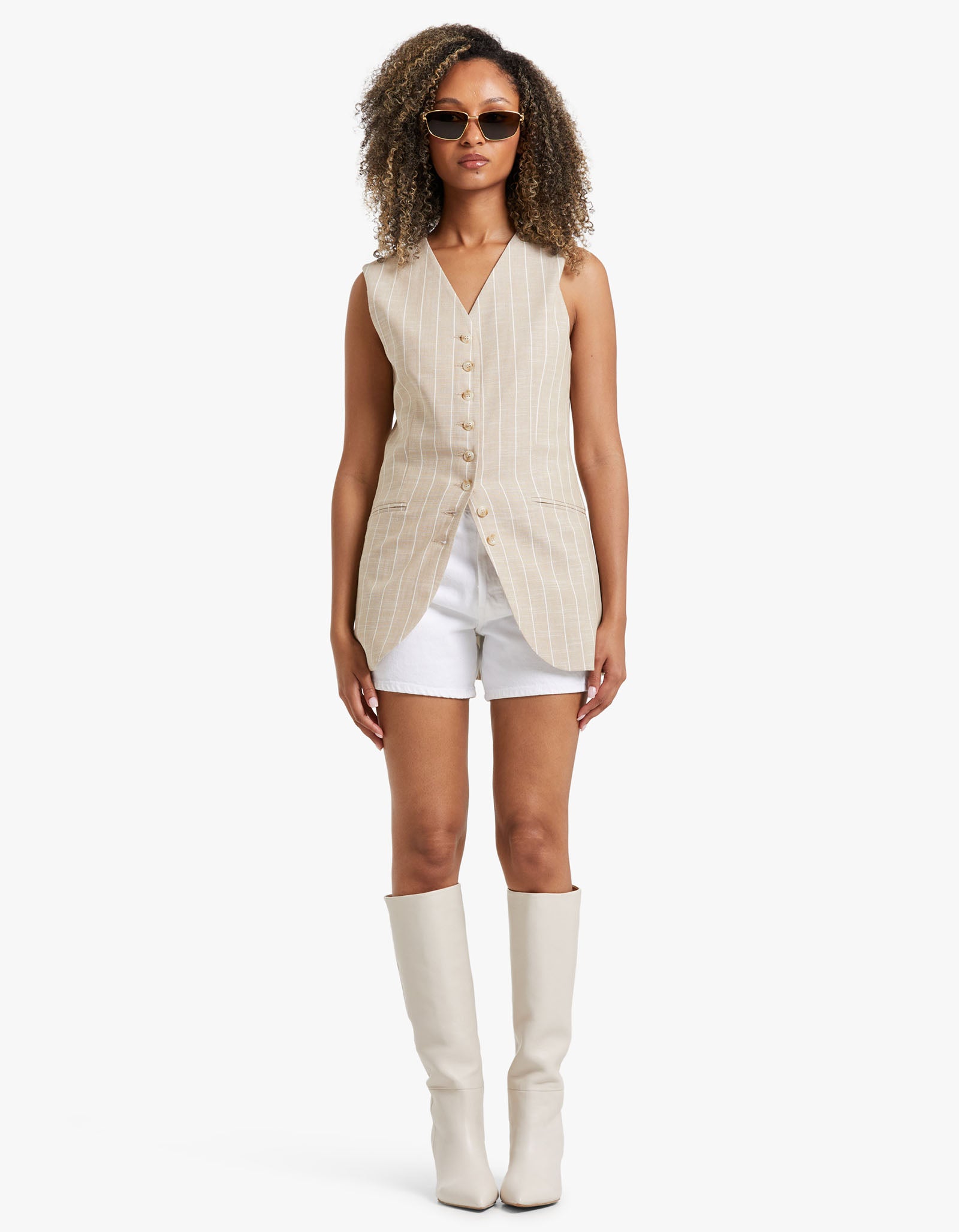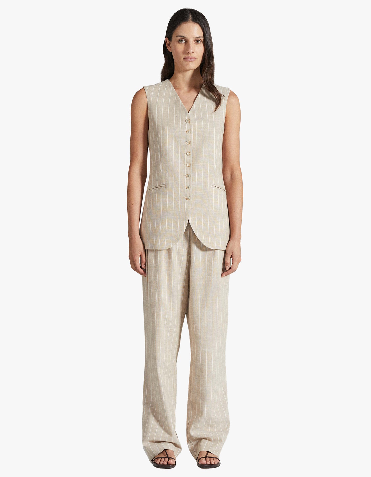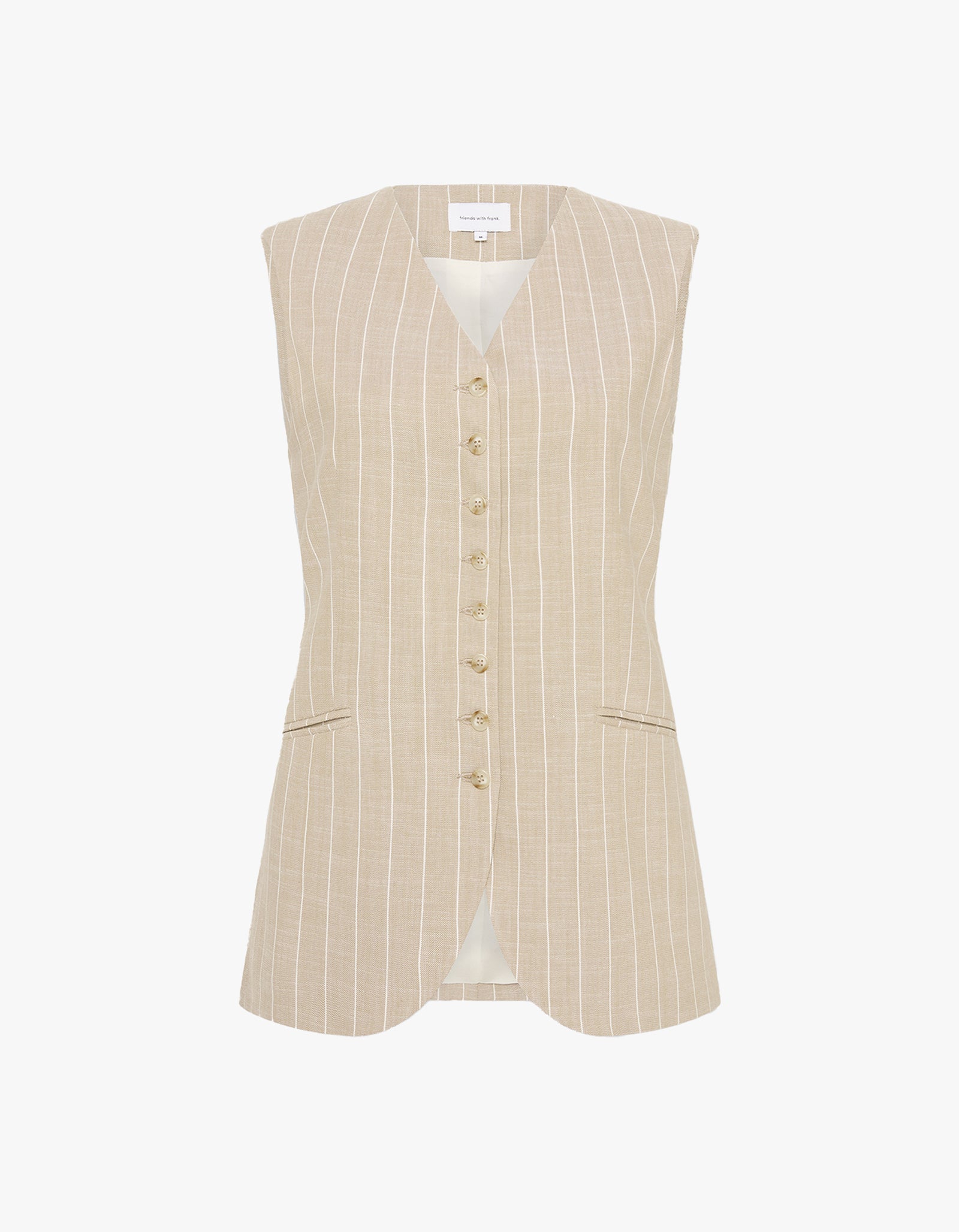 Notably neutral and expertly tailored, wear the Gabriel Vest from Friends With Frank as a standalone top, or in a coordinating set. Handcrafted in Melbourne, this vest is fully-lined, featuring a classic button up front and v-neckline. Complete the look with the coordinating Gabriel Trousers, for a relaxed take on summer suiting.