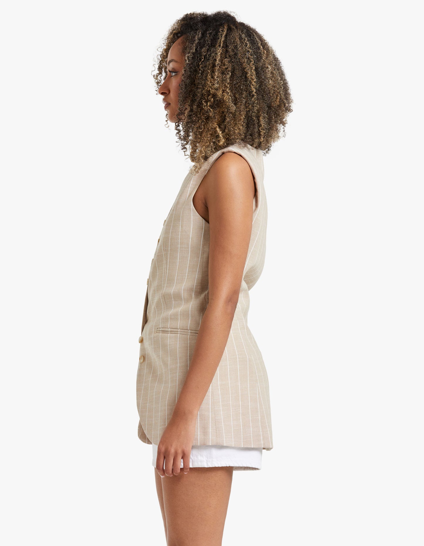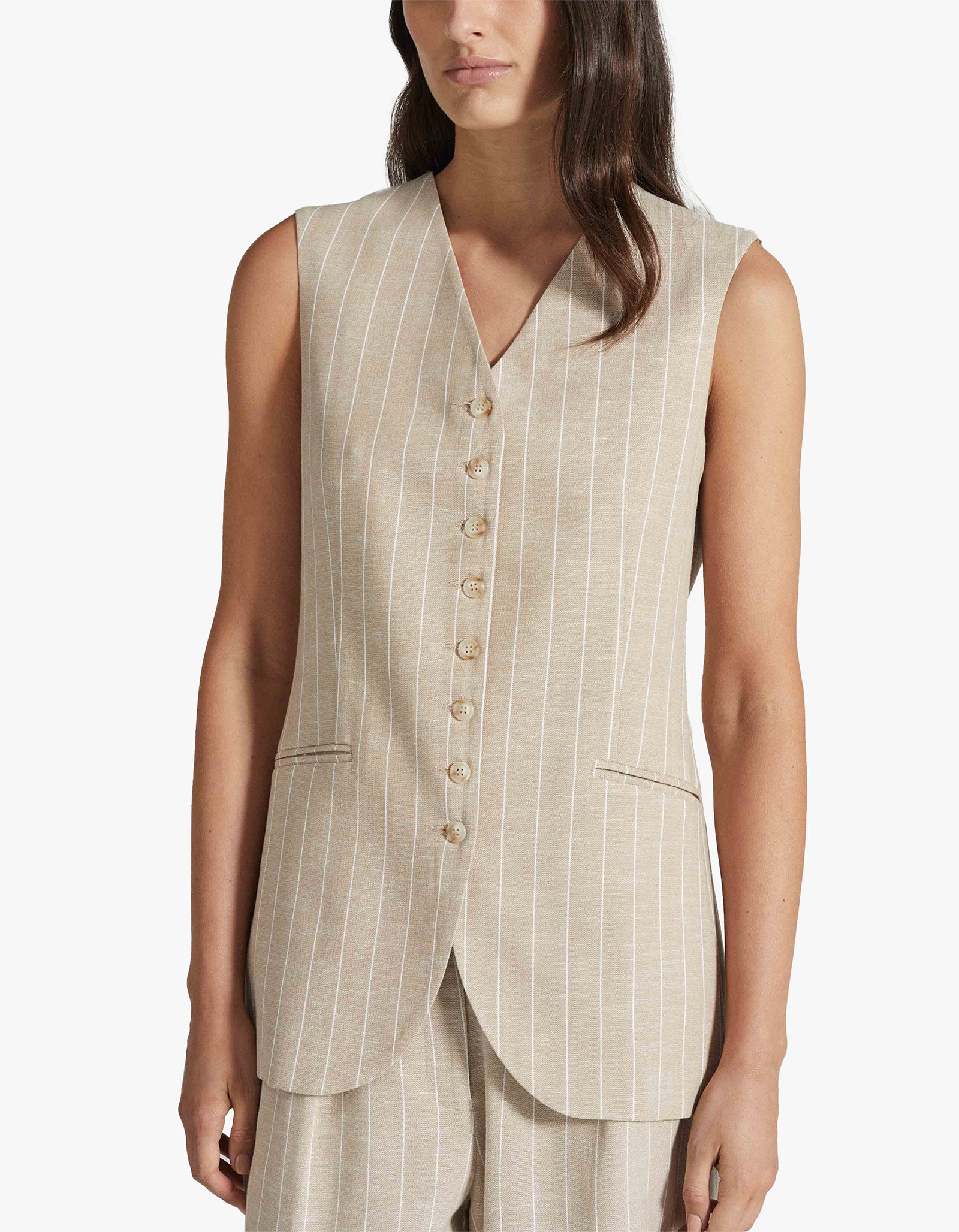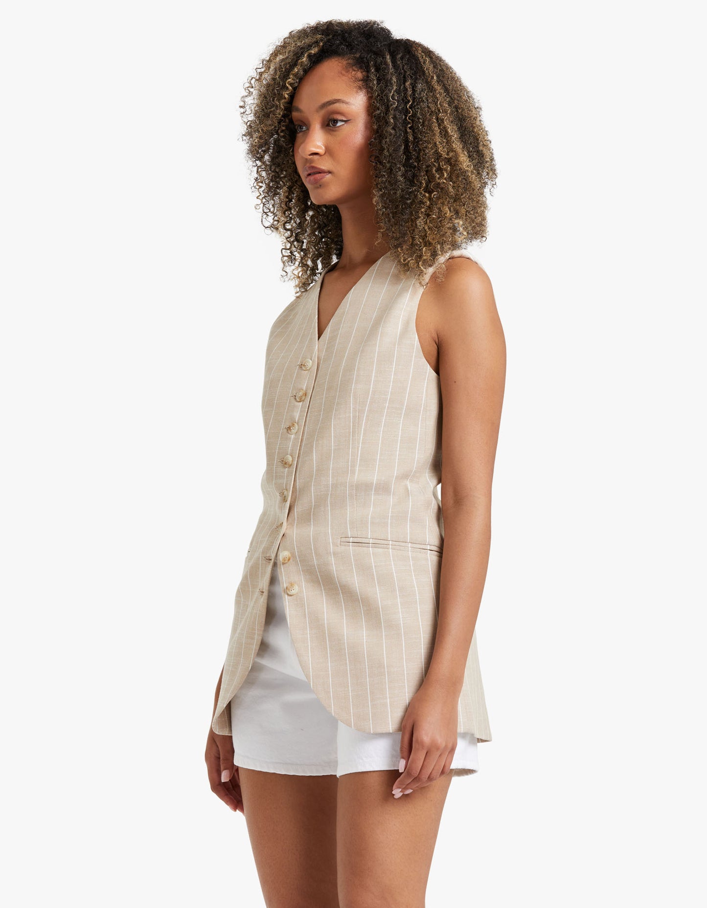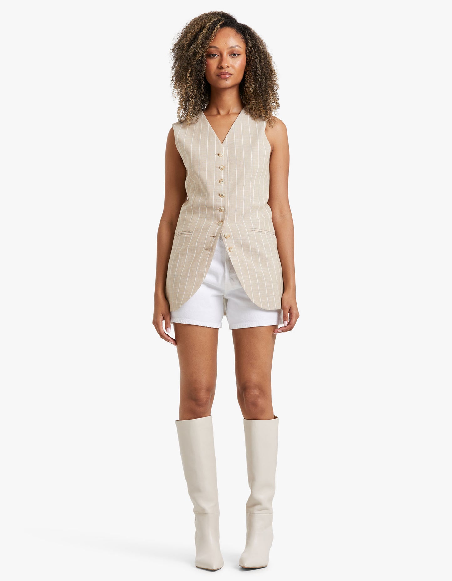 Notably neutral and expertly tailored, wear the Gabriel Vest from Friends With Frank as a standalone top, or in a coordinating set. Handcrafted in Melbourne, this vest is fully-lined, featuring a classic button up front and v-neckline. Complete the look with the coordinating Gabriel Trousers, for a relaxed take on summer suiting.