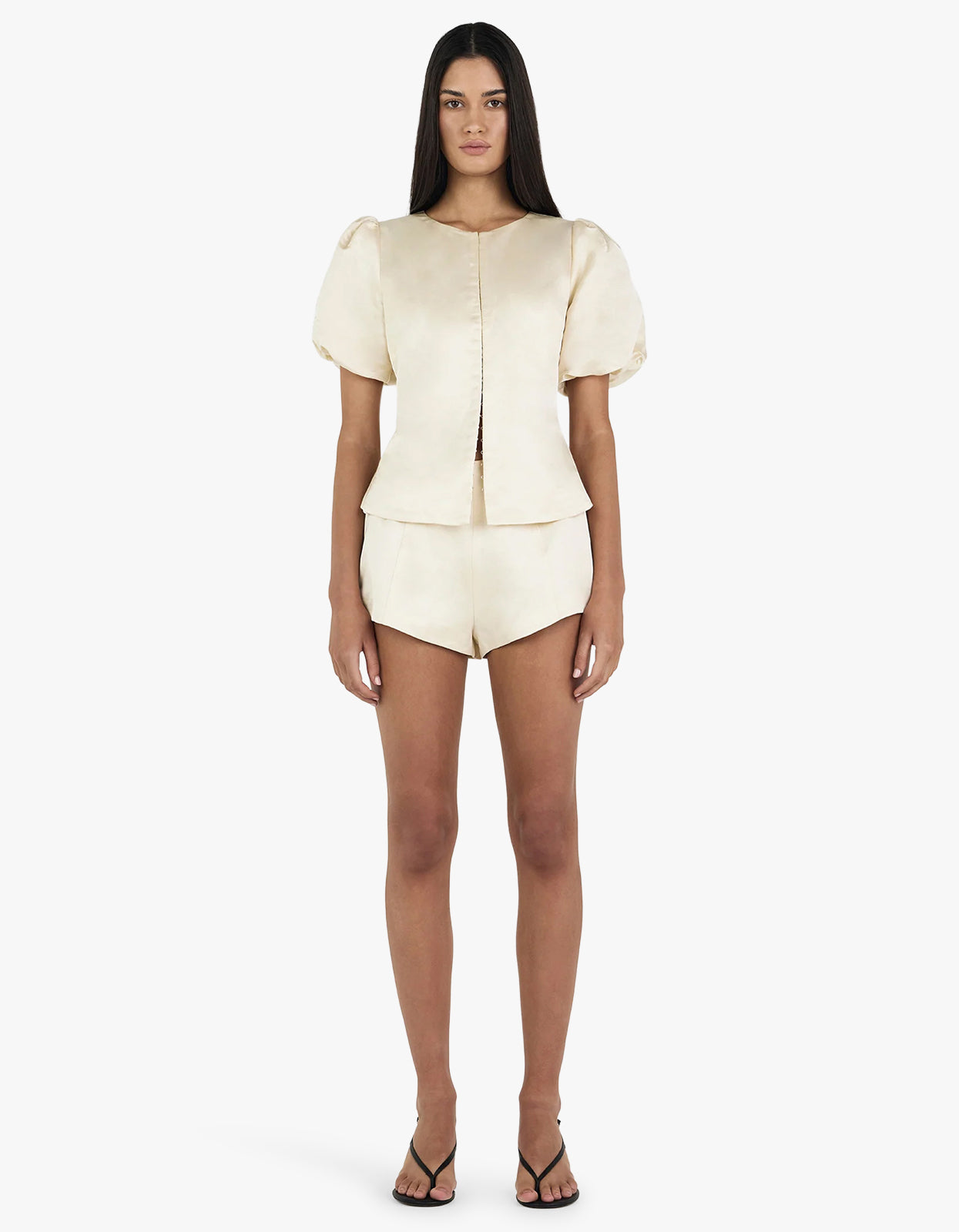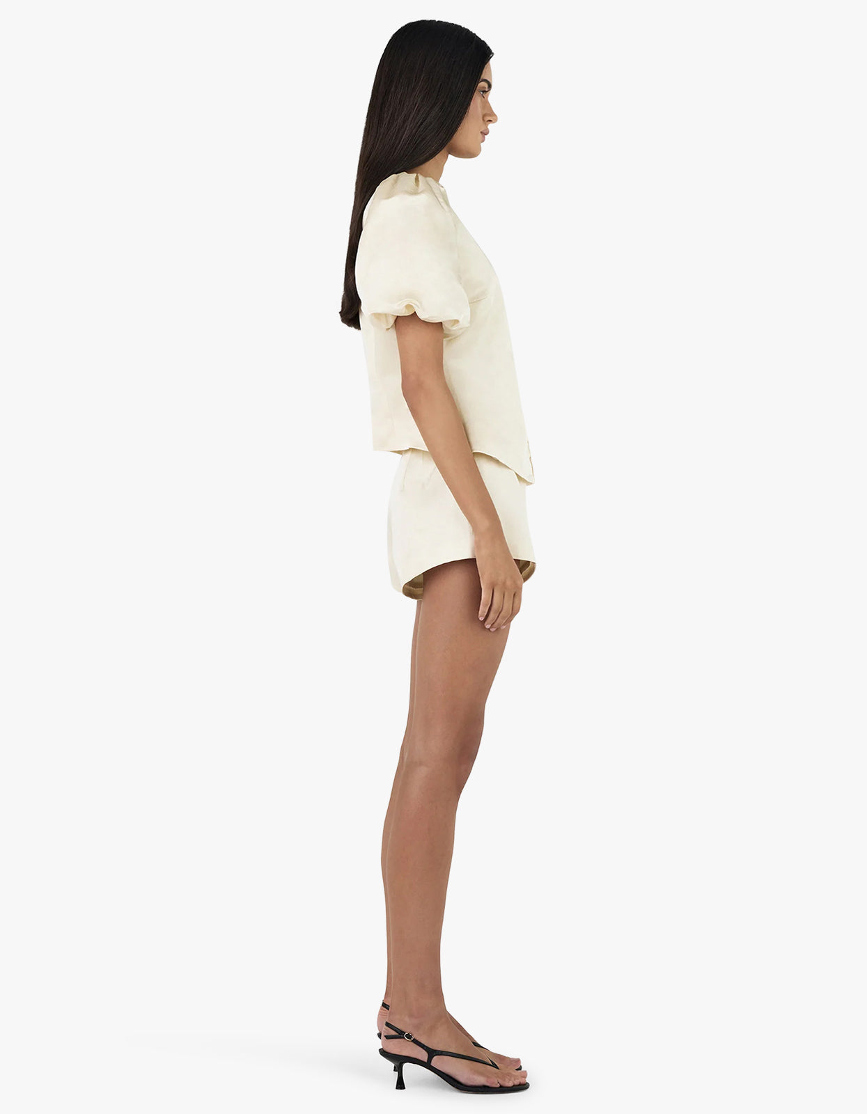 PearlEffortlessly chic. The Hansen & Gretel Jacquies Shortie is a wide leg mini short in luxurious pearl white, featuring flattering darts around the waist and a fully lined silhouette. These shorts sit at mid to high rise with a fitted waist, perfect for pairing with the matching Pellegrino top for a sophisticated tonal set.