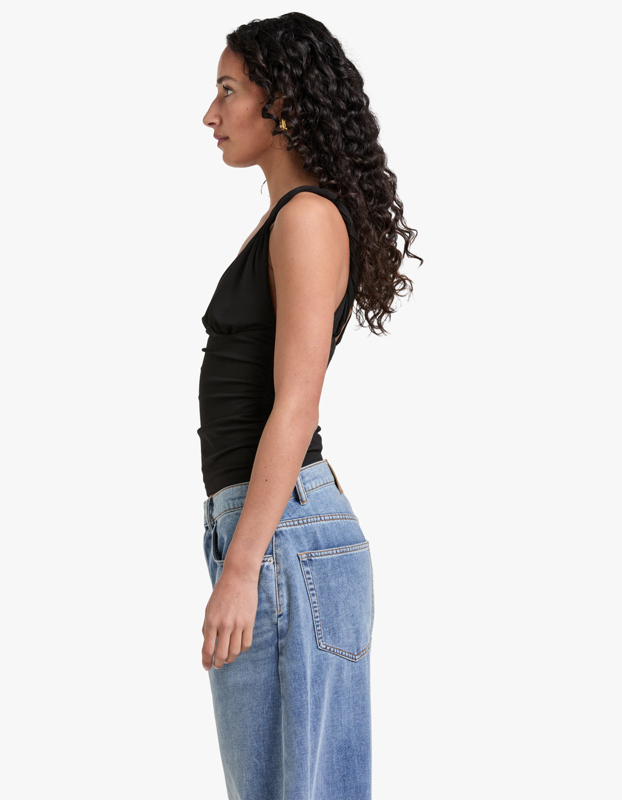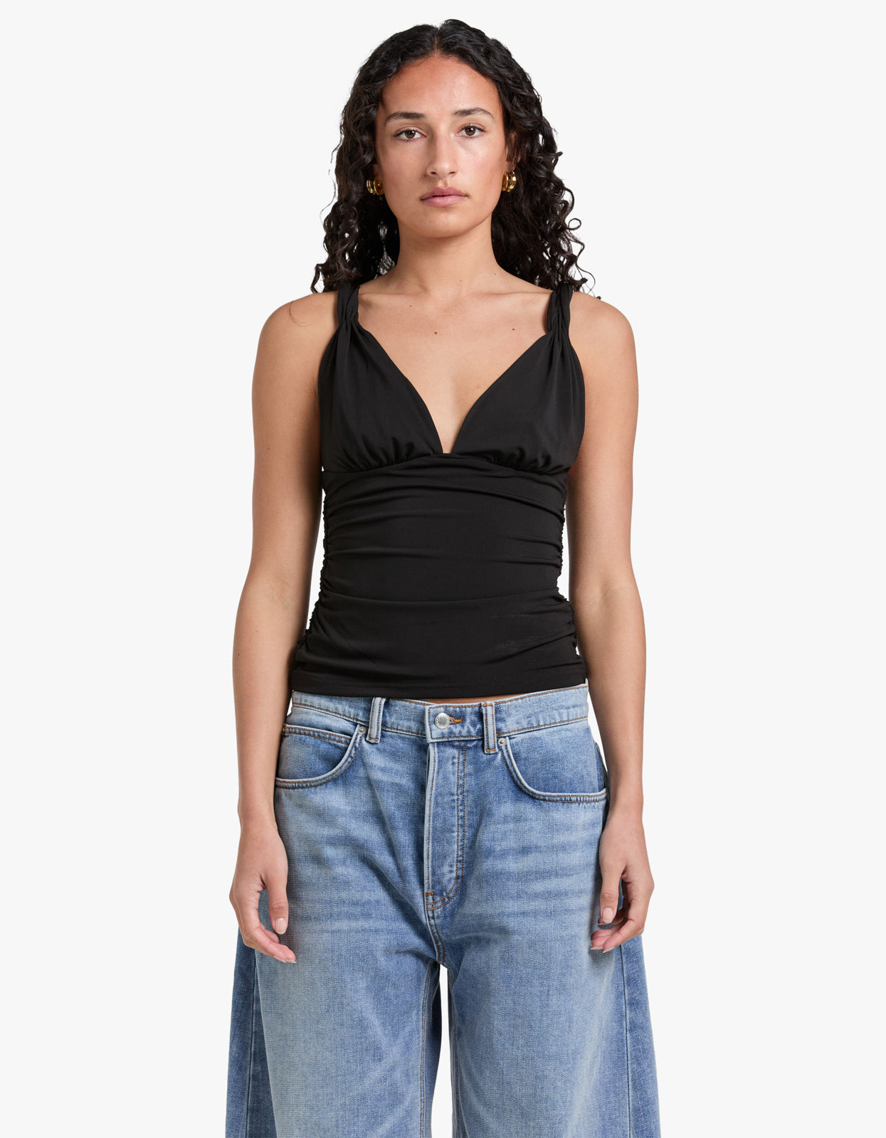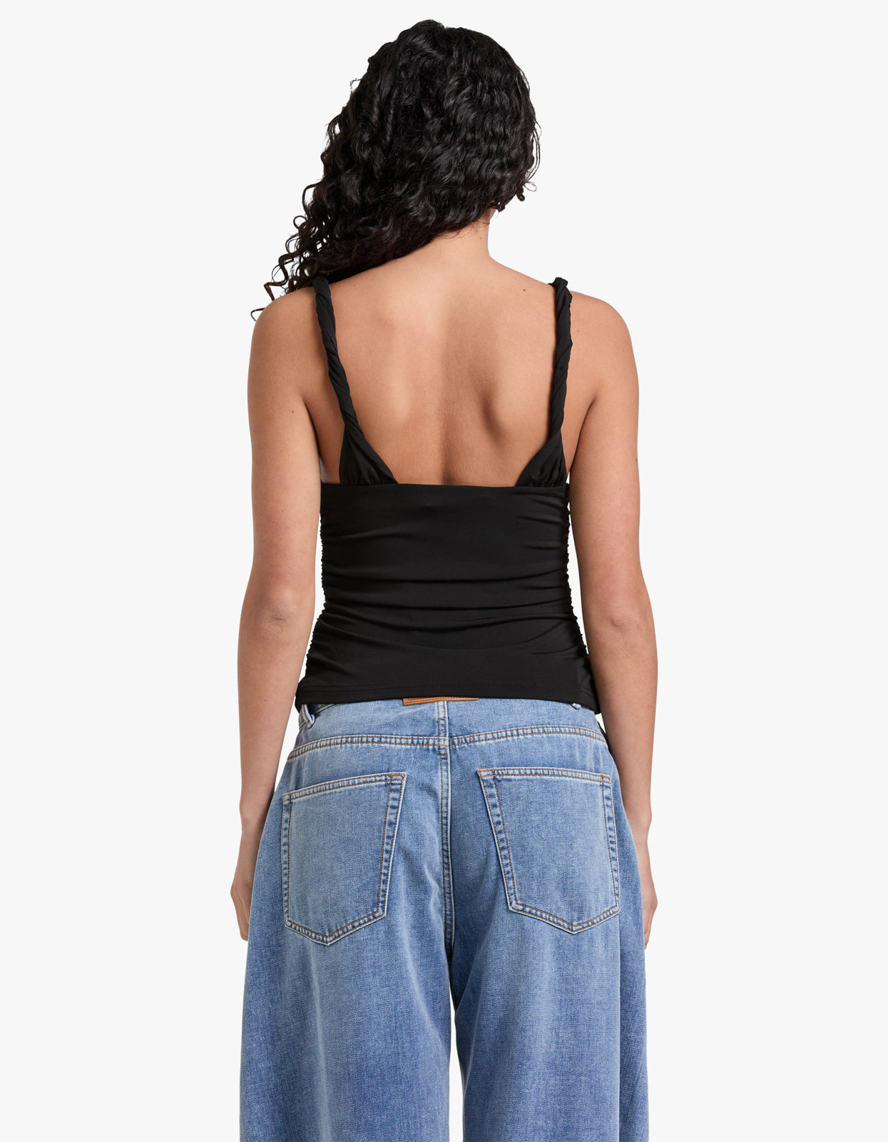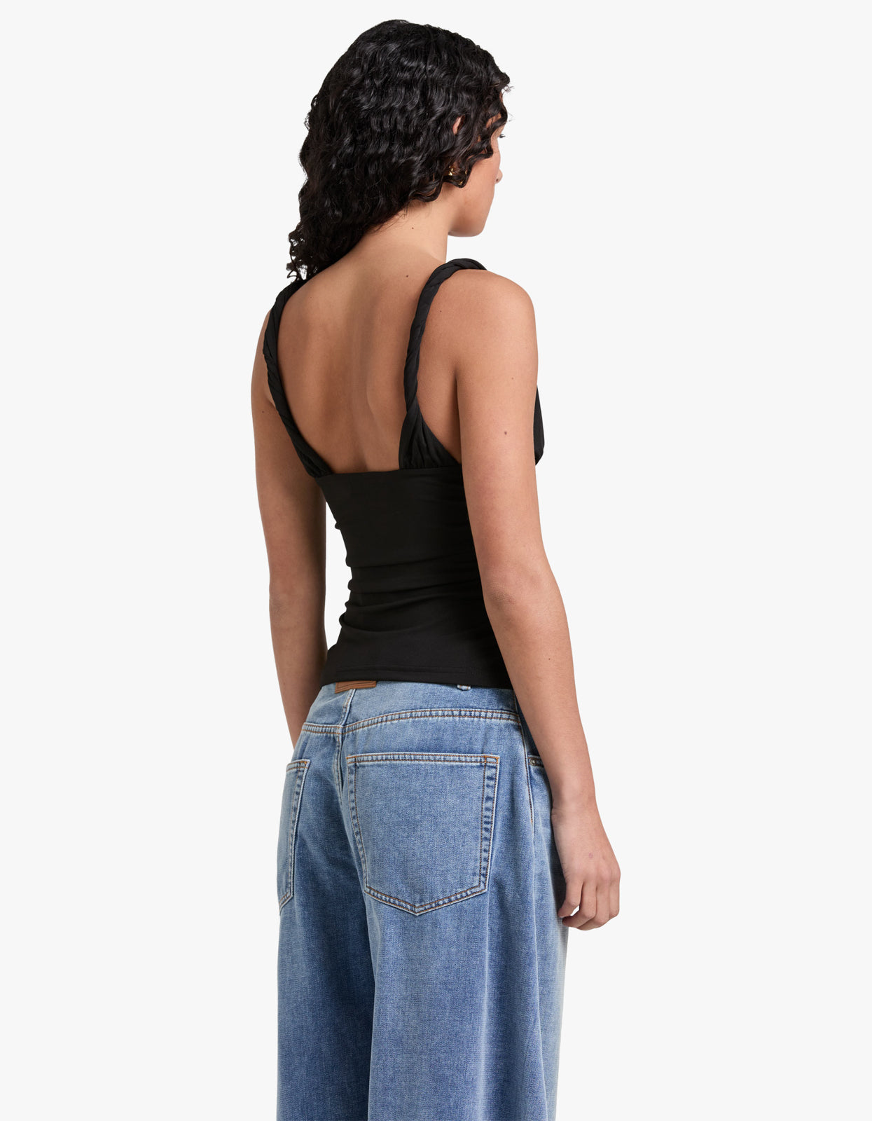 This tank boasts twisted shoulder detailing and a low back design, making it the perfect addition to any wardrobe. With expert craftsmanship and sleek style, this tank is a must-have for any fashion-forward individual.