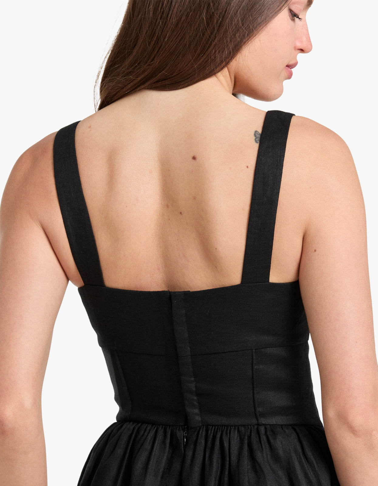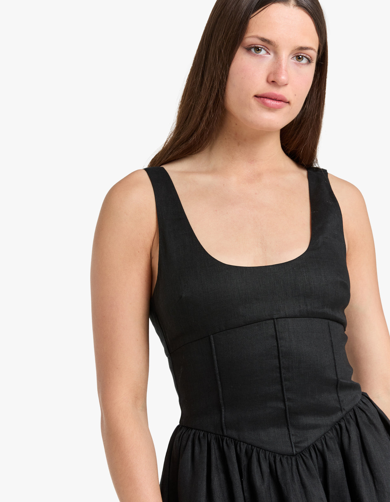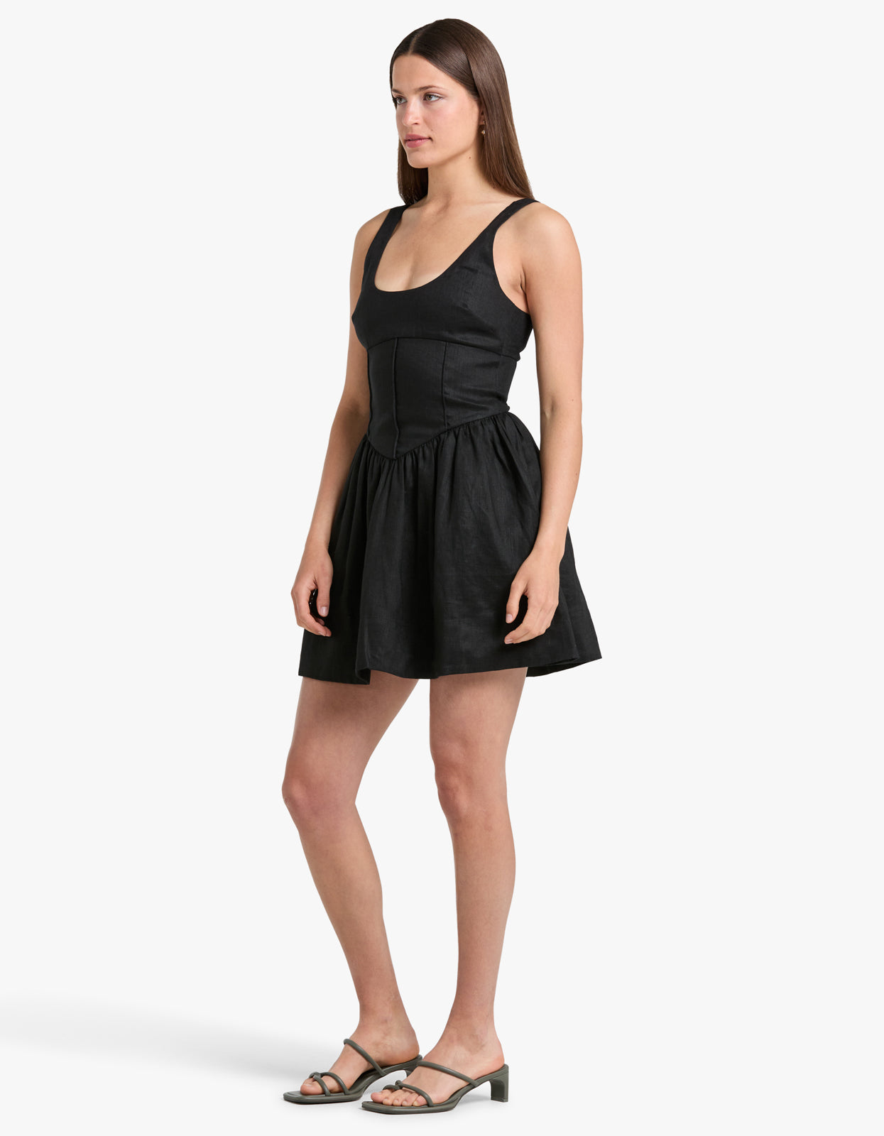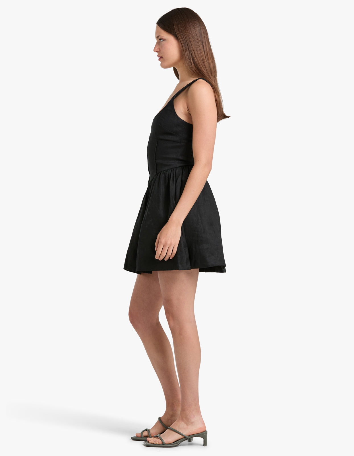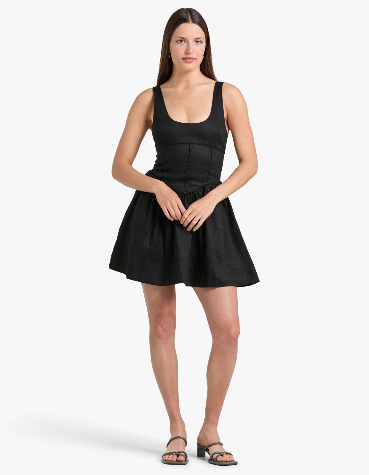This black mini dress features a gathered skirt with a full hemline, a scoop neckline, and convenient side seam pockets.