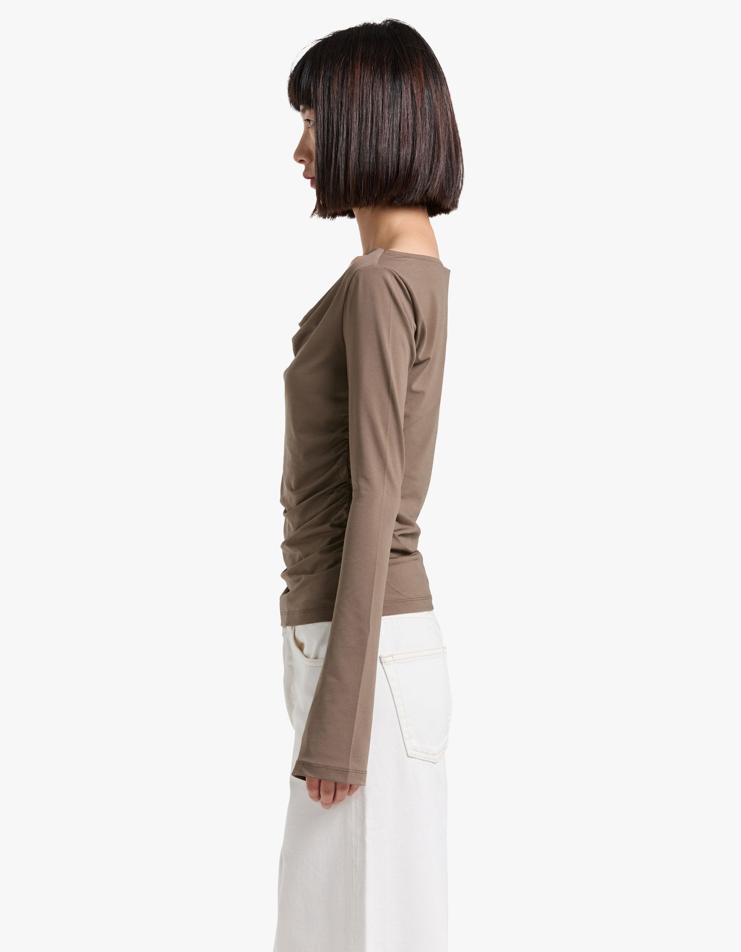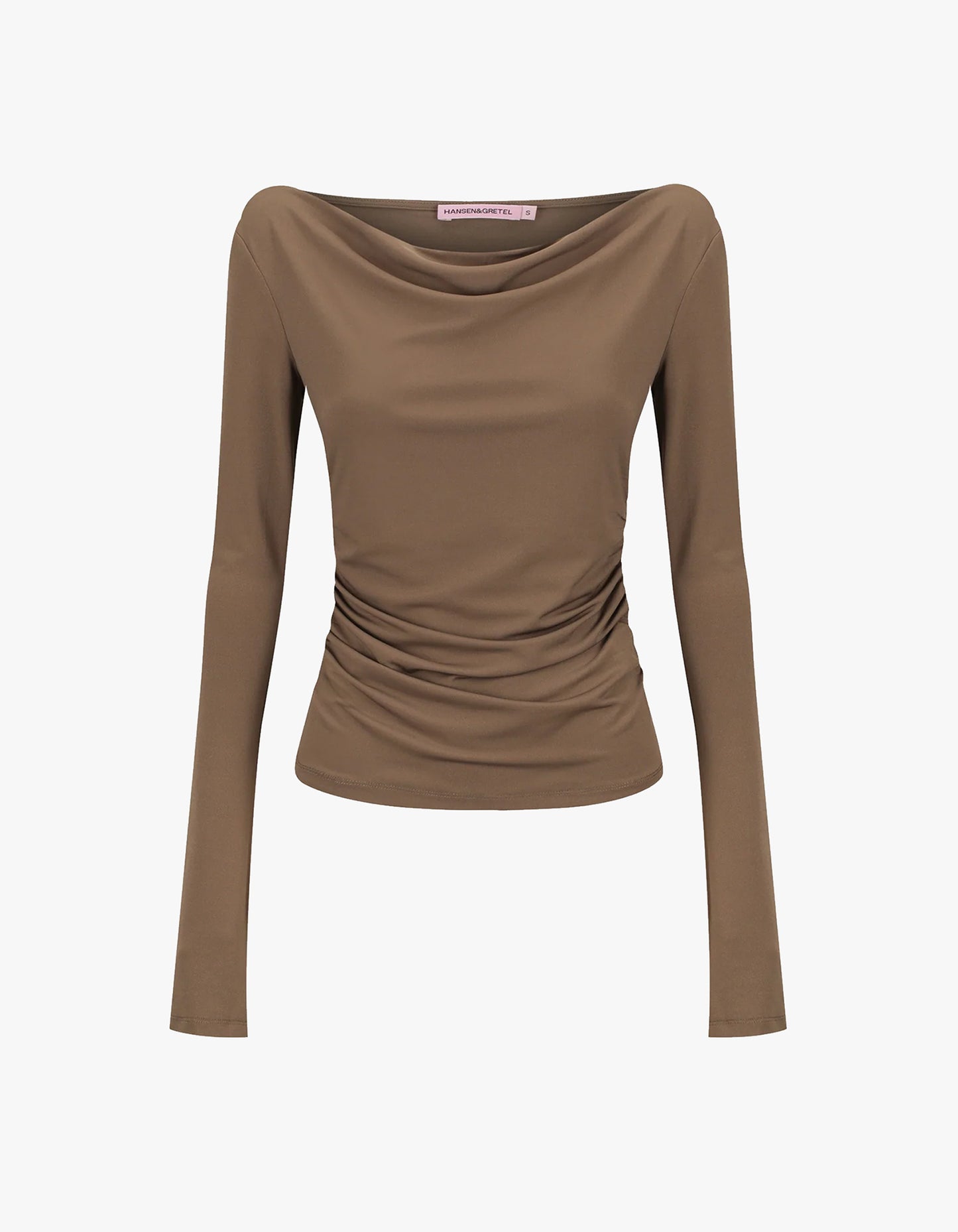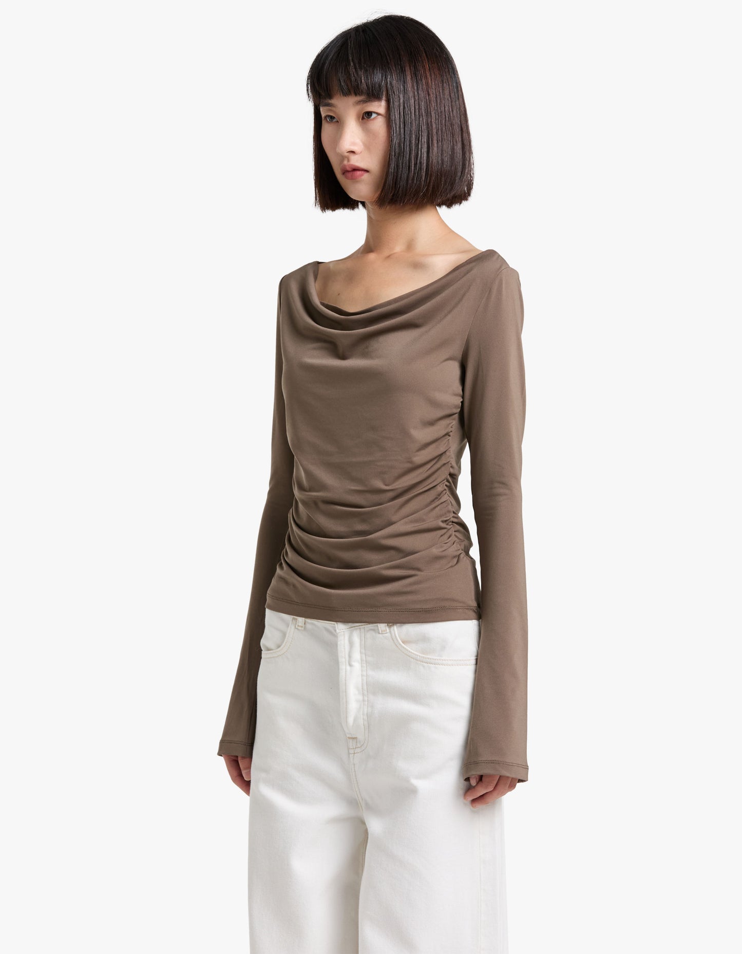 A long sleeve design fabricated in H&G's signature recycled polyester jersey, this day-to-night options features a cowl neckline with light gathering through the waist.