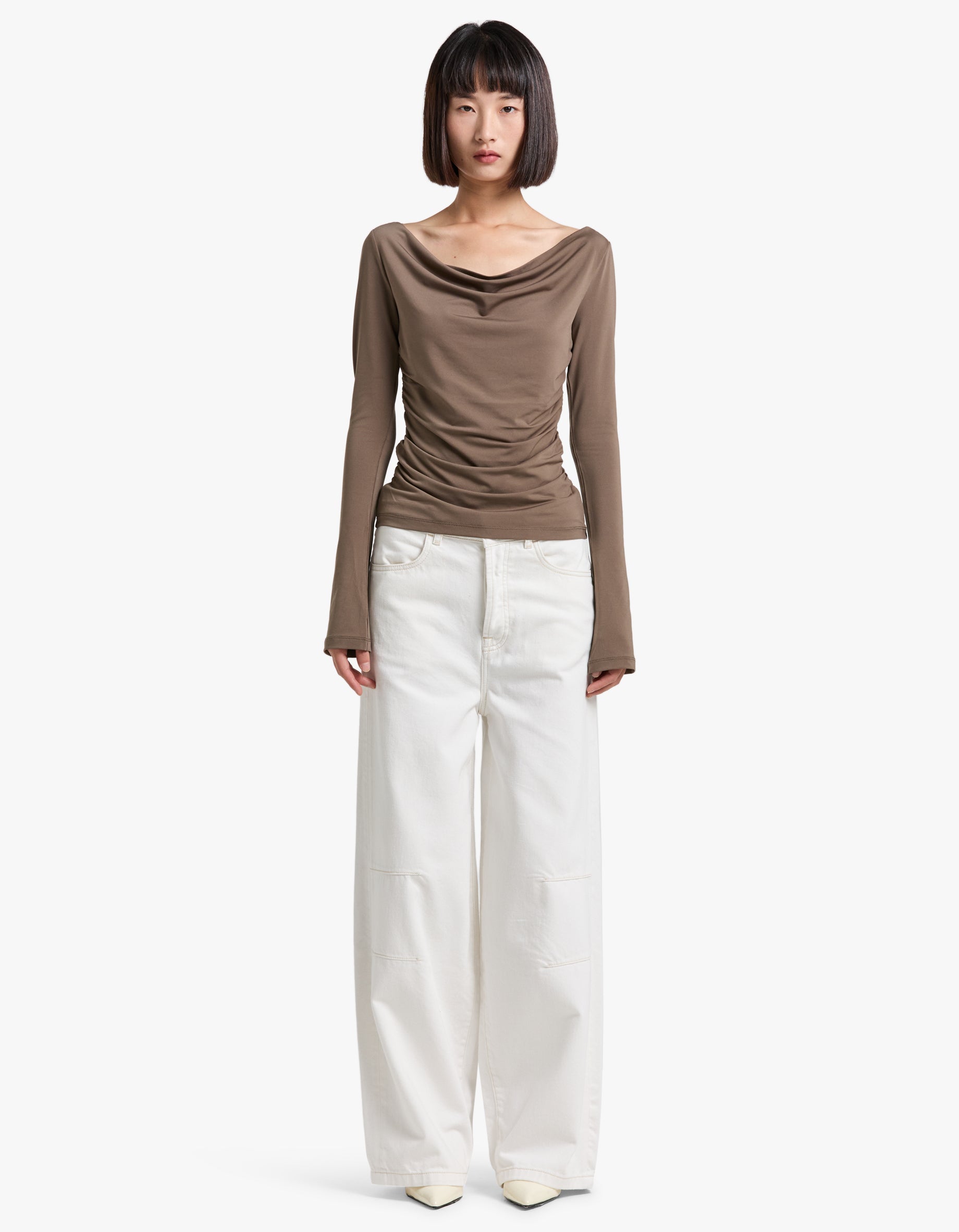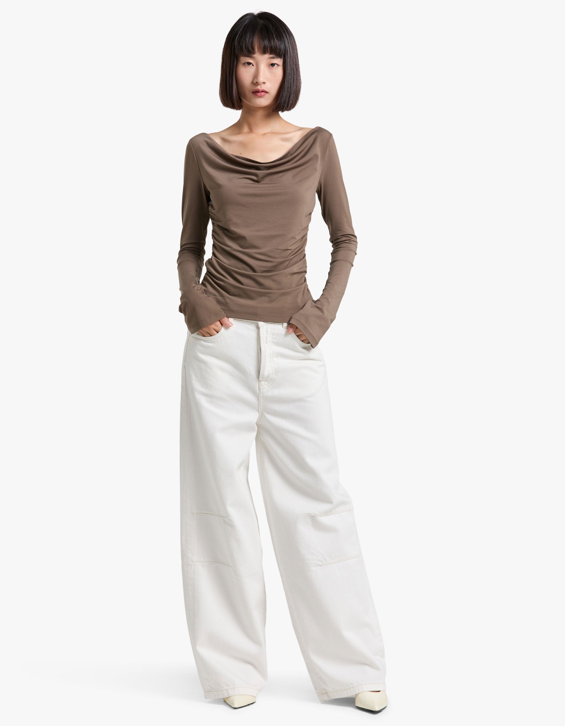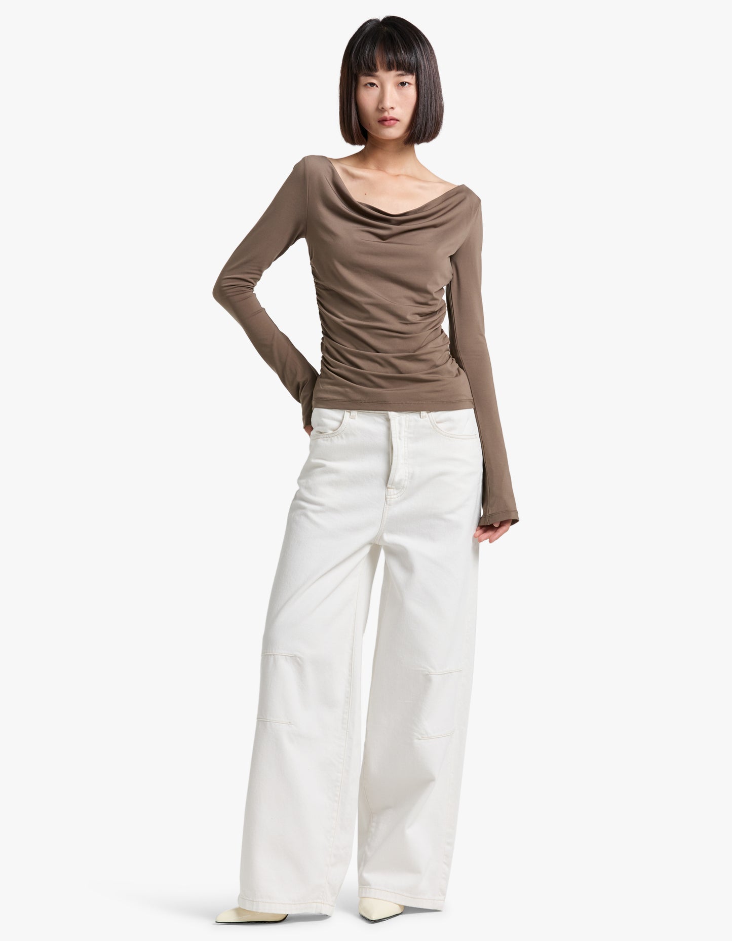 A long sleeve design fabricated in H&G's signature recycled polyester jersey, this day-to-night options features a cowl neckline with light gathering through the waist.