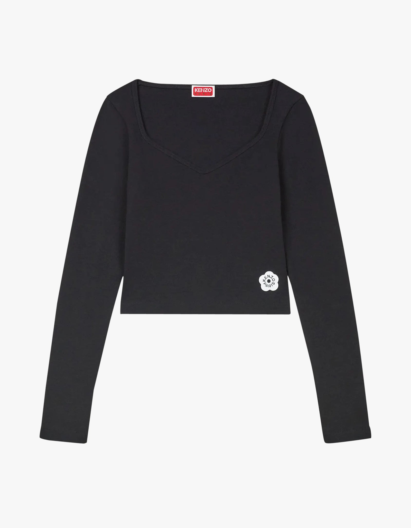 This black top features a scoop neckline and a slightly cropped design for a figure-flattering fit. The straight hemline adds a touch of elegance, while the delicate 'Boke' flower embroidery and Kenzo logo at the right side exudes sophistication.