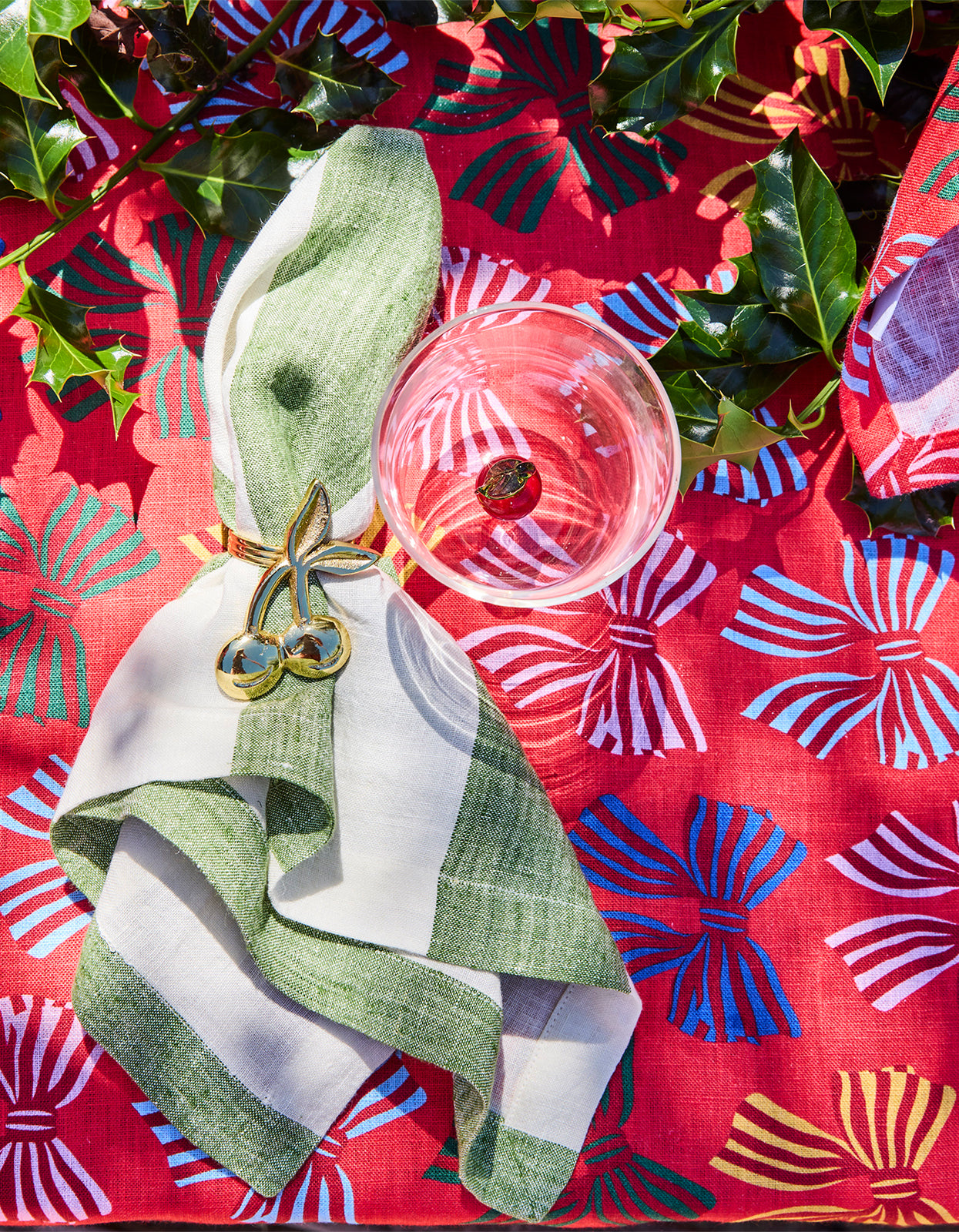 Bring a touch of playful elegance to your table setting with the Cherry Pie Brass Napkin Rings by Kip and Co.