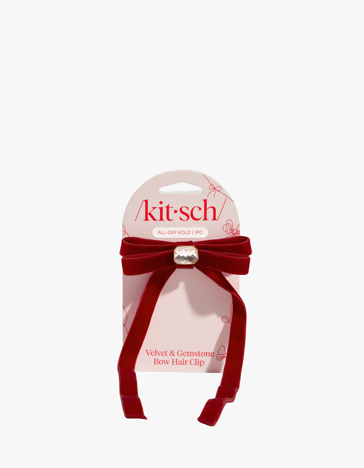 The Velvet & Gemstone Bow Hair Clip from Kitsch is your new favourite accessory that adds a luxurious touch to your hairstyle. Crafted from rich red velvet and adorned with sparkling gemstones, it’s the perfect statement piece for both everyday style and festive occasions.