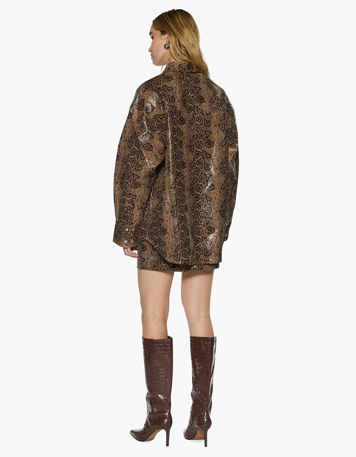 Cut from printed snakeskin faux leather, this oversized shirt features western-inspired yoke panels, a curved hemline, exaggerated cuffs, and pearl snap closures. Finished with Ksubi’s signature T-box stud for an elevated edge.