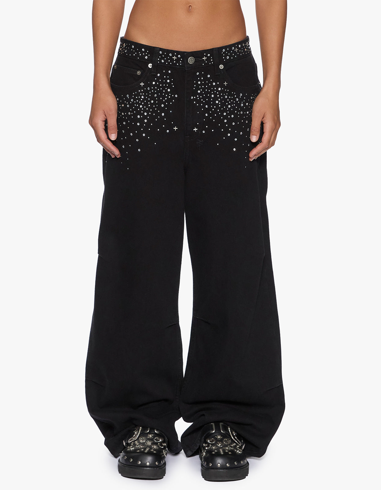Cut in an exaggerated wide-leg silhouette, these statement-makers feature silver stud embellishments across the hips for a dose of rock ‘n’ roll attitude. Finished with Ksubi’s signature branding, they’re the ultimate mix of rebellious edge and high-fashion flair— ready to steal the spotlight day or night.