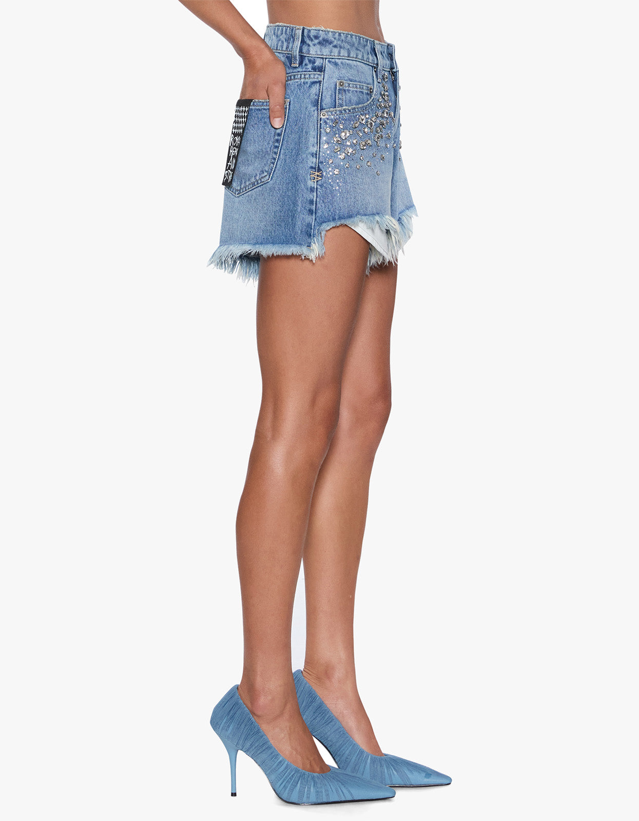 This elevated denim piece showcases a high-waisted A-line silhouette with a relaxed mid-thigh leg and signature stepped, frayed hem. Constructed from premium European rigid denim in a versatile mid-blue wash, it features authentic distressing and subtle grinding details throughout. The classic five-pocket design is elevated with hand-applied diamante studs and rhinestones clustered around the front pocket bearers, creating an understated yet striking embellishment.