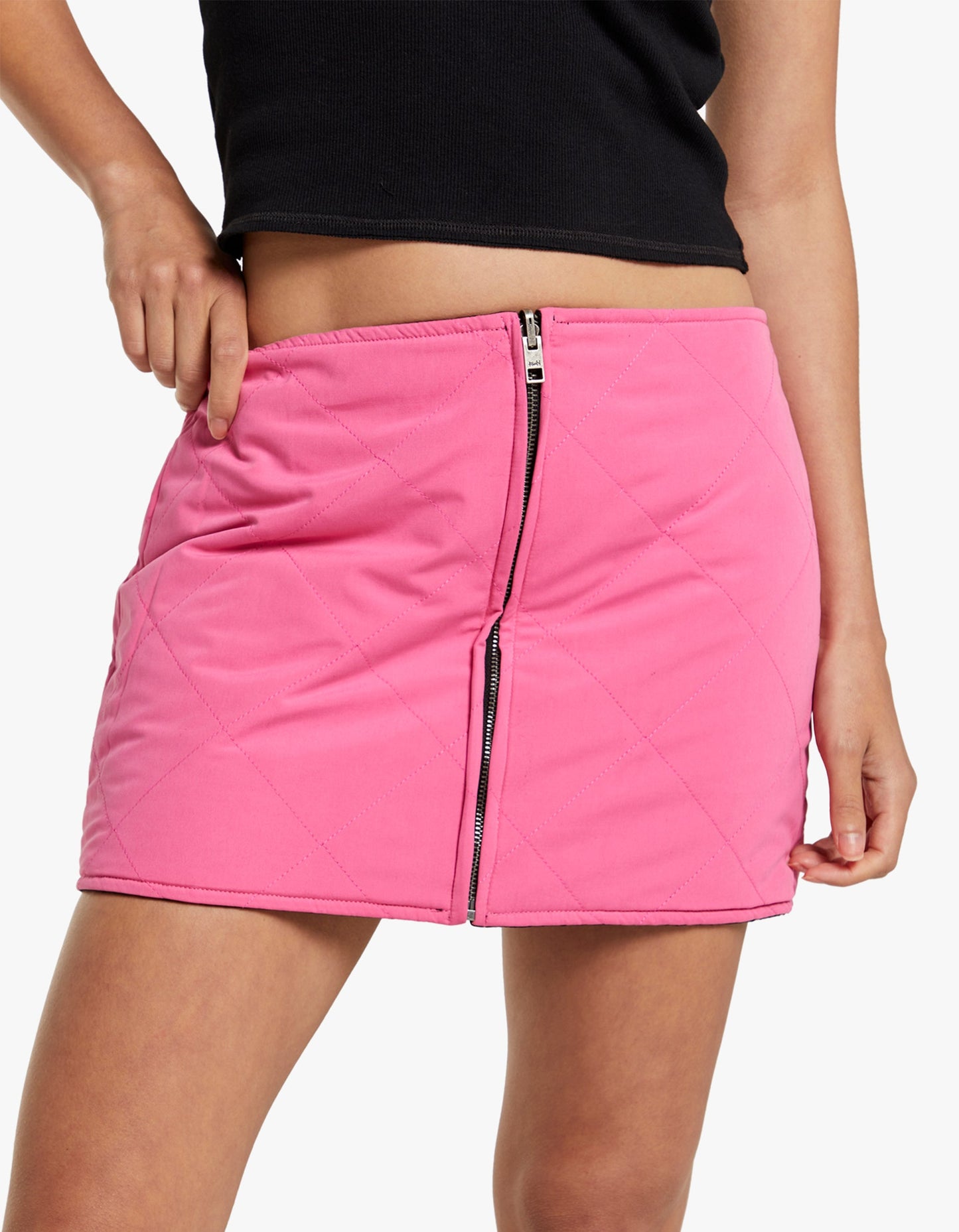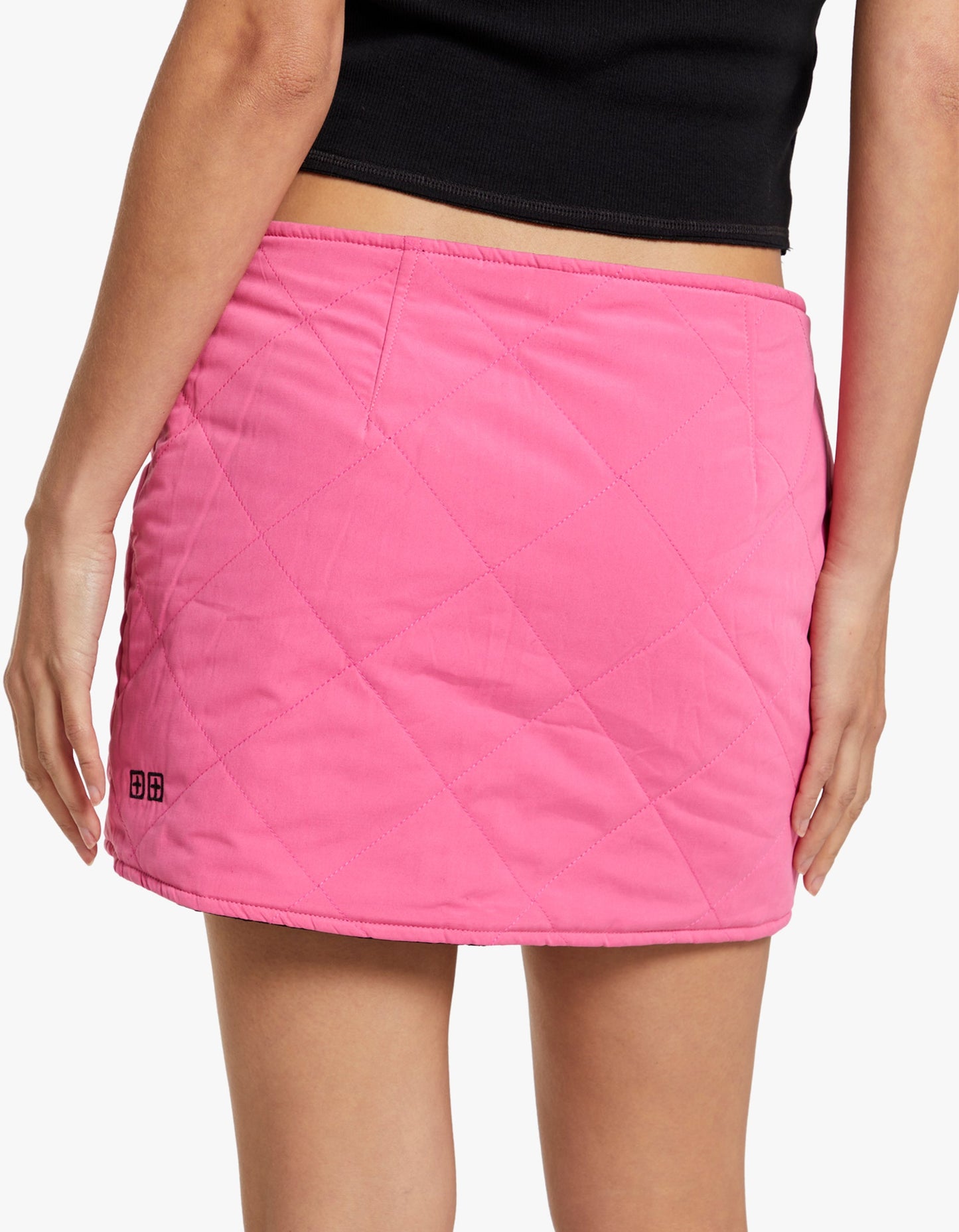 Mini skirt Black and pink colourway Quilted topstitching design all over Mid rise Zip closure down the front Pipping finish Straight hemline Regular fit Style guide: Team with a black tee and flip to your desired colour option