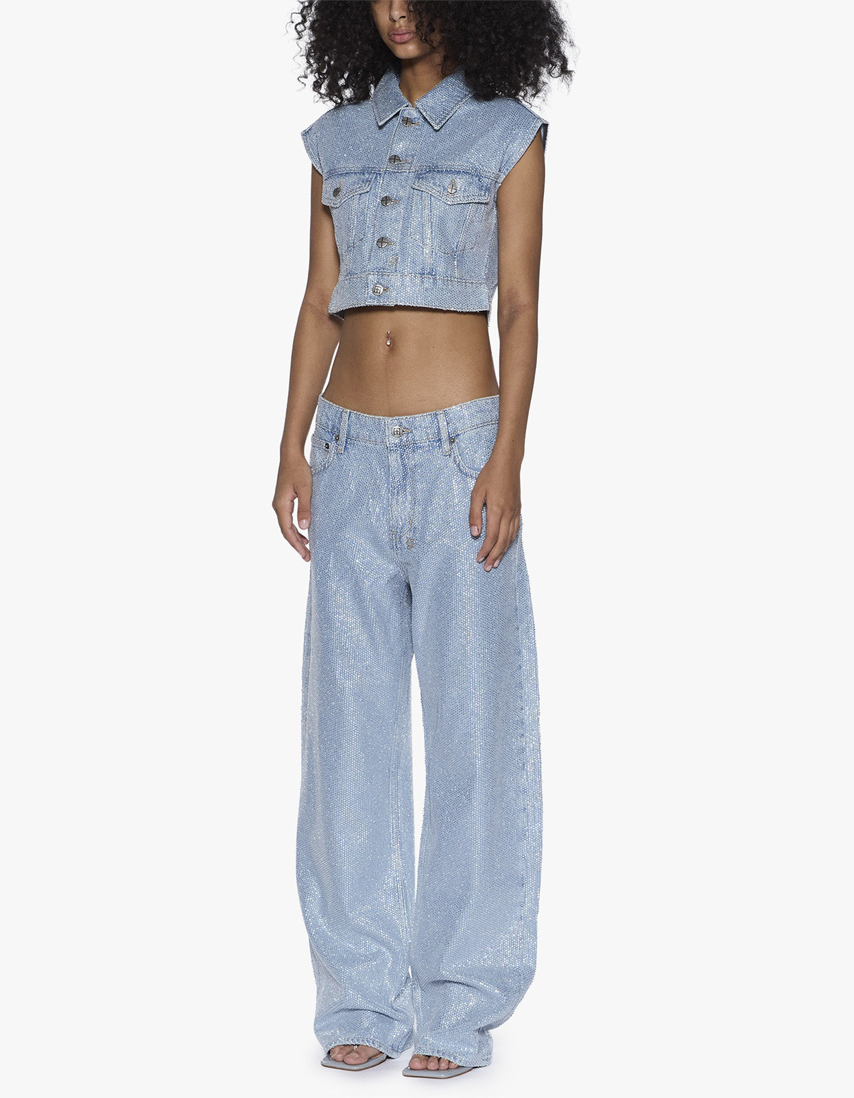 This trucker vest is crafted from rigid denim in a light blue wash with an enzyme soft finish, densely embellished with hotfix crystals that catch the light from every angle. It's the perfect piece to elevate your denim collection with statement-making style.