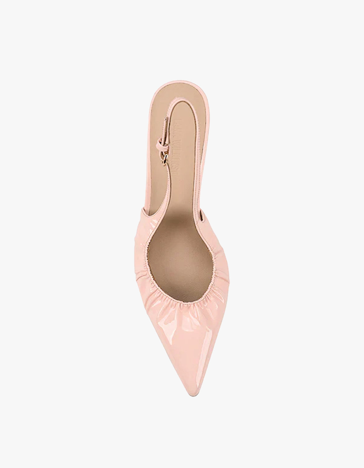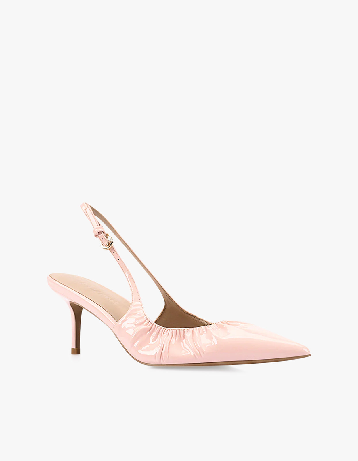 Crafted in glossy blush pink patent leather, this slingback is finished with delicate ruching across the toe and a softly curved stiletto heel. The subtle shine and feminine hue make it a go-to for weddings, events, or simply elevating your everyday look.