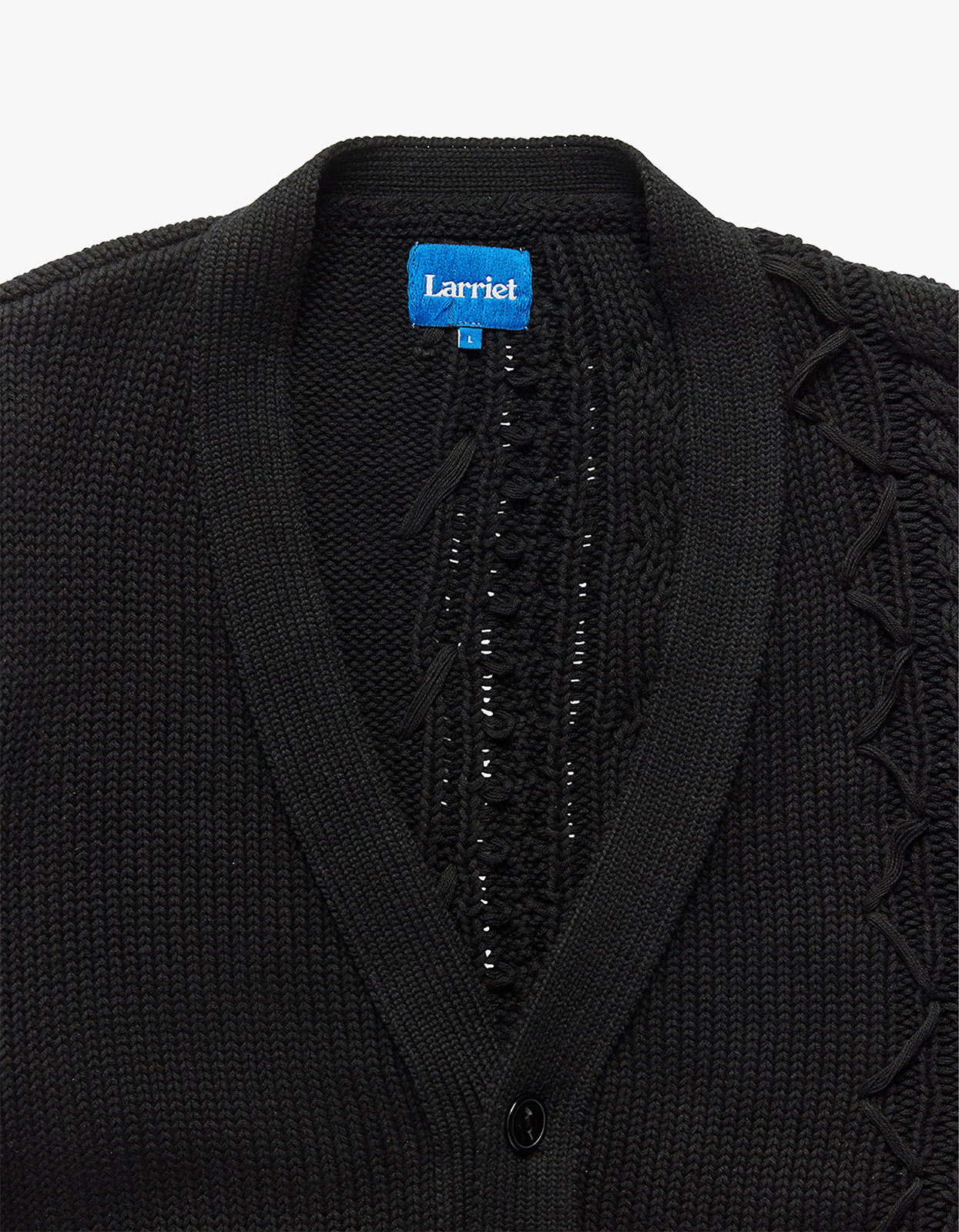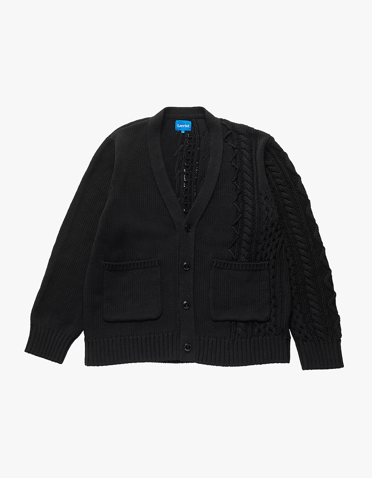 Introducing the Merge Cardigan by Larriet, a masterpiece that combines two knit styles for a unique, sophisticated look.