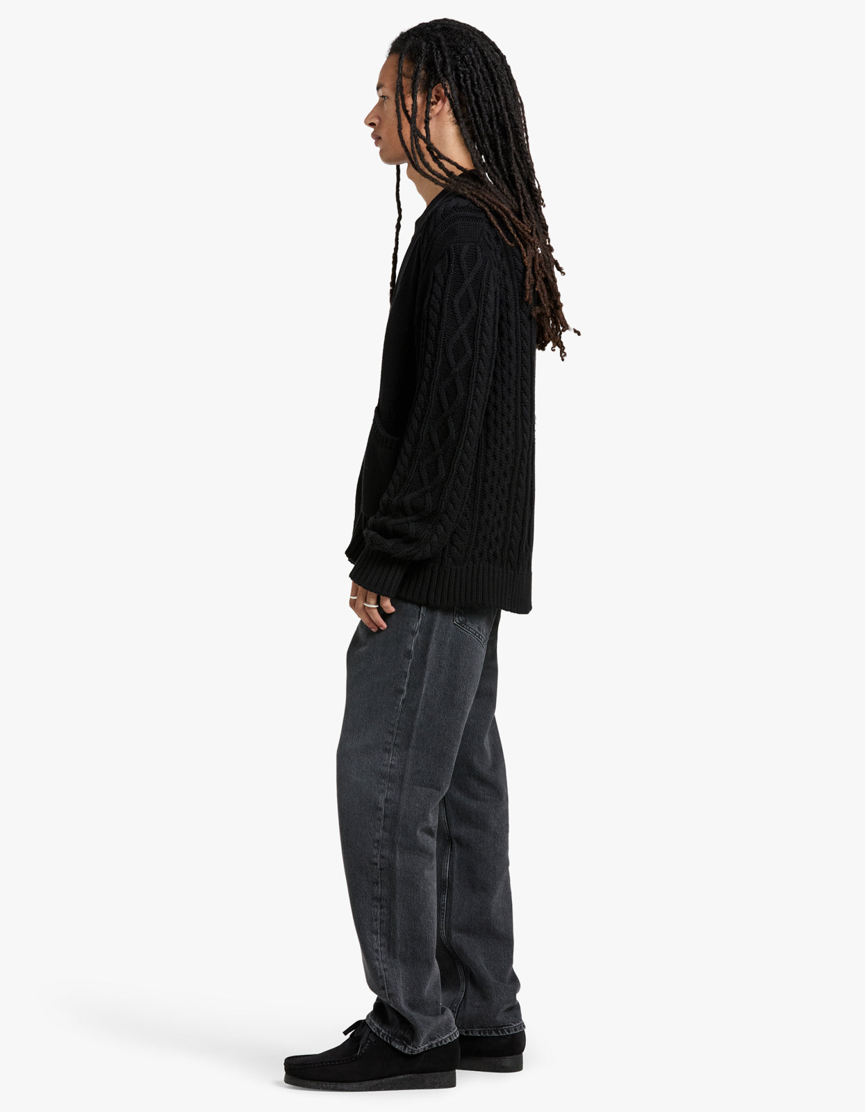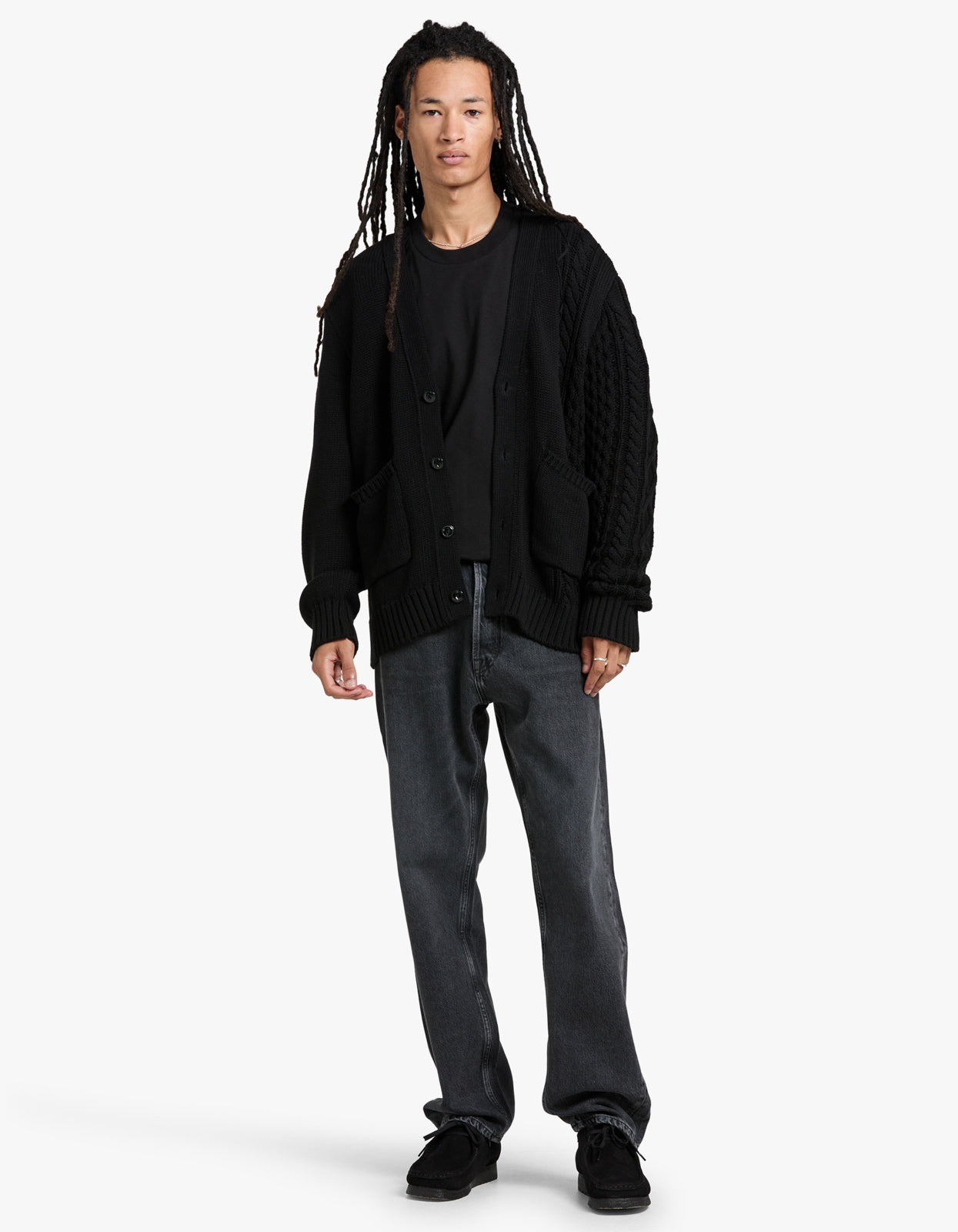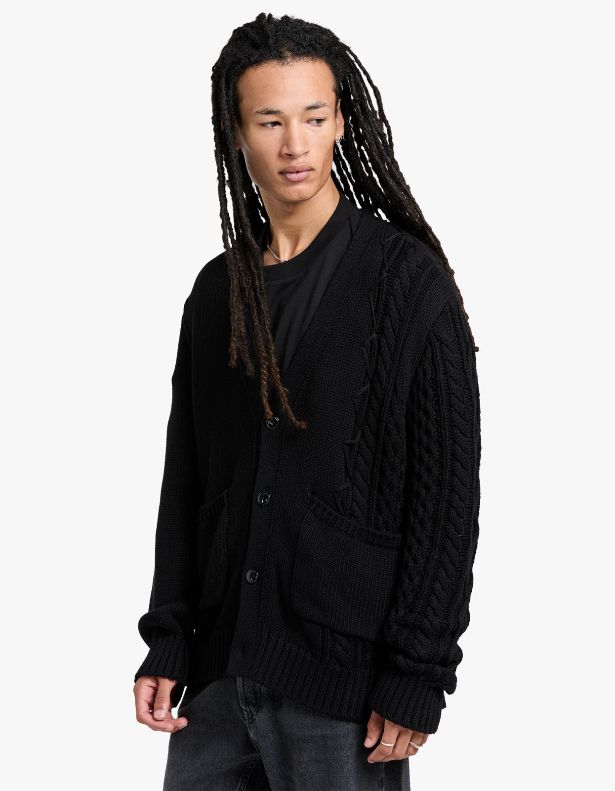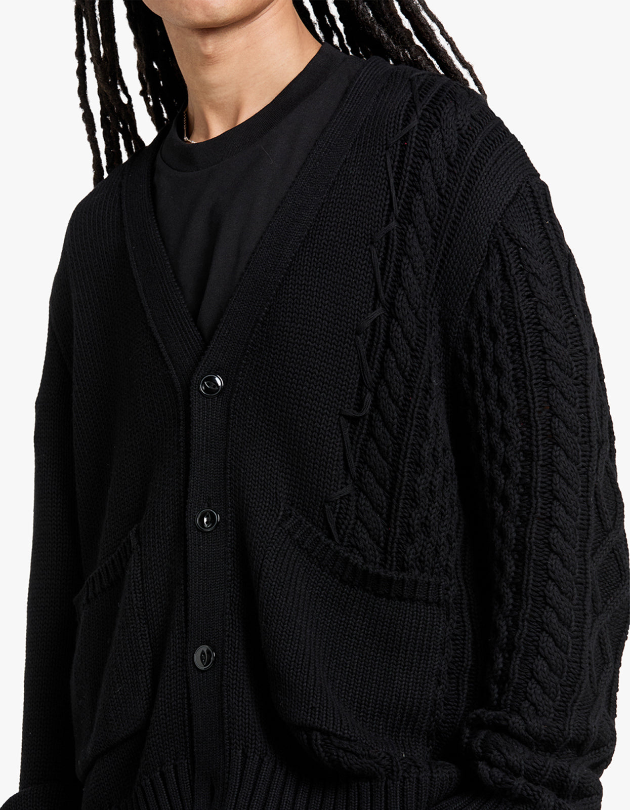 Crafted from 100% cotton jersey and Aran knit, it features a stunning black colorway and a button fastening for an elegant touch. Experience ultimate comfort and style with ribbed cuffs and hem.