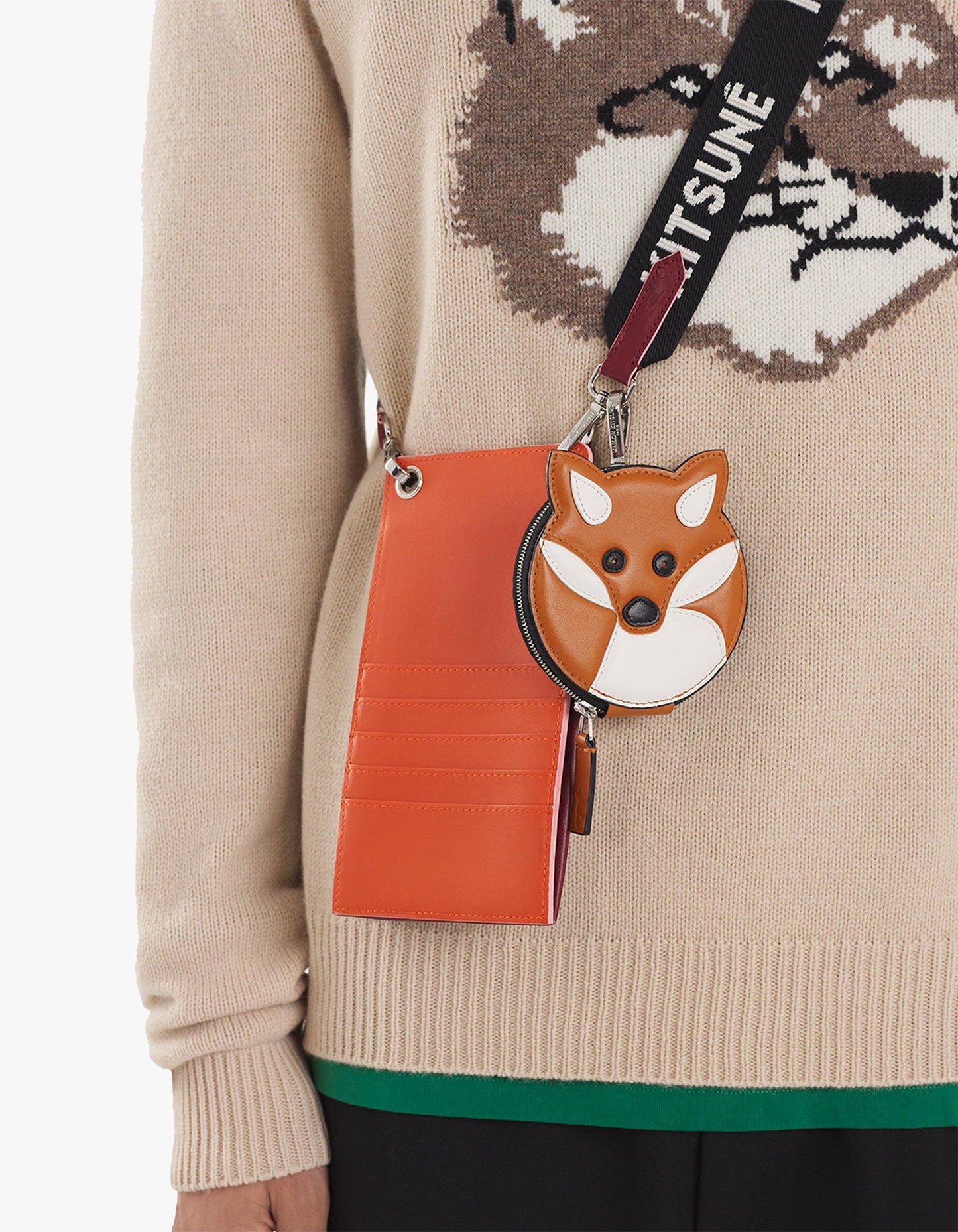 Must-have for any stylish individual, the Fox Head Coin Purse with Hook from Maison Kitsuné features a unique fox shape design and is made of 100% leather.