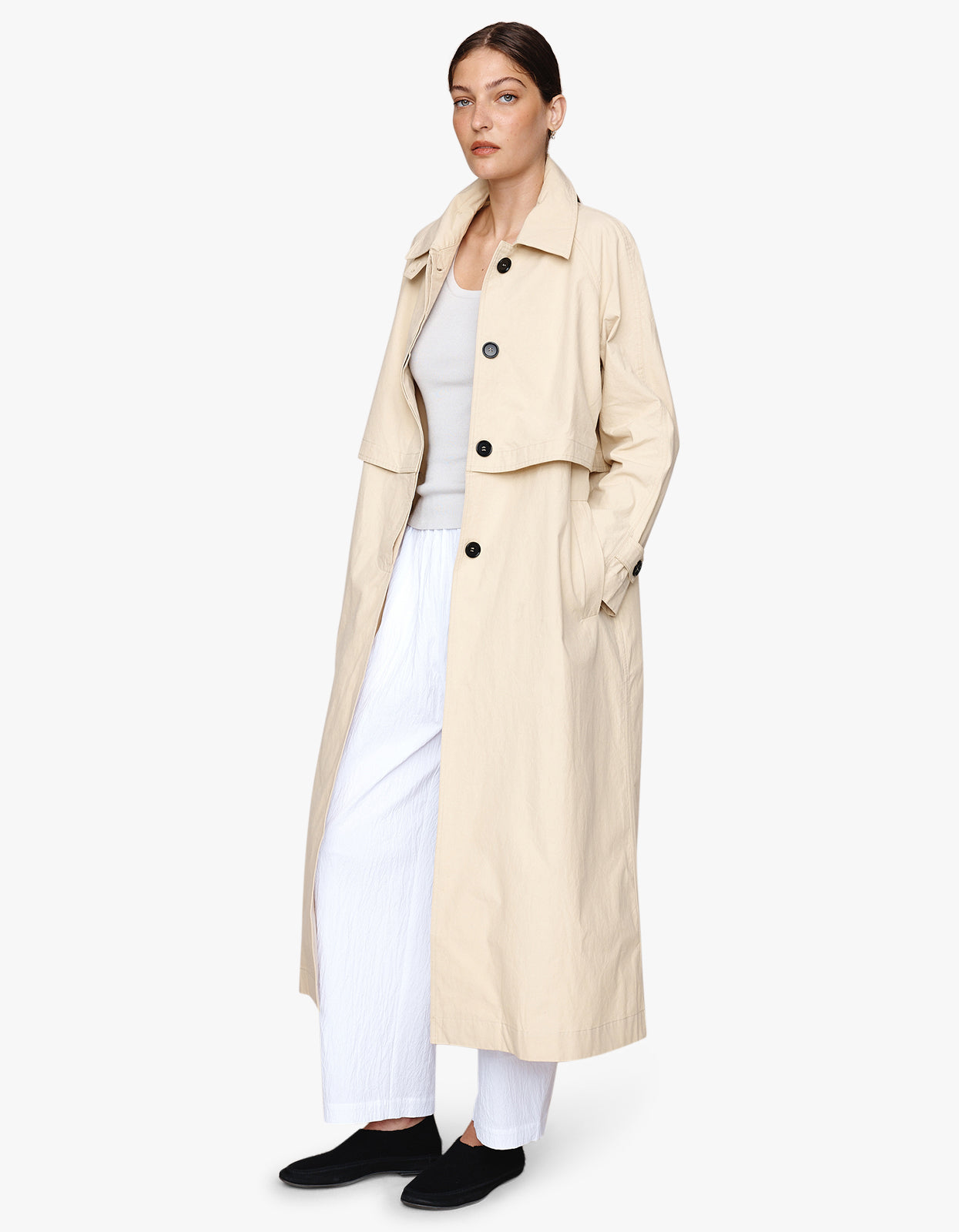 Designed for year-round layering—the Marle Angelo Coat in Putty is a longline trench coat crafted from structured 100% cotton with a relaxed, elongated shape.