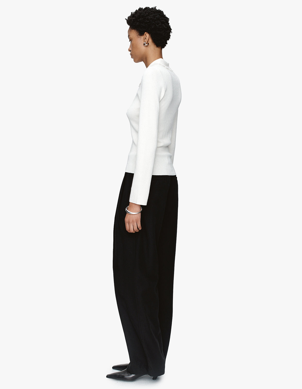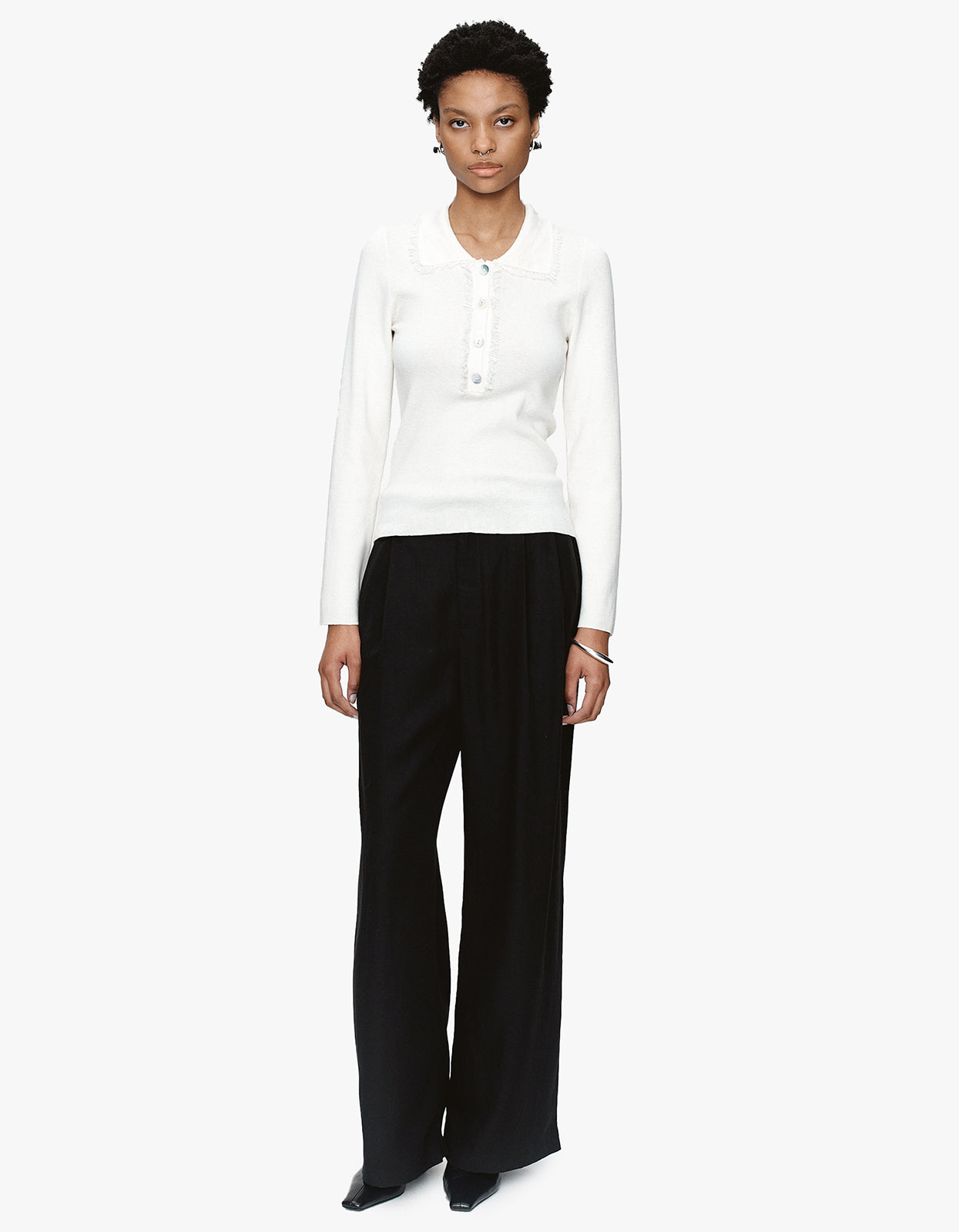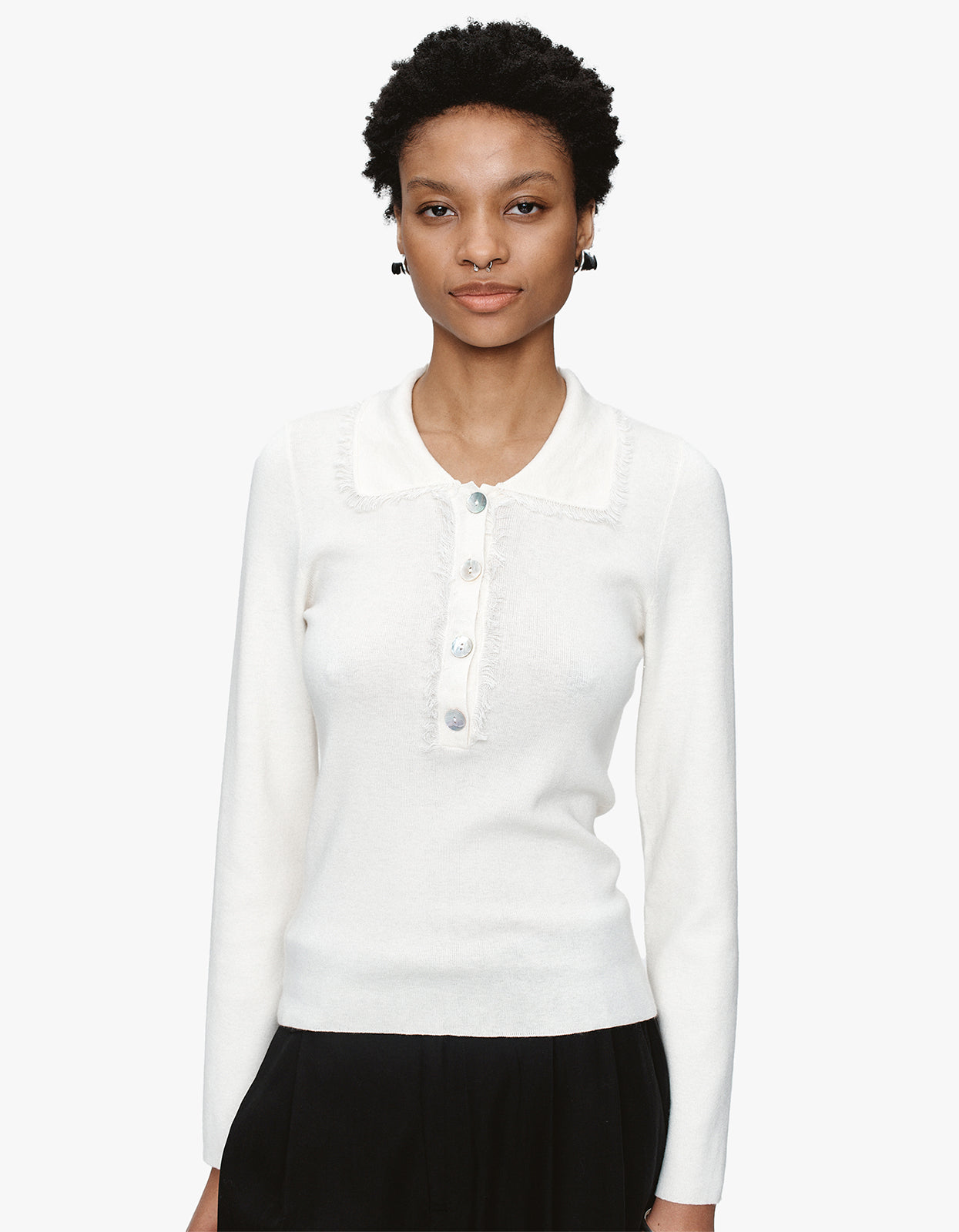 This luxurious knit features a pure white colorway, a half button design, and a Puritan collar. The flared sleeves and delicate frill details add a feminine touch to this exclusive piece. Elevate your wardrobe with this sophisticated and timeless addition.