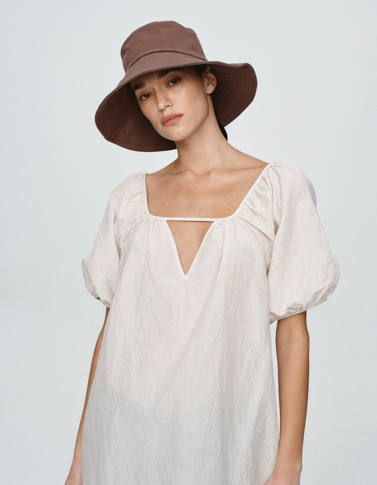 The Nonna Hat is a classic wide-brim bucket silhouette crafted from a structured cotton canvas. It features a deep crown and a generous downward brim providing full sun coverage. The internal edge is finished with a clean bias bind for comfort and durability.