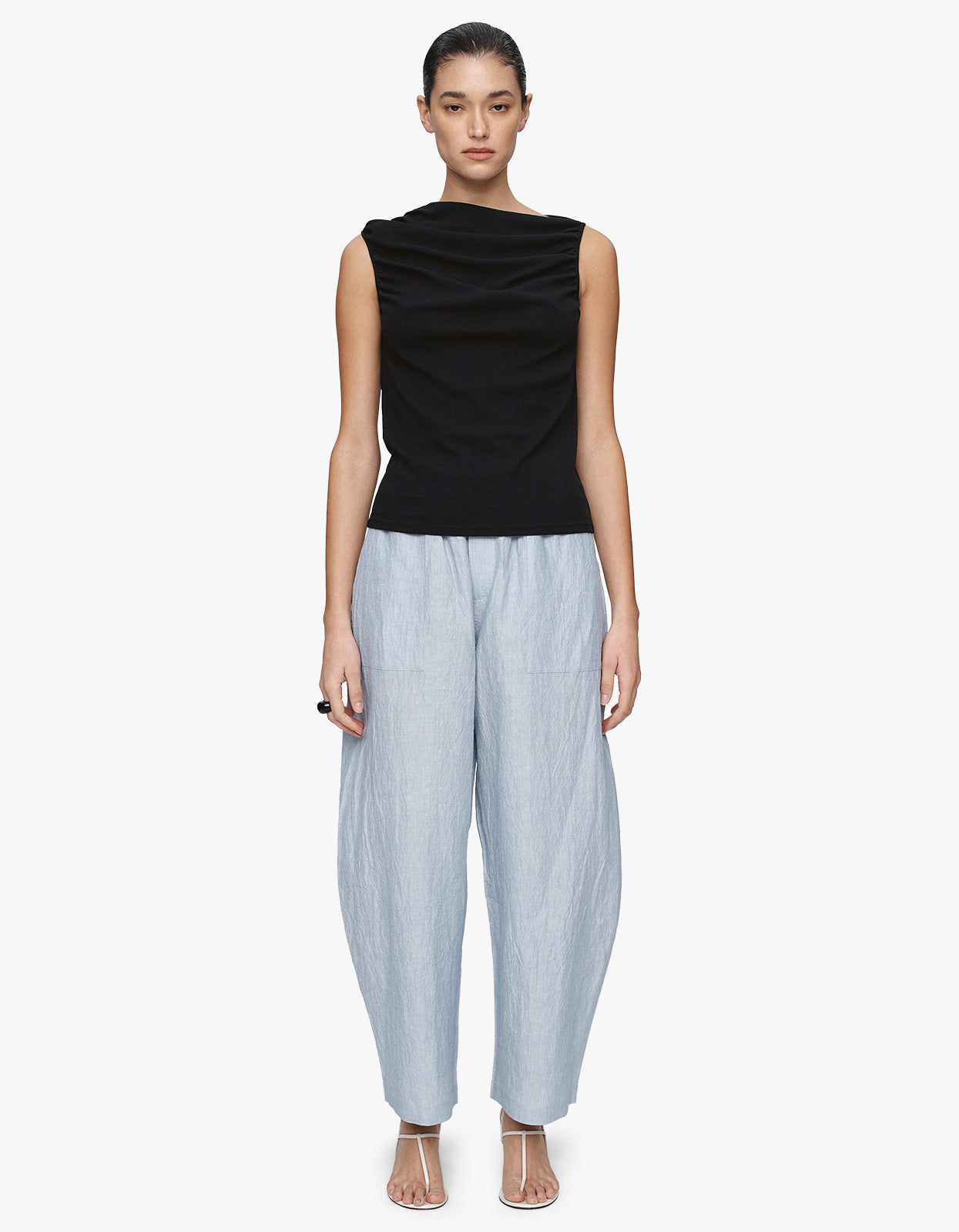Featuring an artfully draped neckline and armhole at the front and back that creates soft folds, adding quiet structure that can be worn off the shoulder. Cut close through the body for a clean fit, it balances elegance with simplicity. A versatile base layer or stand-alone piece with a sculptural edge.