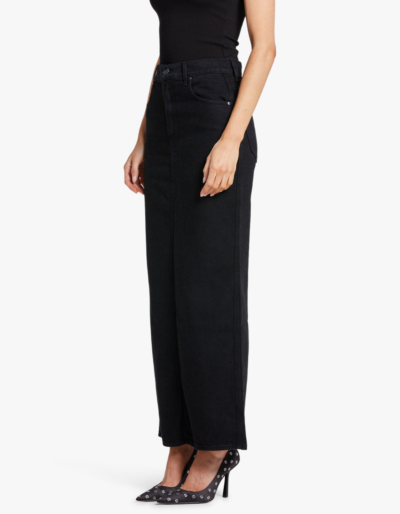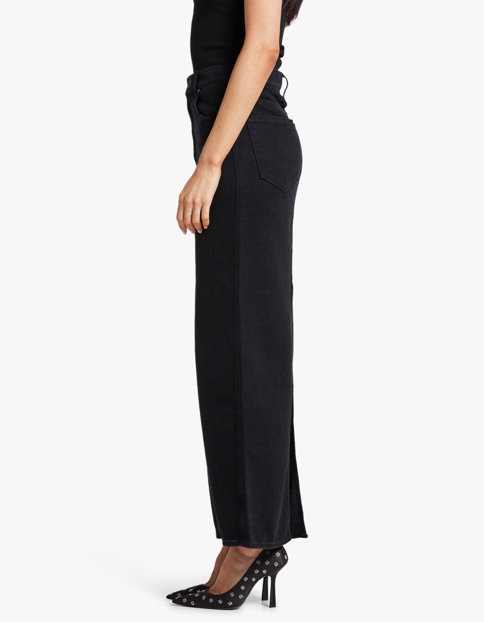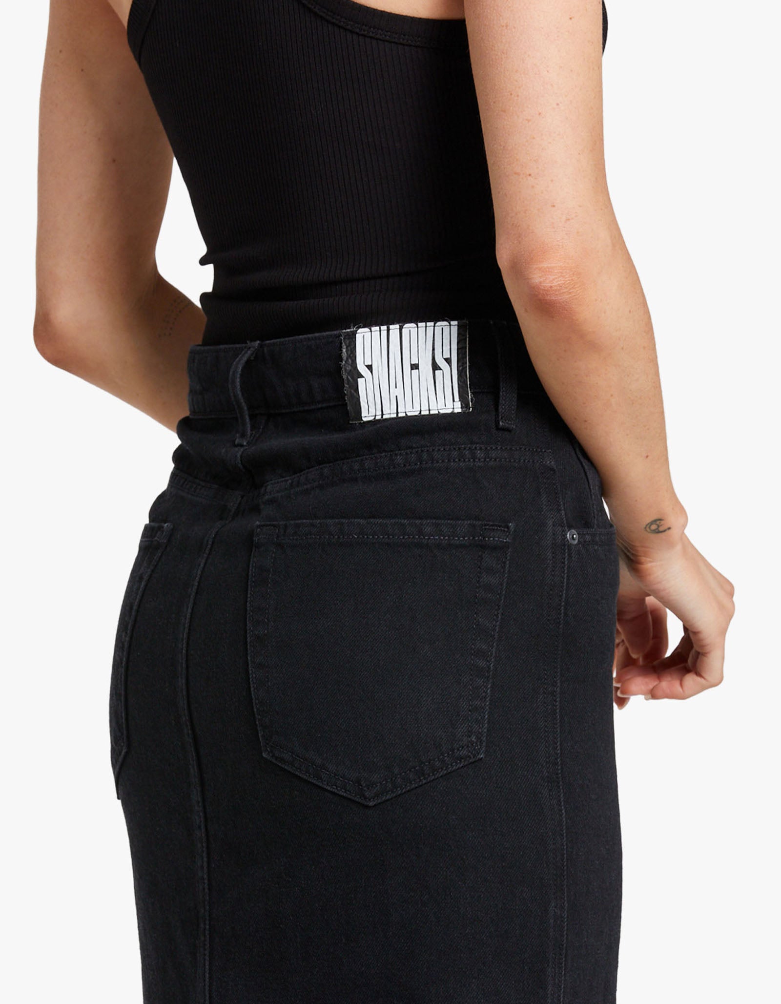 MOTHER's homage to throwback styles of the 80s and 90s. The Candy Stick Skirt is high-rise, and designed with a narrow, full length fit and a thigh-high slit in the back. Made from a recycled cotton blend, Licorice is a dark black wash that channels the nostalgia of snack time with a pretzel-detailed button and candy-inspired interior rivets.