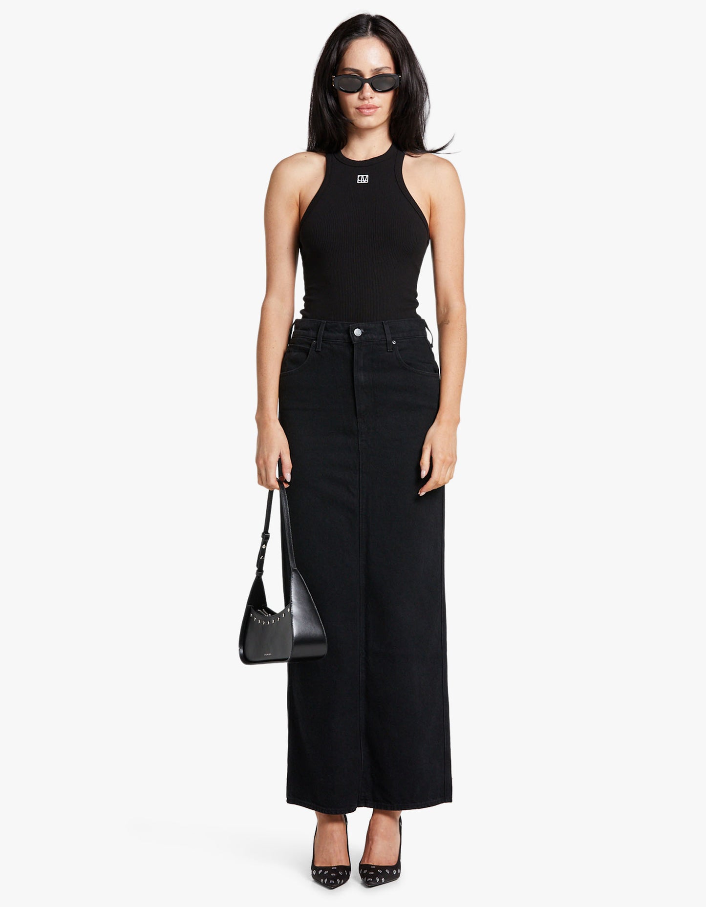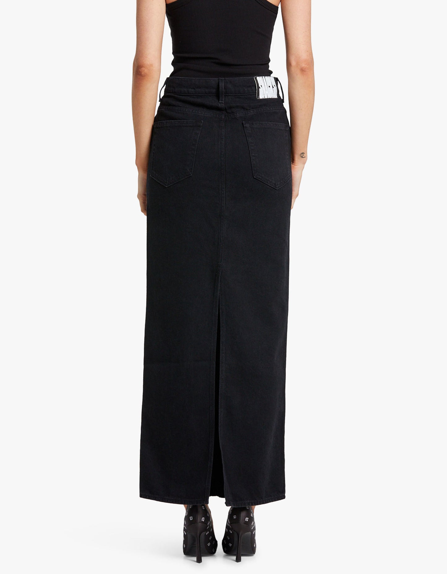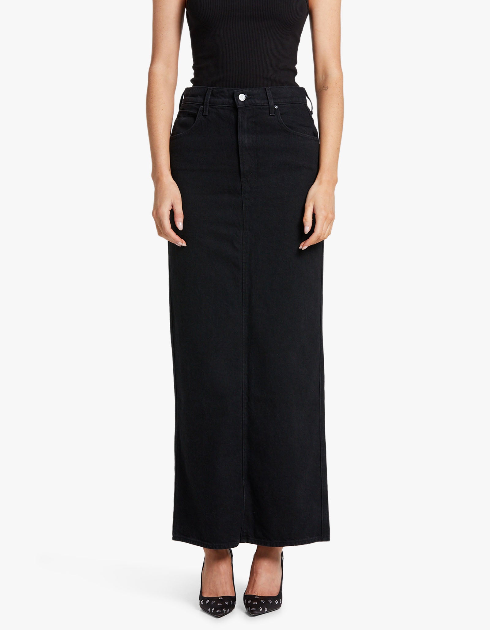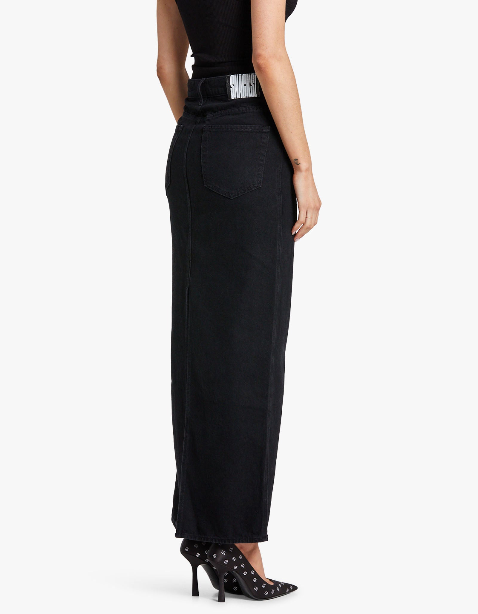 MOTHER's homage to throwback styles of the 80s and 90s. The Candy Stick Skirt is high-rise, and designed with a narrow, full length fit and a thigh-high slit in the back. Made from a recycled cotton blend, Licorice is a dark black wash that channels the nostalgia of snack time with a pretzel-detailed button and candy-inspired interior rivets.