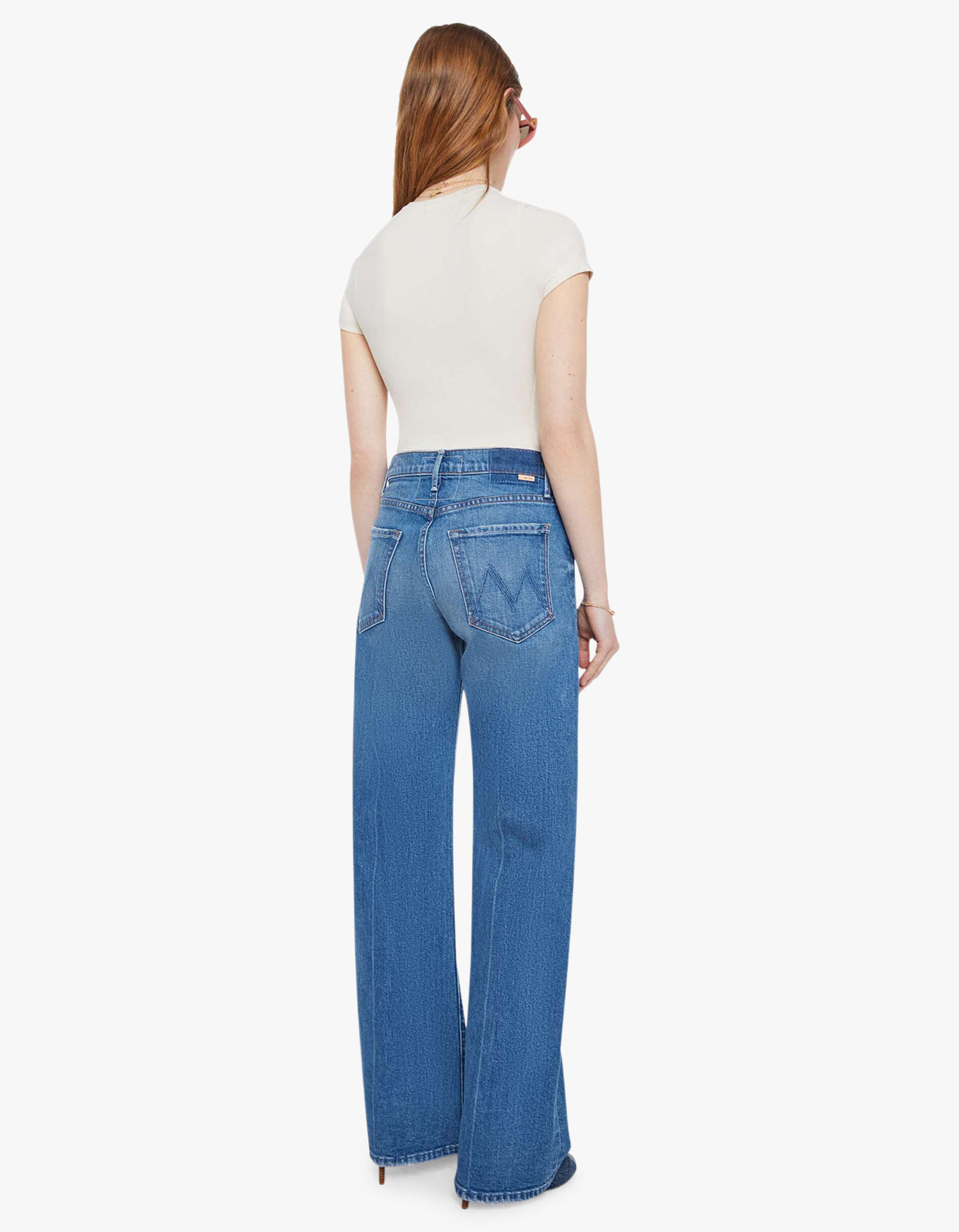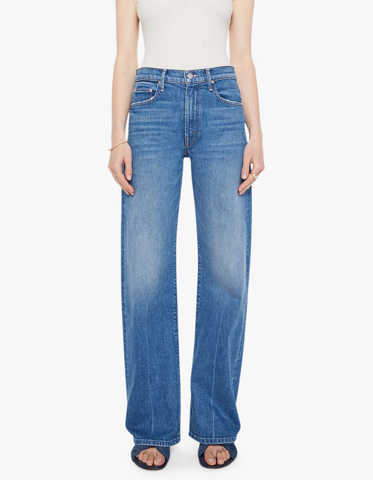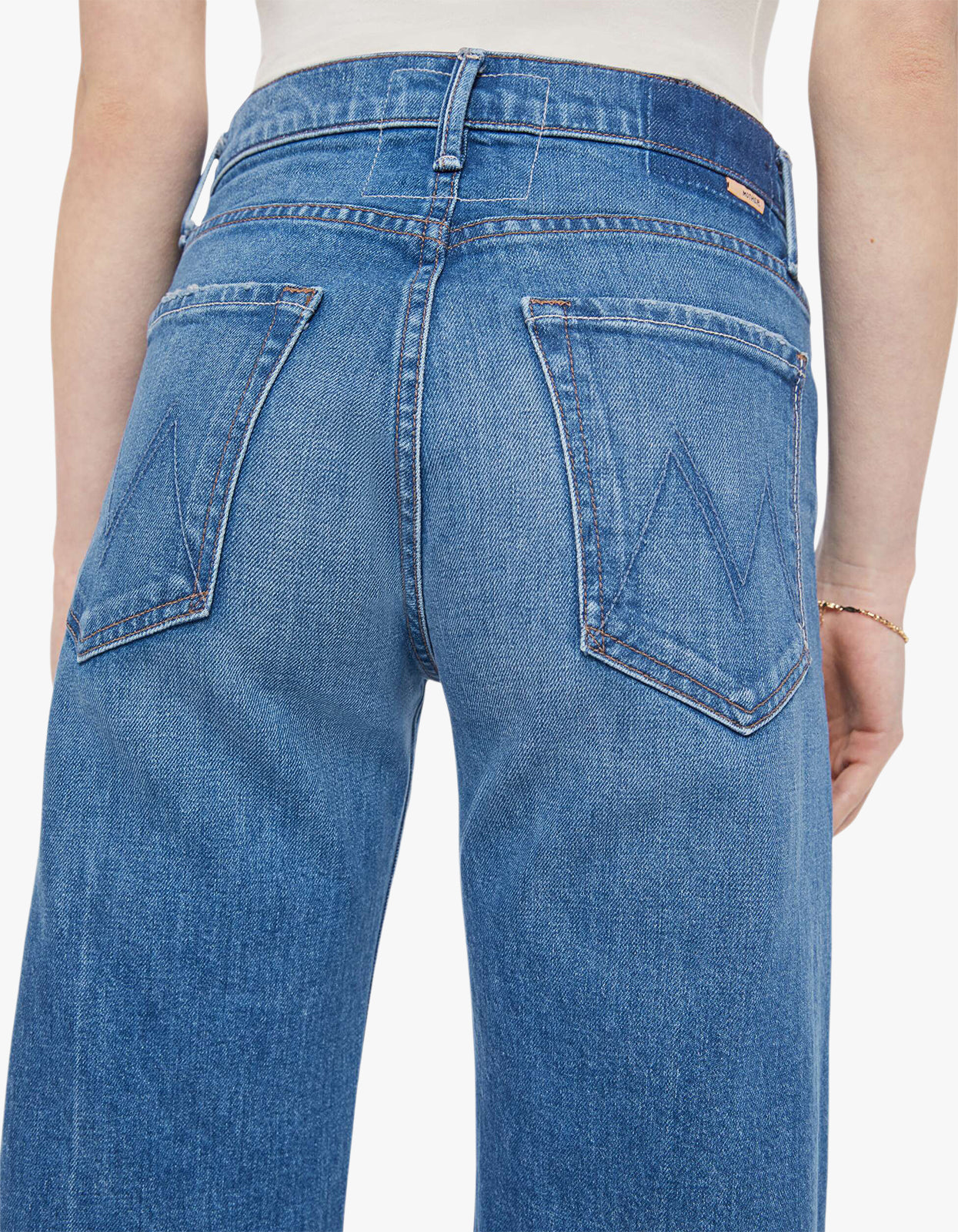 Flying high. MOTHER wide-leg jeans with a zip fly, mid rise and a 32-inch inseam with a clean hem. Made from semi-rigid SUPERIOR denim, Get Two Birds Stoned is a mid-blue with whiskering and fading at the knees.