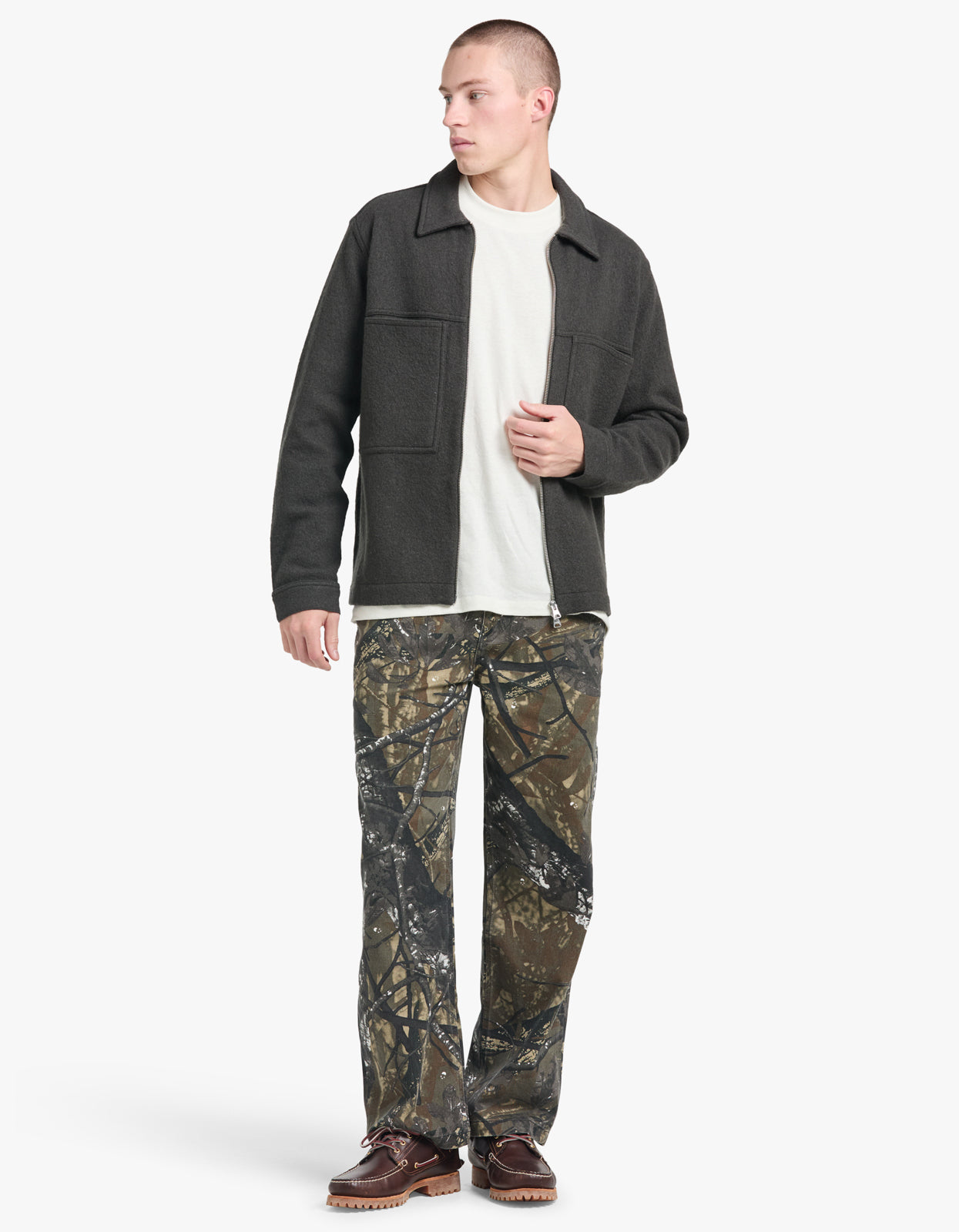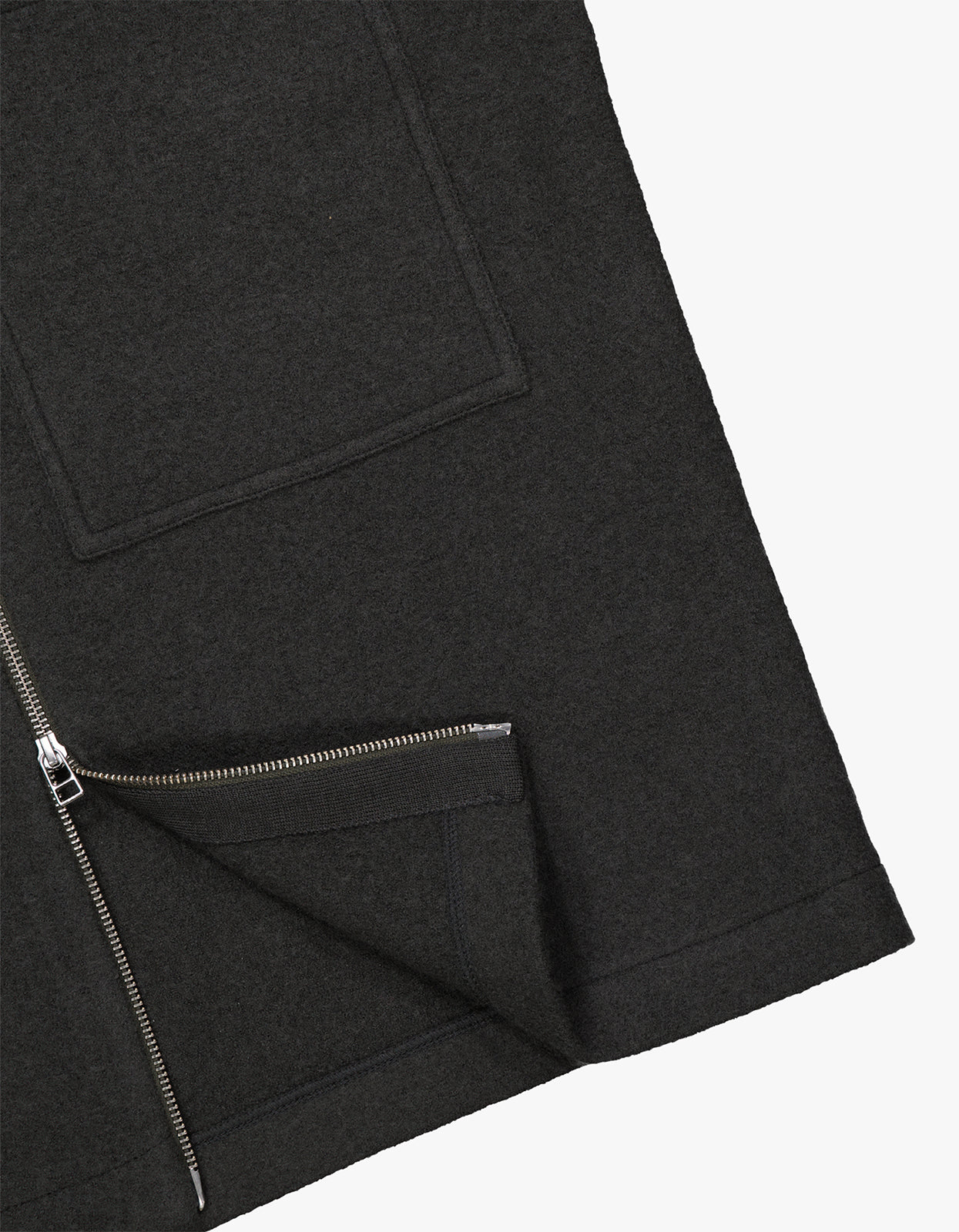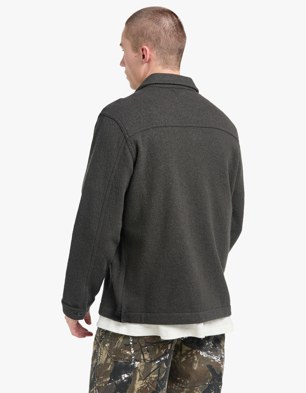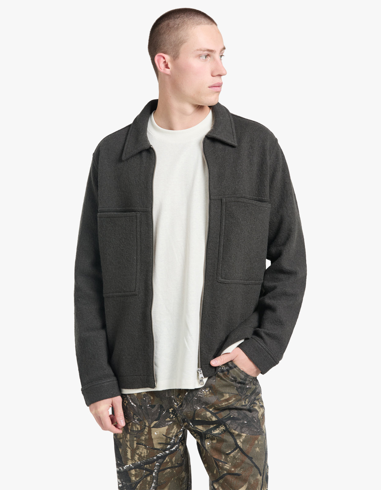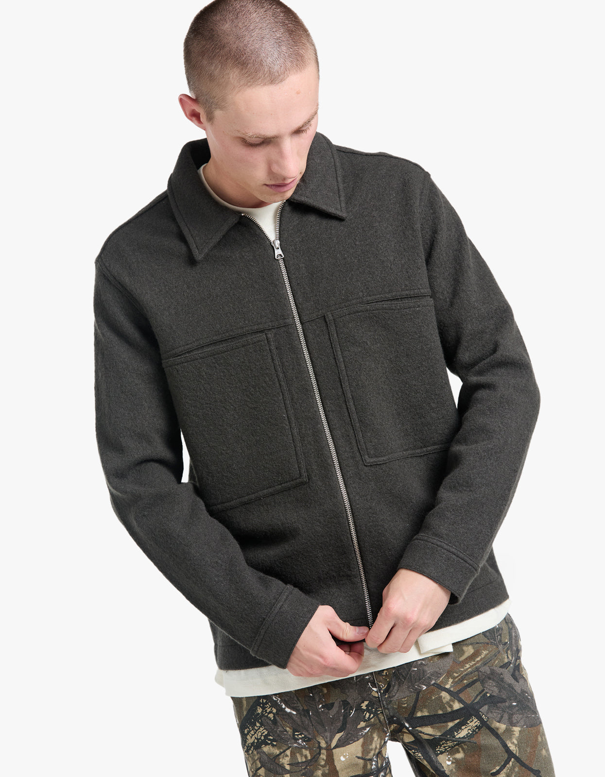 Crafted in undyed boiled merino wool, this zip-up overshirt exudes sophistication. With a deep, rich colorway and two extra-large front chest pockets, you'll stay warm and stylish all season long. Elevate your wardrobe with this exclusive piece.