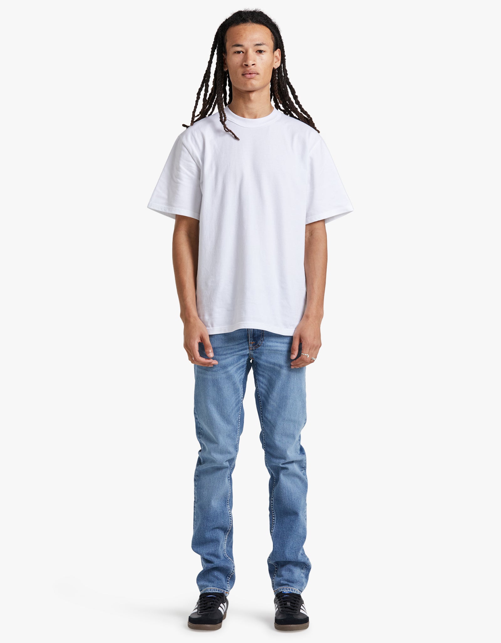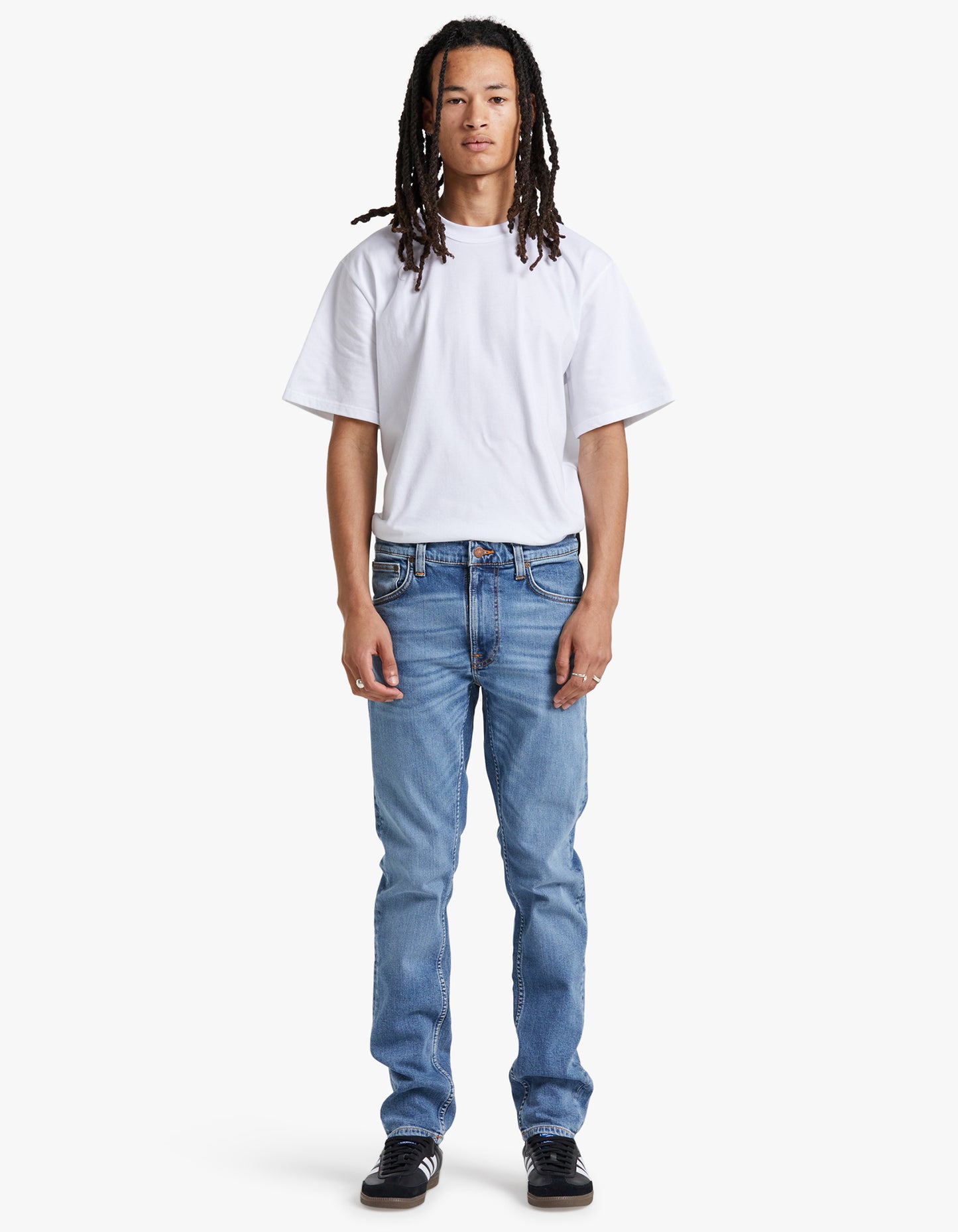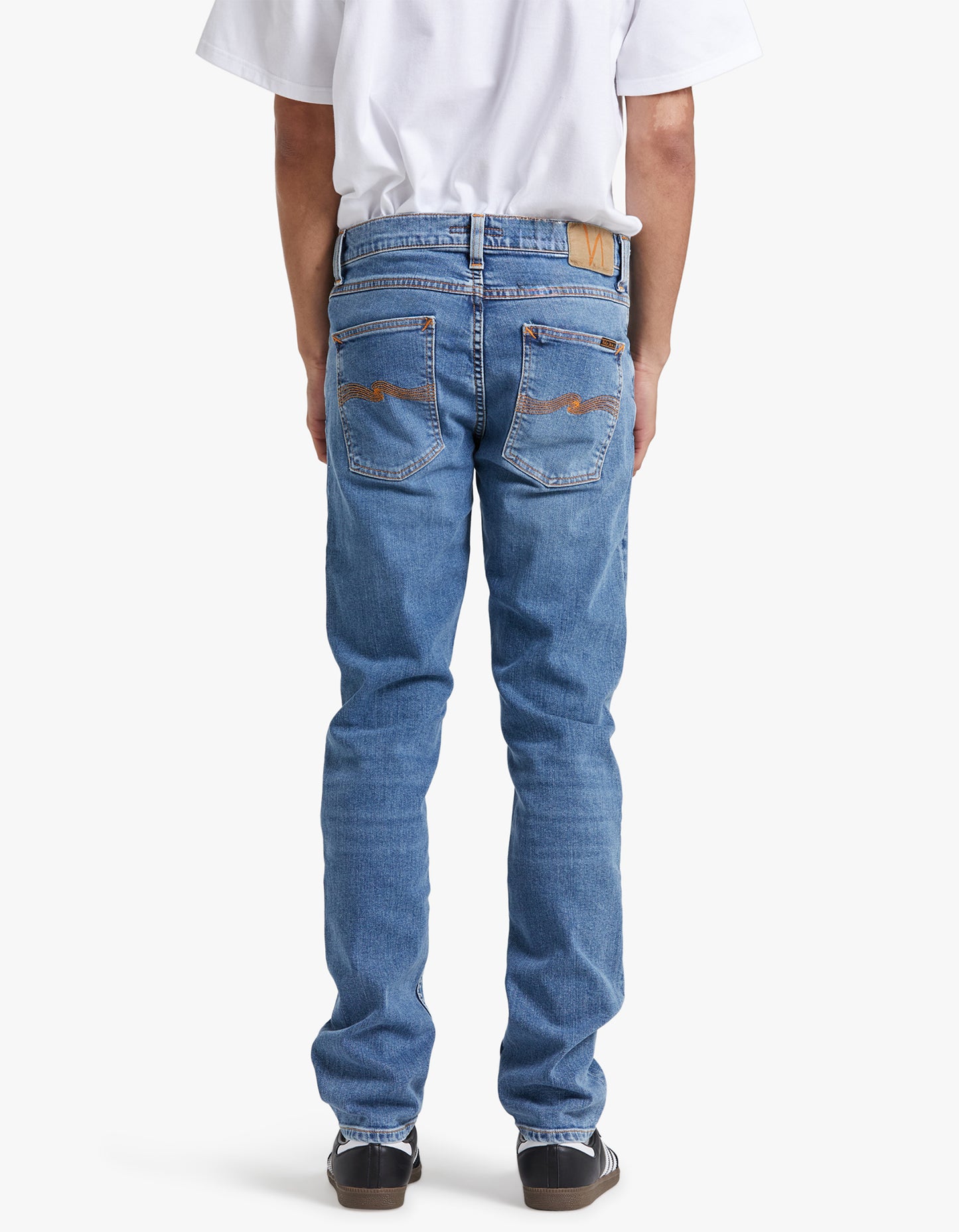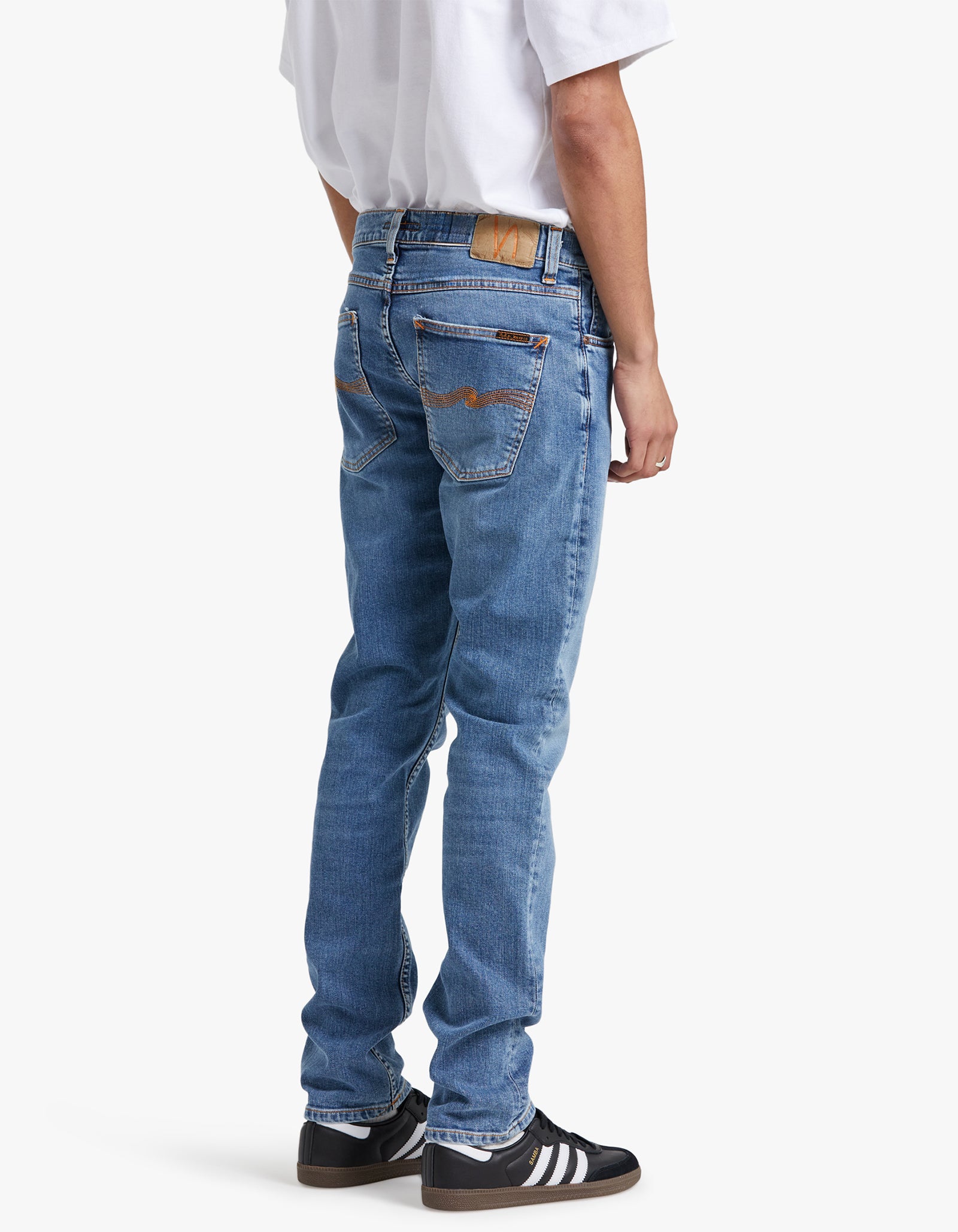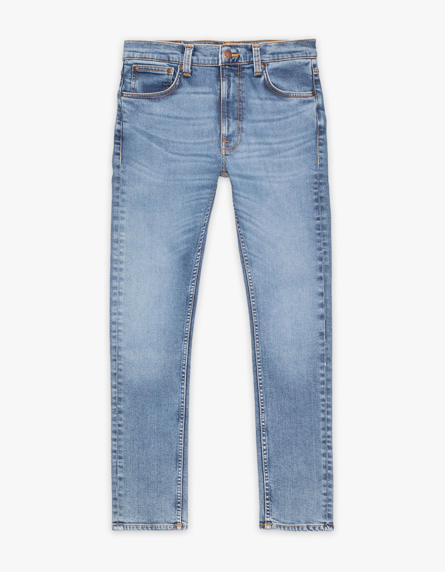 Discover the iconic Lean Dean cut from Nudie in the perfect blue jean shade: Lost Orange.