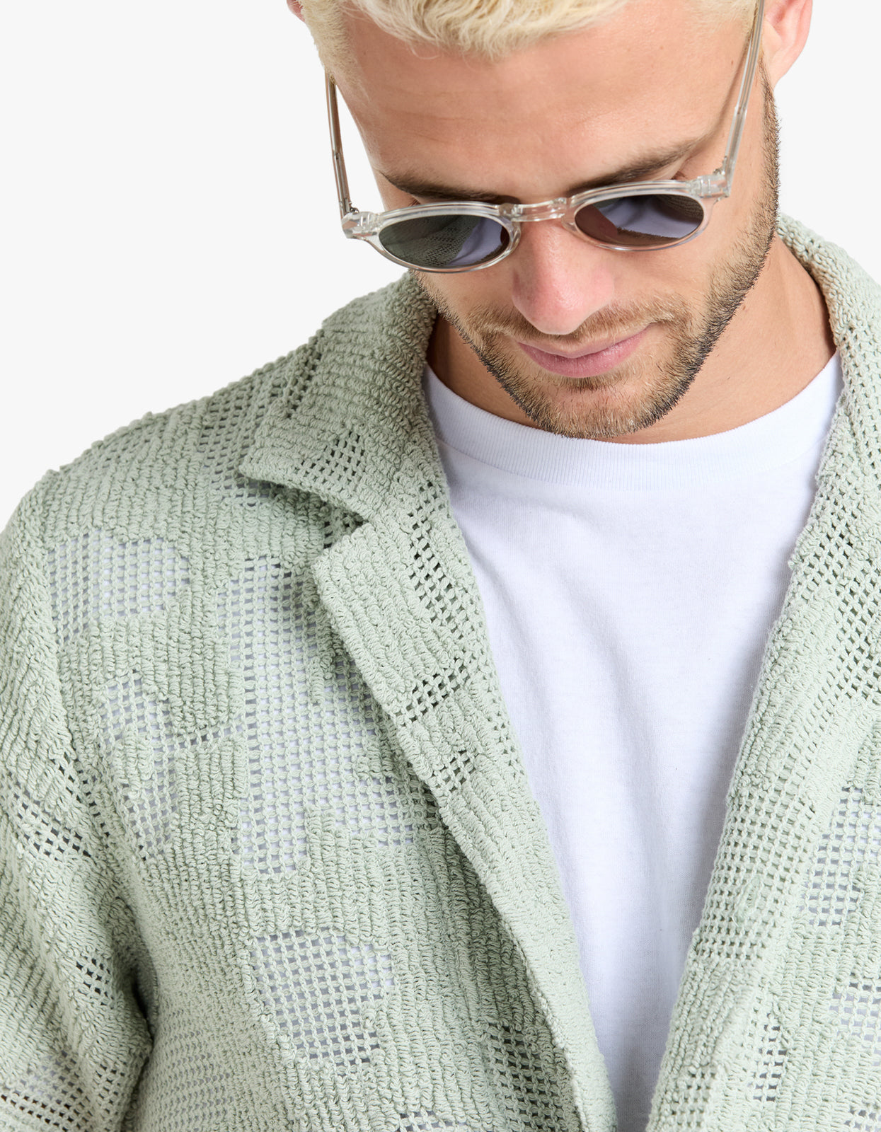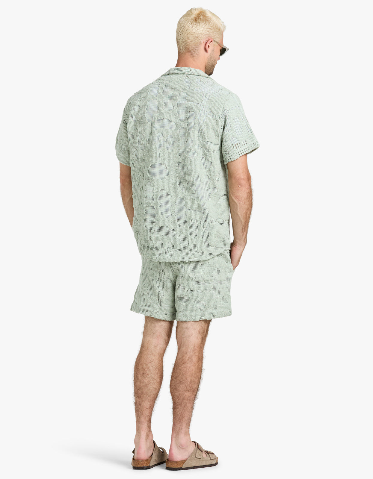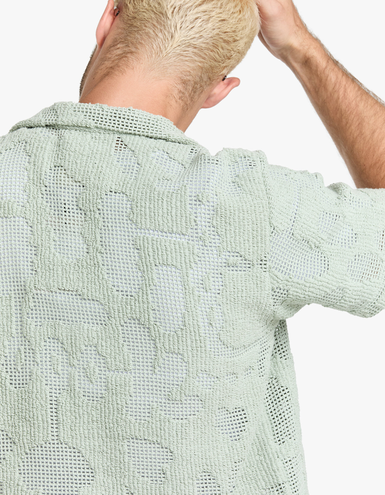 Made from a heavyweight, woven cotton crochet fabric, this piece boasts an abstract interpretation of botanical motifs. With a resort collar and button-down front, this sage green shirt exudes an air of exclusivity. Slightly dropped shoulders and a curved hemline add a touch of sophistication.