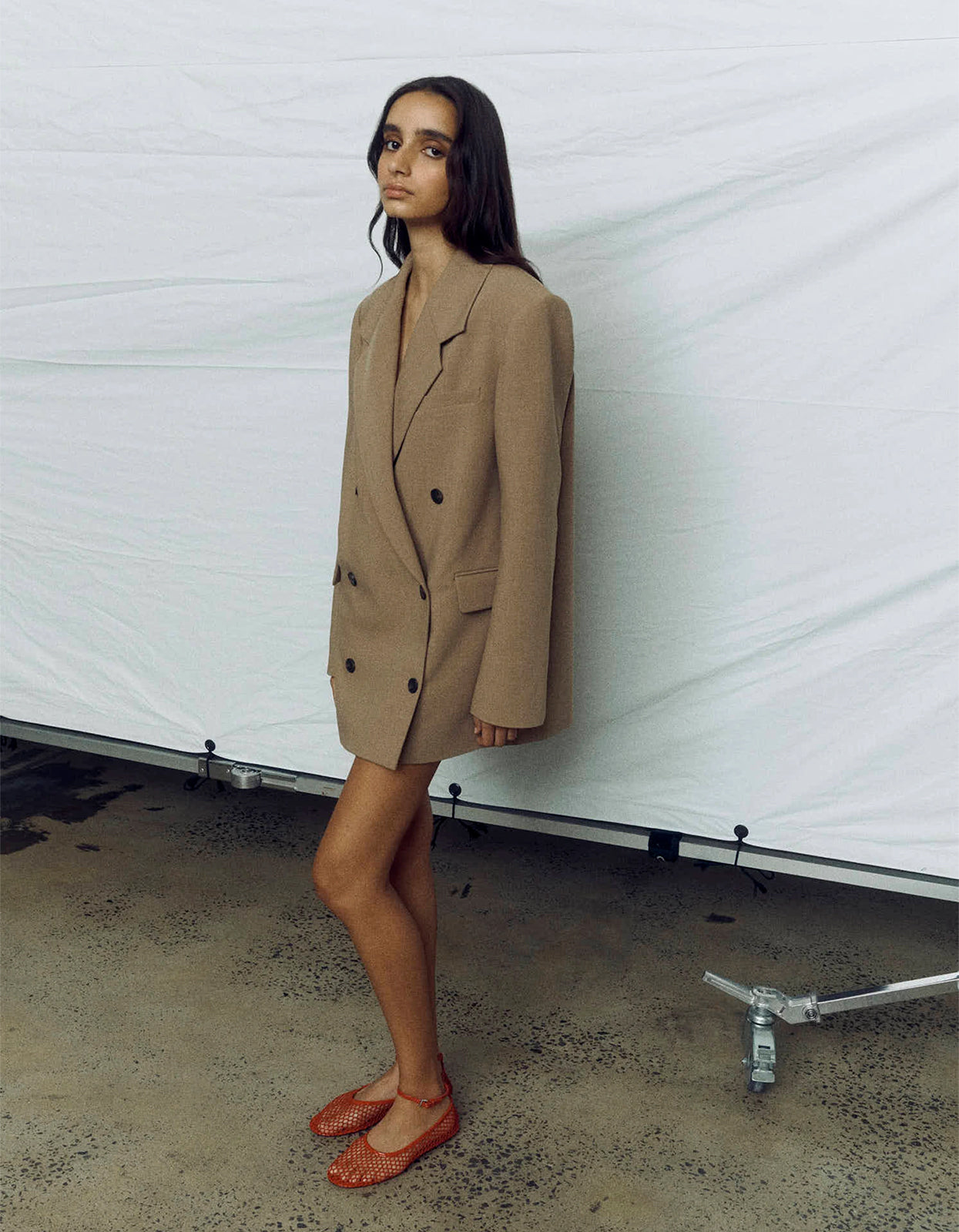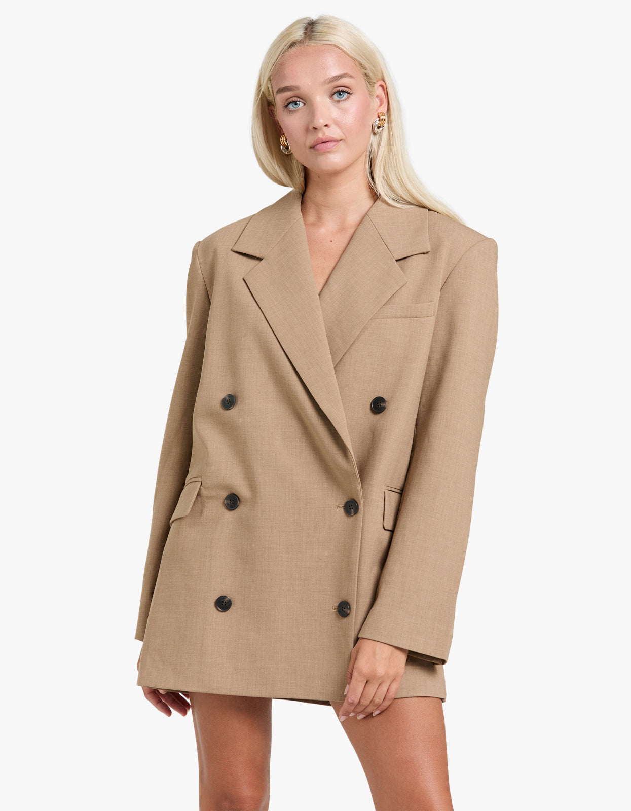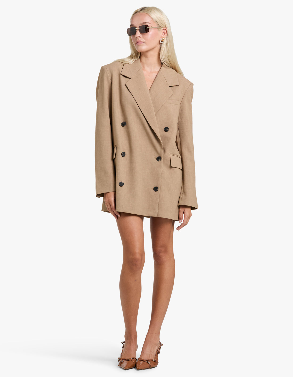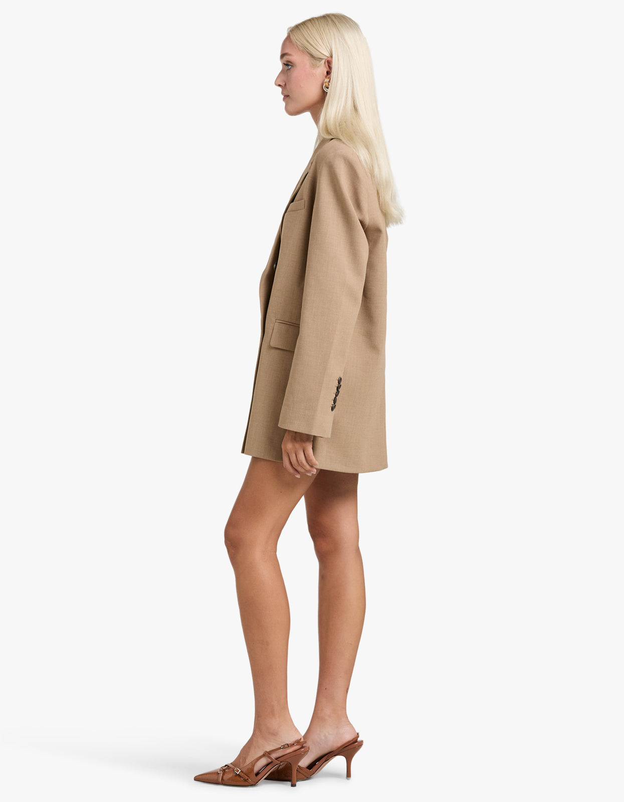 Introducing the Crawford Blazer in Stone from One of Others, a versatile piece that can be worn as a blazer or a short mini dress.
