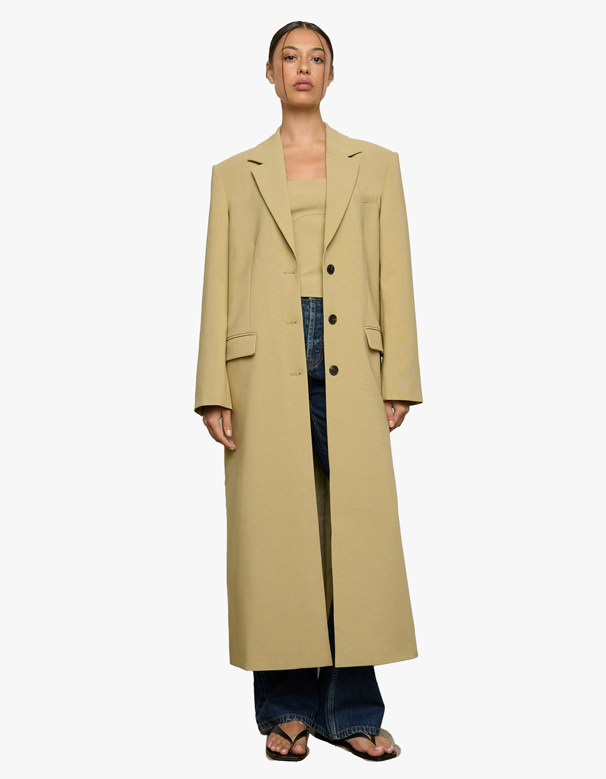 Crafted from a mid-weight rayon blend suiting, this longline coat exudes sophistication. Its relaxed fit and khaki colorway provide both comfort and style. A must-have for the fashion-forward individual.