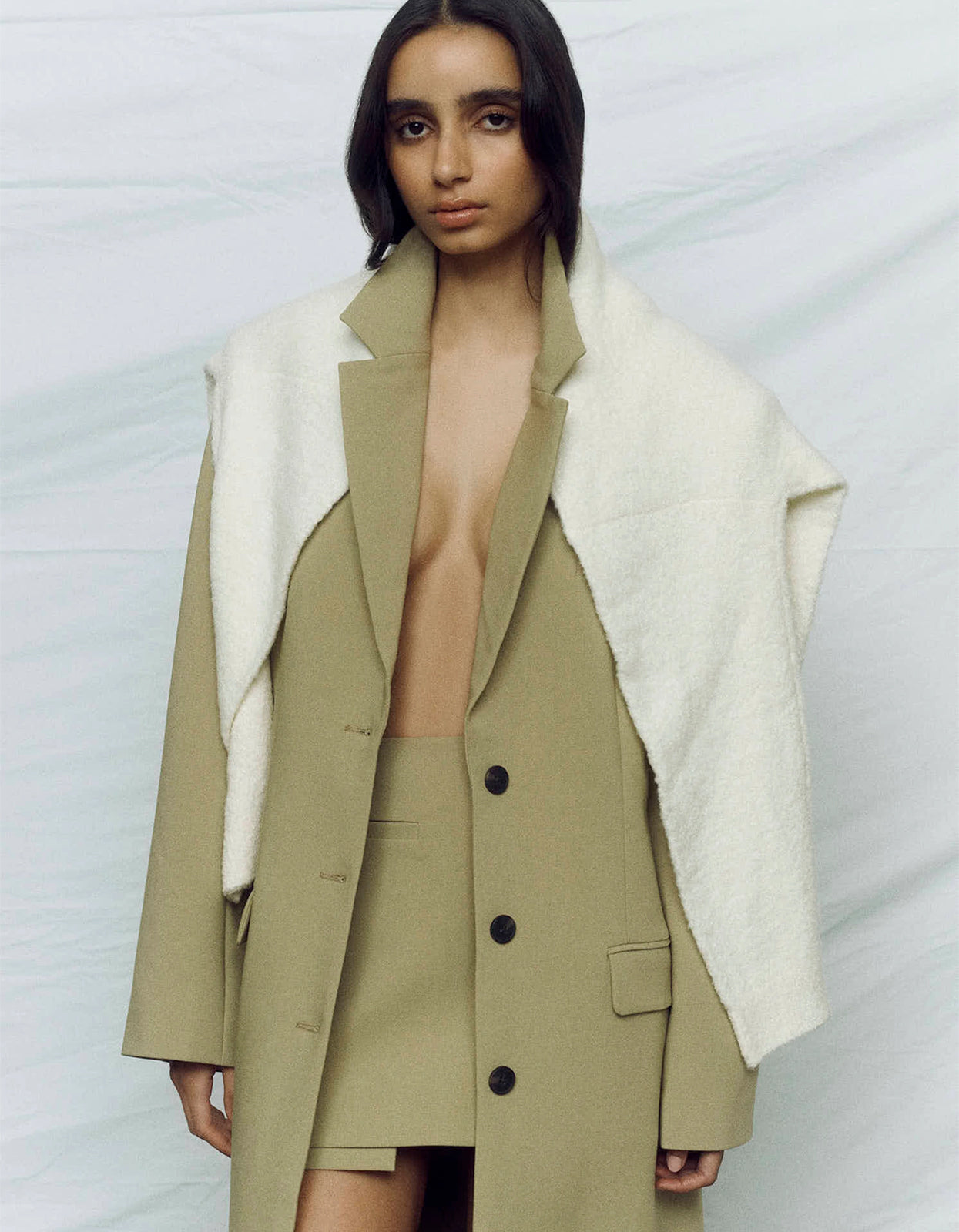 This piece boasts a chic khaki colourway and features elegant single welt pockets and a unique stepped hem detail. Made from a mid-weight rayon blend suiting, this mini skirt offers subtle stretch for a comfortable and flattering fit. Elevate your wardrobe with this sophisticated statement piece.