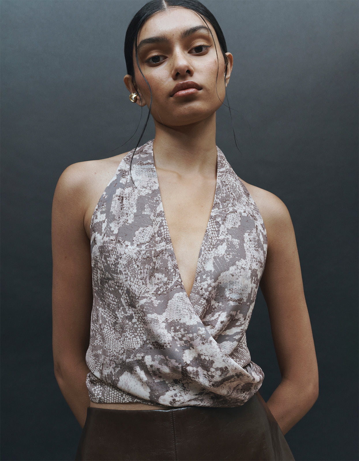 The Gisele Top in Taupe Serpente from One Of Others offers refined elegance with its serpentine pattern.