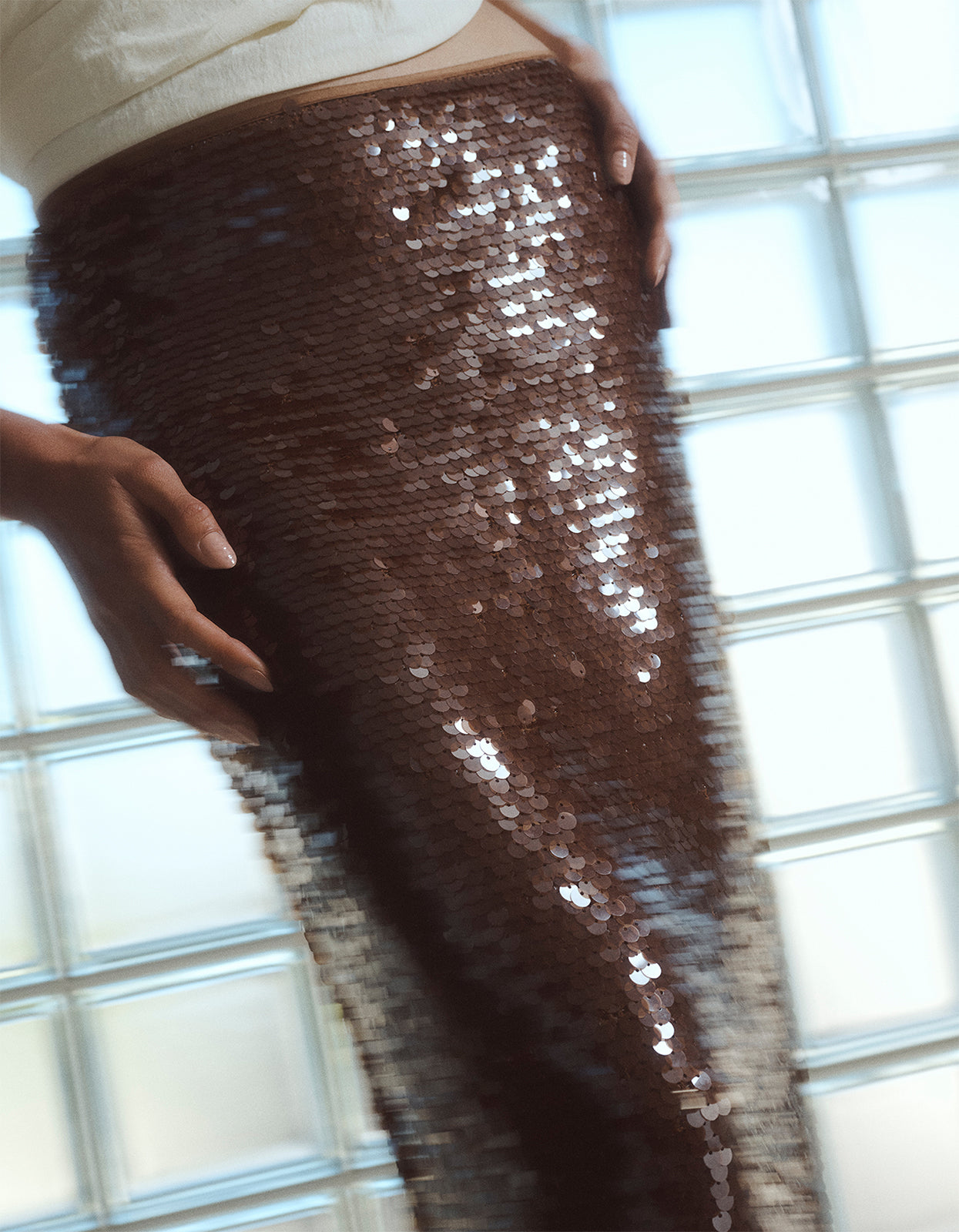 The Kendall Skirt delivers understated glamour with its straight-cut silhouette that complements every body type. Constructed from a luxurious custom sequin fabric, it catches light with refined shimmer while maintaining an effortlessly polished aesthetic. The strategically placed side split allows graceful movement without compromising sophistication, making it equally at home at a daytime gathering or evening occasion.
