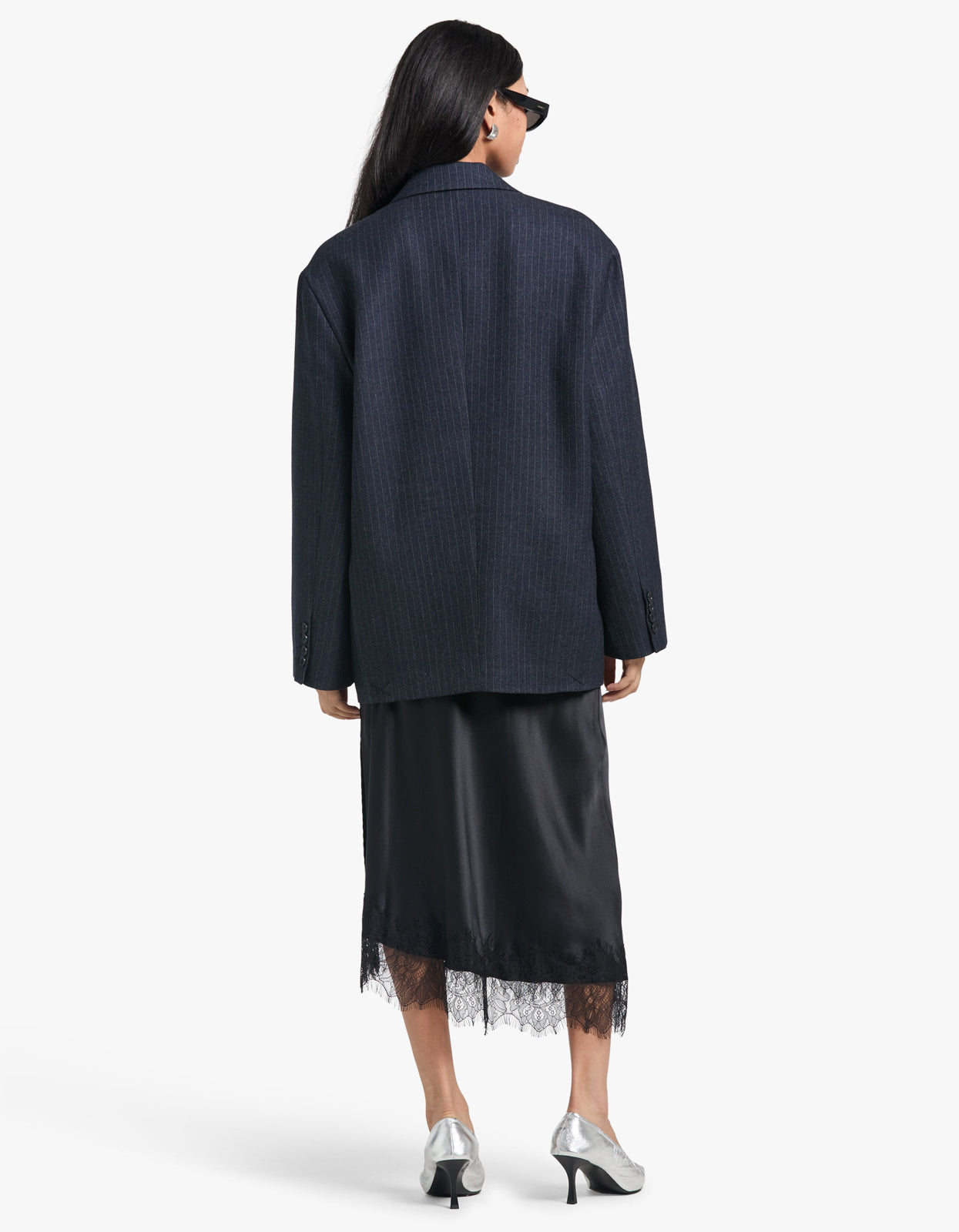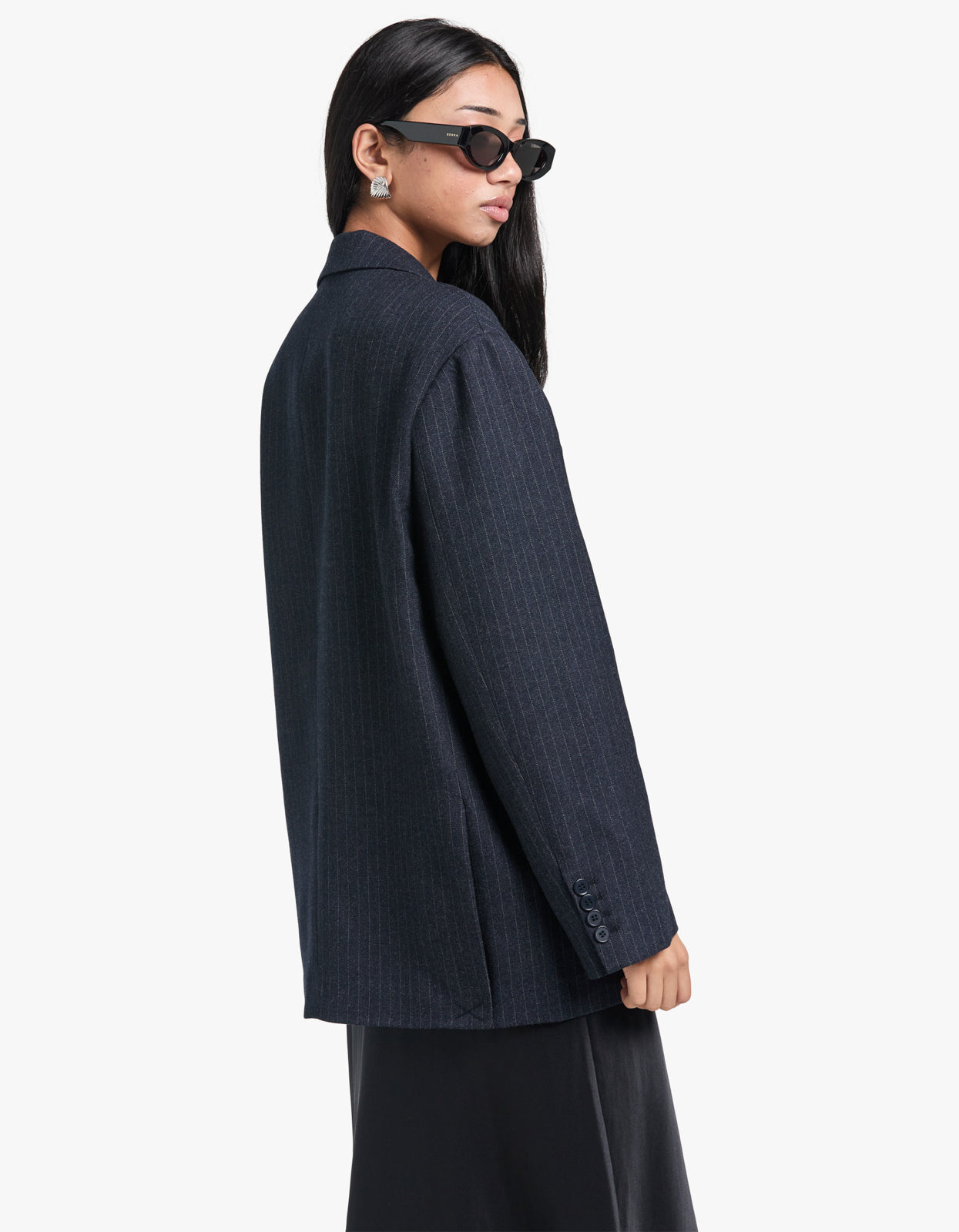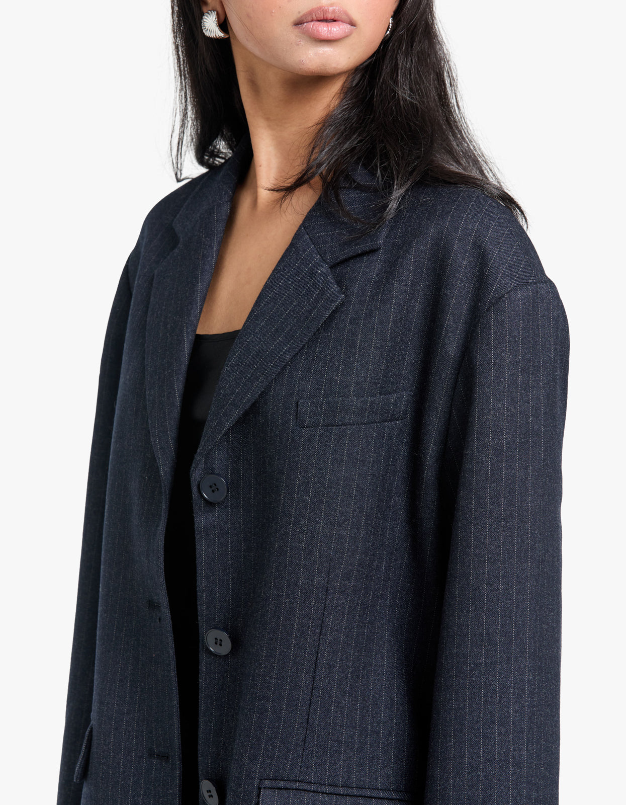 With its chic navy pinstripe and oversized fit, this blazer exudes elegance and sophistication. Perfect for any occasion, this blazer will make you stand out in the most tasteful way possible. Elevate your wardrobe with this must-have piece.