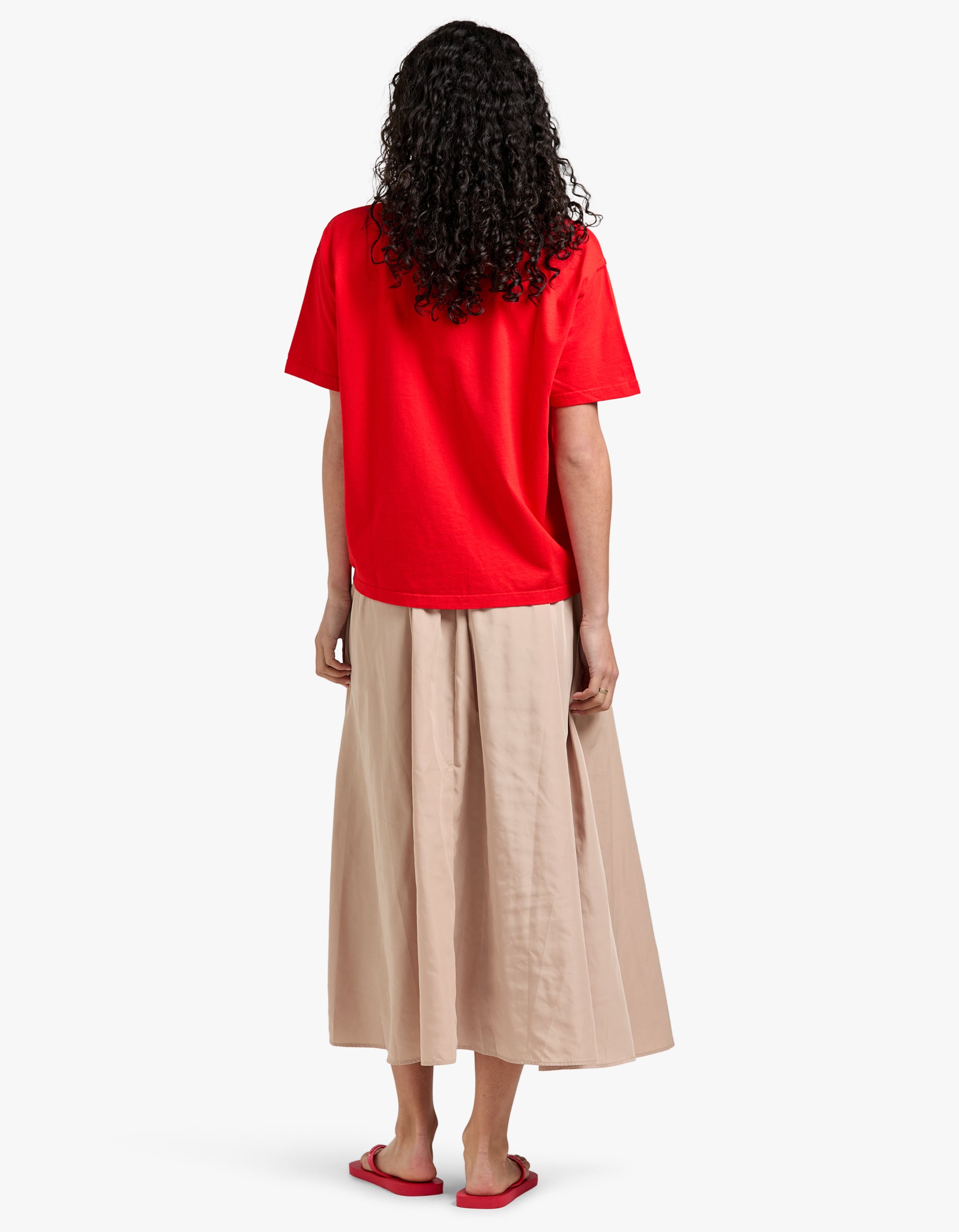 Cut from a soft, fluid fabric that drapes beautifully, this mid-waist skirt features subtle pleating and a gently flared hem for easy movement. The earthy clay tone adds warmth and versatility, making it a go-to piece for both elevated daywear and evening looks. Pair it with a fitted top or oversized knit to suit the season.