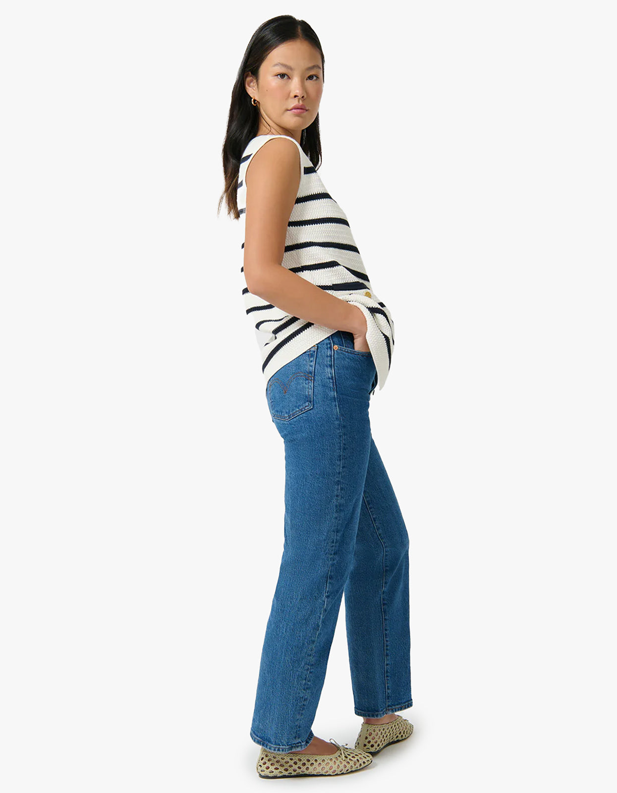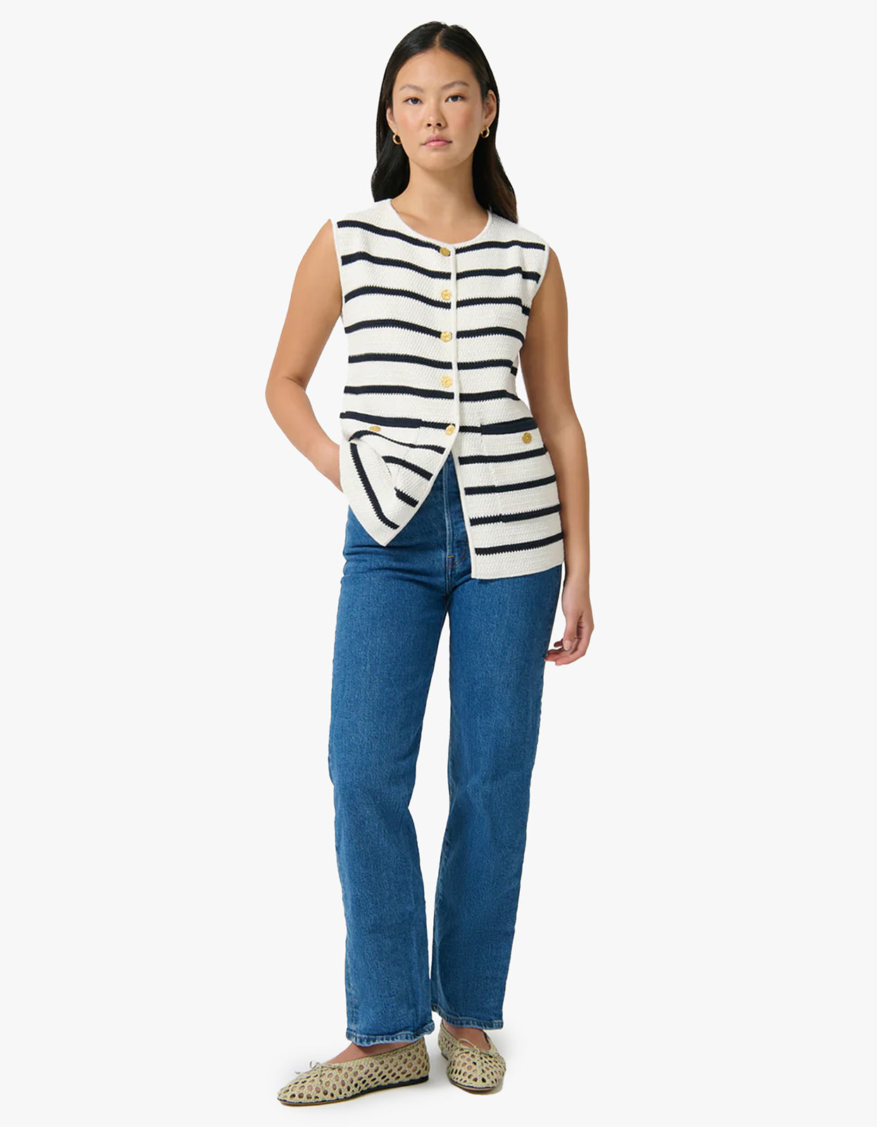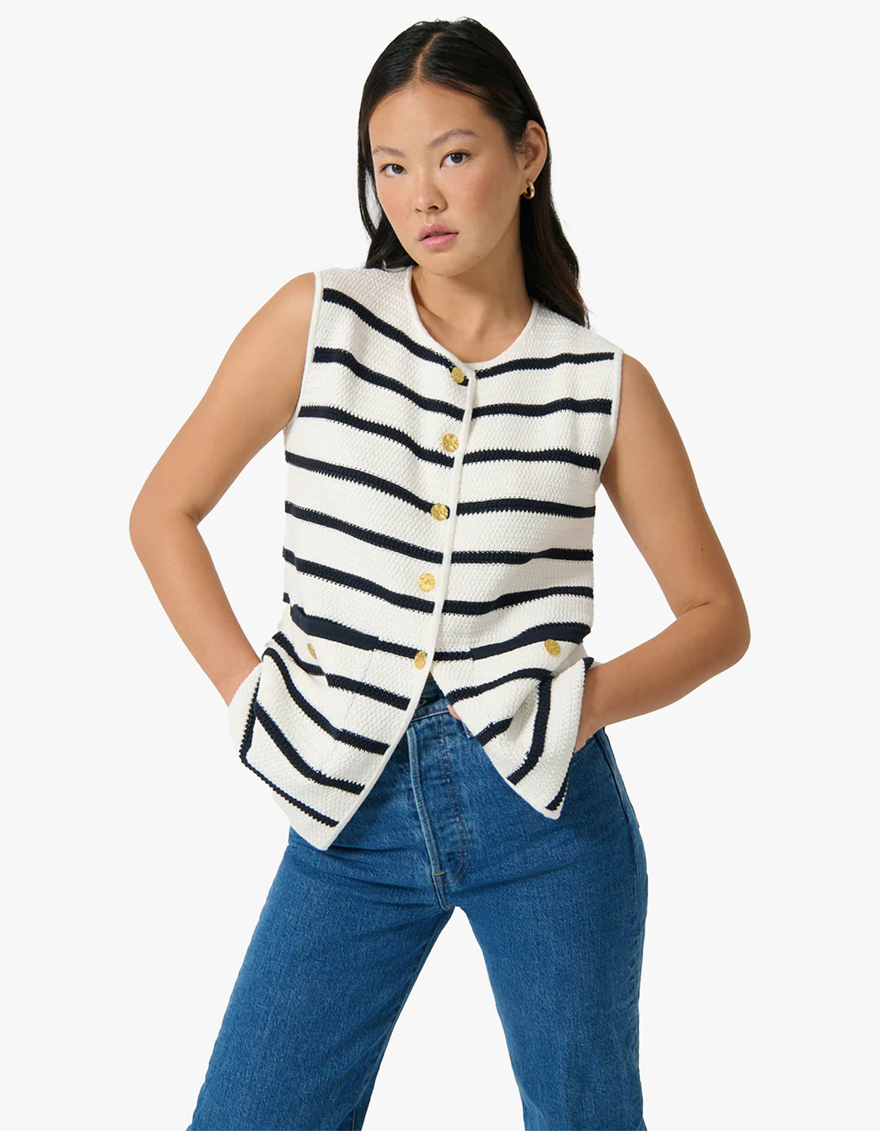 Introducing Onte's Helena Gilet in navy and white, a true wardrobe staple.