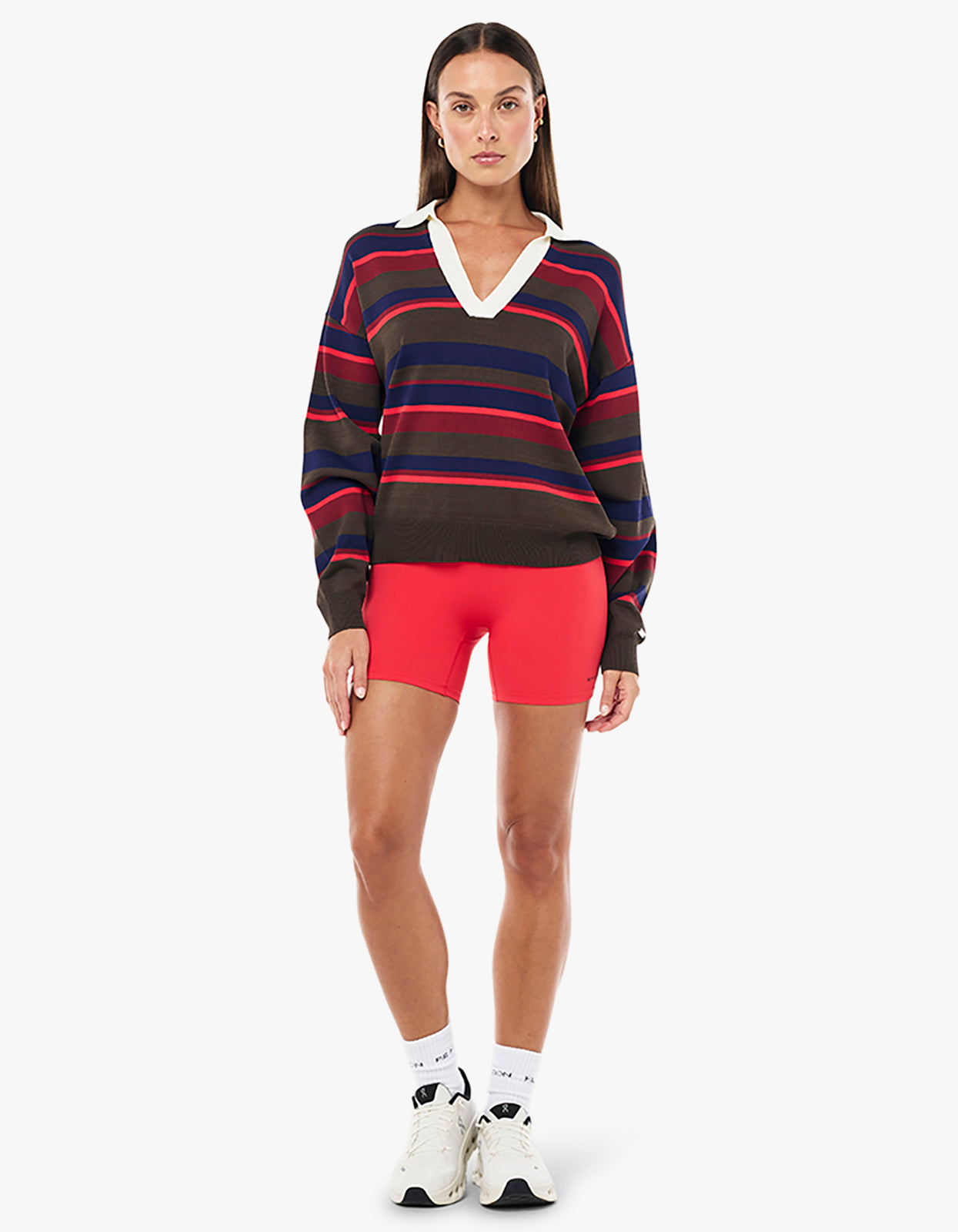 Created for wellness routines and slower movement days, this knit adds texture to your cooler-weather rotation. Featuring a striped V-neck collar silhouette with ribbed cuffs and hem, it's completed with a subtle metal logo patch for a considered finish. Style it with the Signature Bike Short and layer with tonal outerwear for a refined, transseasonal look that moves seamlessly from studio to street.