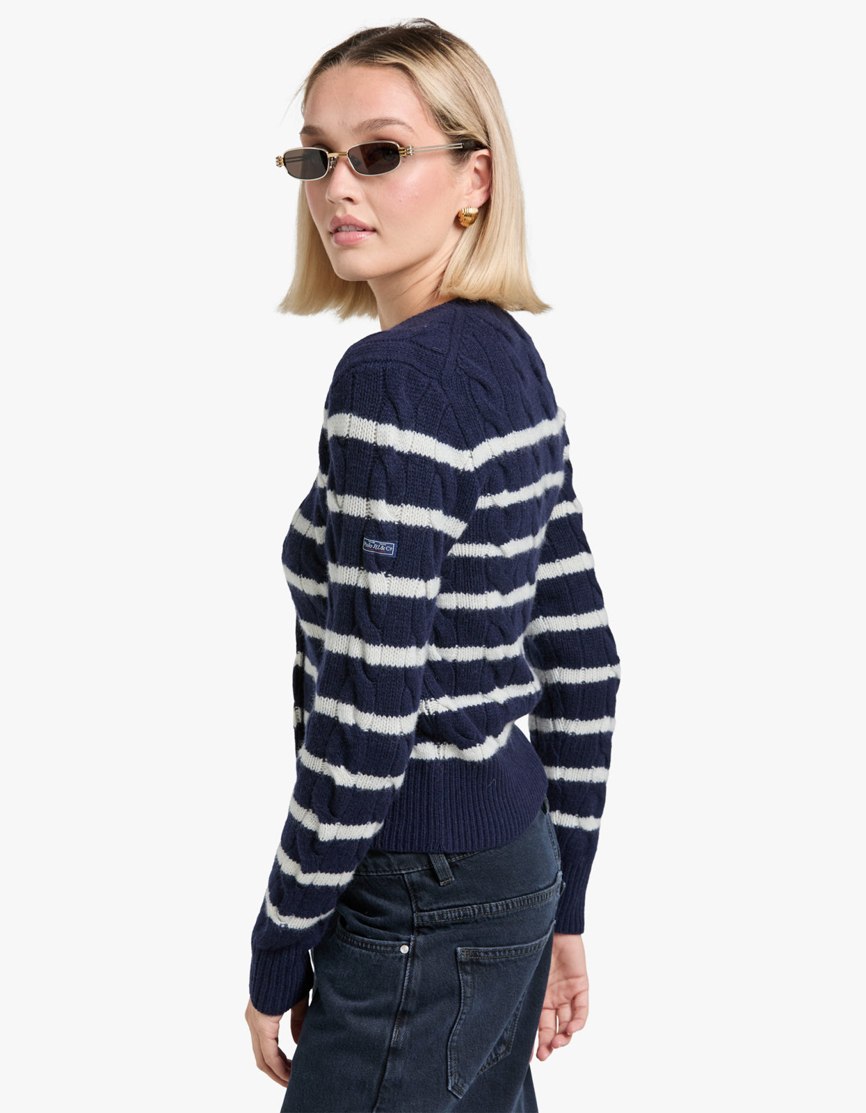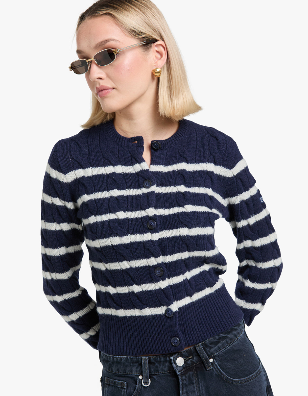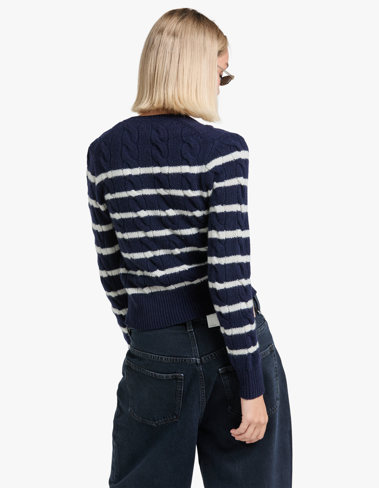 Striped Cable Wool Cashmere Cardigan - Hunter Navy/Authentic Cream