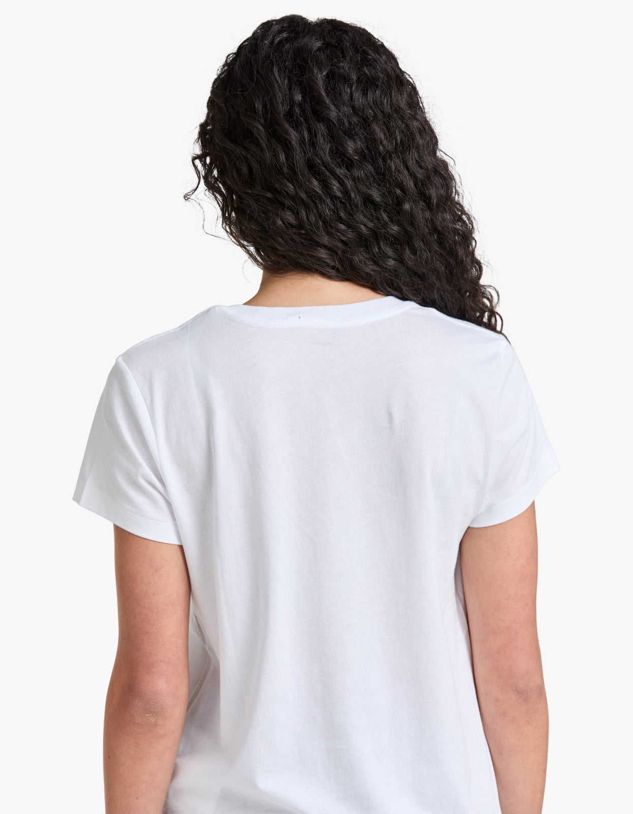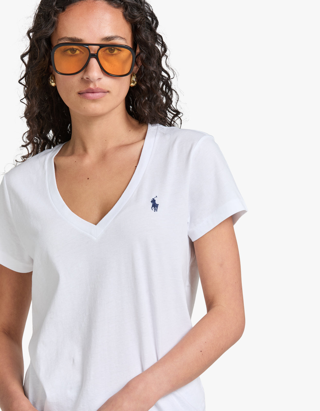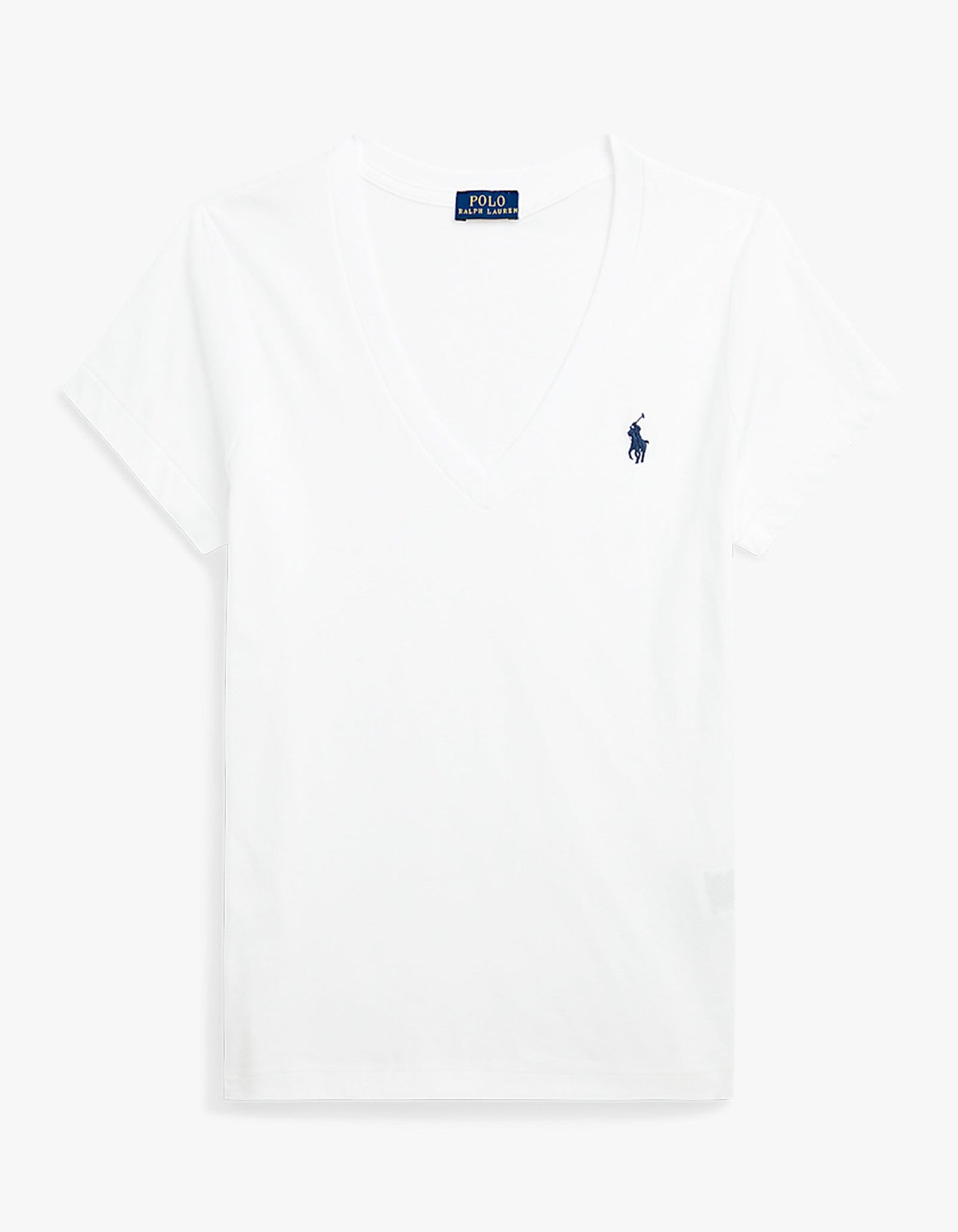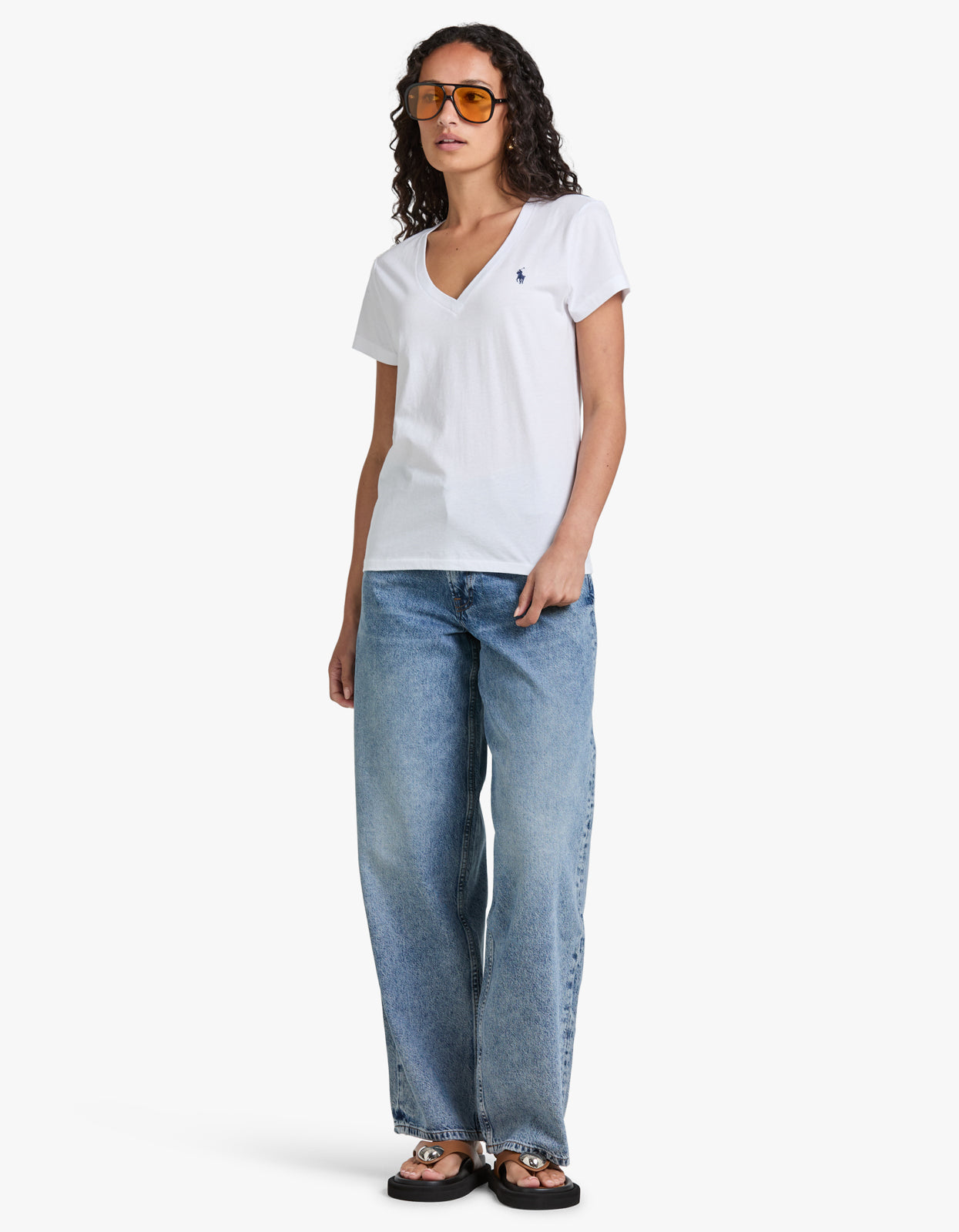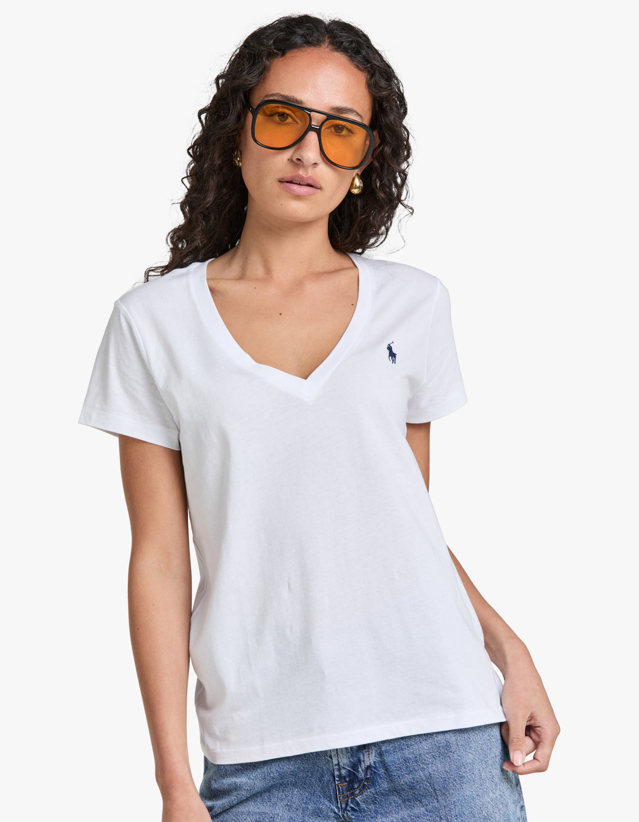 The perfect top half for year-round styling - the Polo Ralph Lauren core classic with a new feminine V-neck silhouette. The perfect tee to carry you through the seasons, sporting a relaxed fit, short sleeves and the iconic 'Pony' embroidered at the chest. Another great piece to add to your capsule wardrobe.