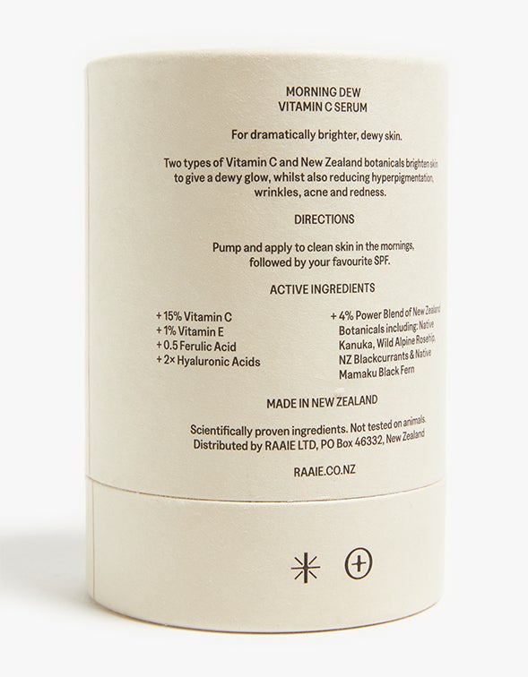 Two different types of Vitamin C work to give you a dewy glow, even out skin tone, and protect against future ageing. The resilience of New Zealand botanicals, which are known for thriving in extreme UV environments, provide added protection; NZ Blackcurrants (rich in fruit antioxidants to protect against UV damage), Sauvignon Blanc Grapeseed (protect and reverse signs of ageing), Mamaku Black Fern (hydrating and tightening effect), and Kānuka (healing and anti-inflammatory) work synergistically to protect skin from daily damage.