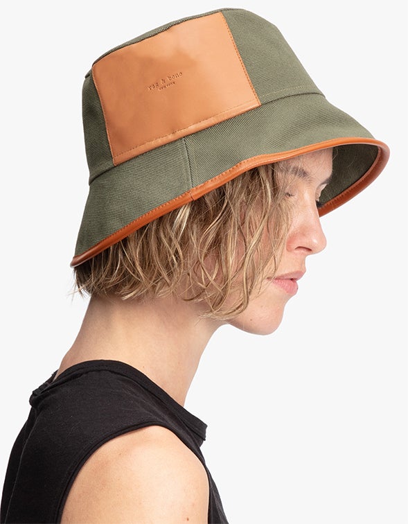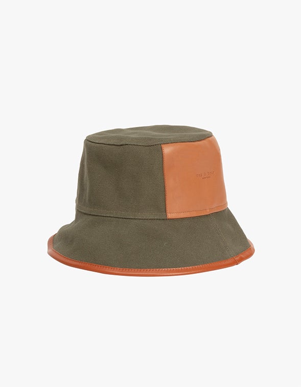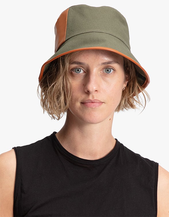 Bucket hat Simple, stylish, summer must-have Contrast two-tone colourway Khaki base Orange leather detailing Brand logo imprinted on leather panel One-size Designed in New York City