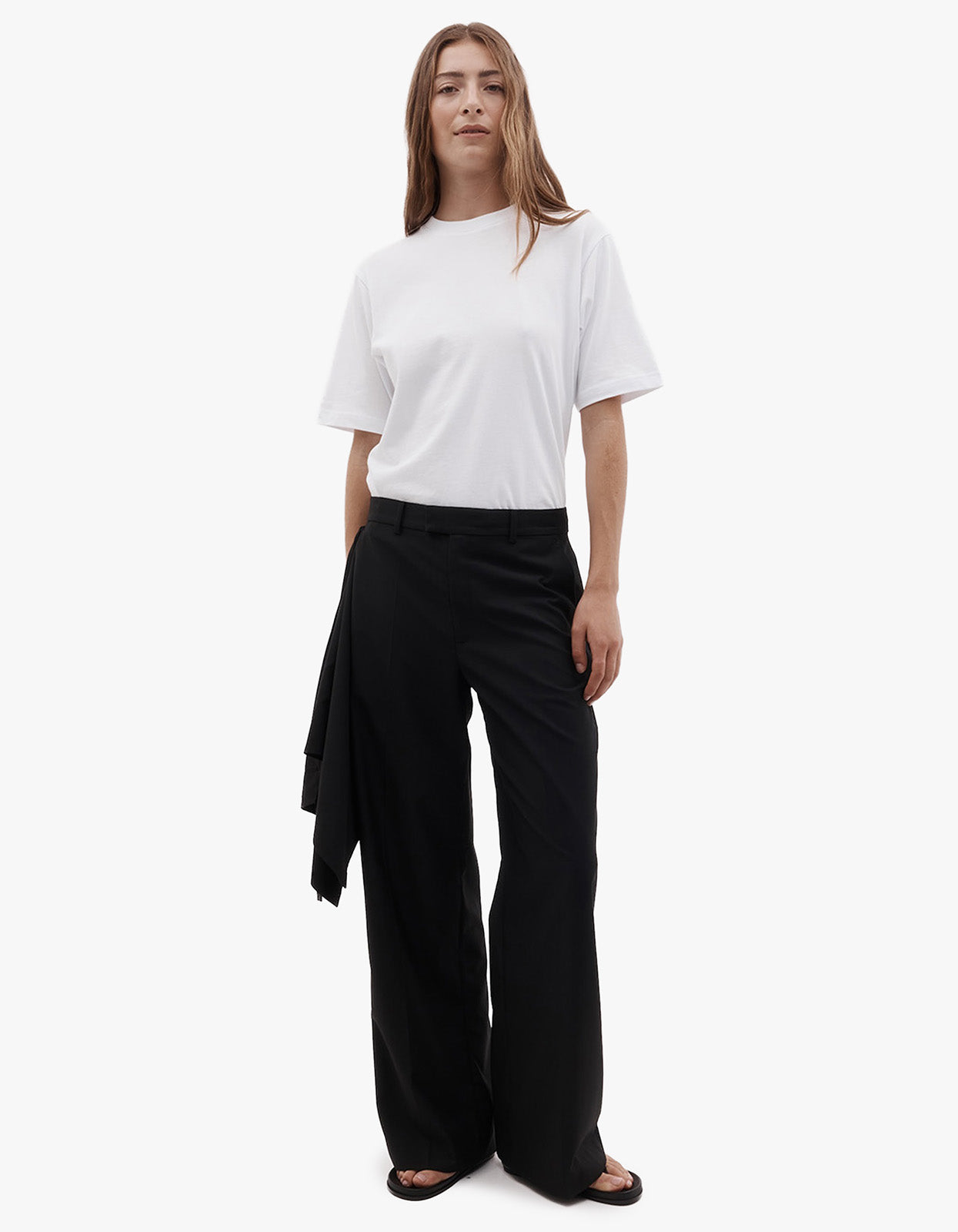 The Magda Trouser features a fully detachable apron for versatile styling options, with a hook-and-eye fastening on the left and a belt-loop closure on the right for an adjustable fit.