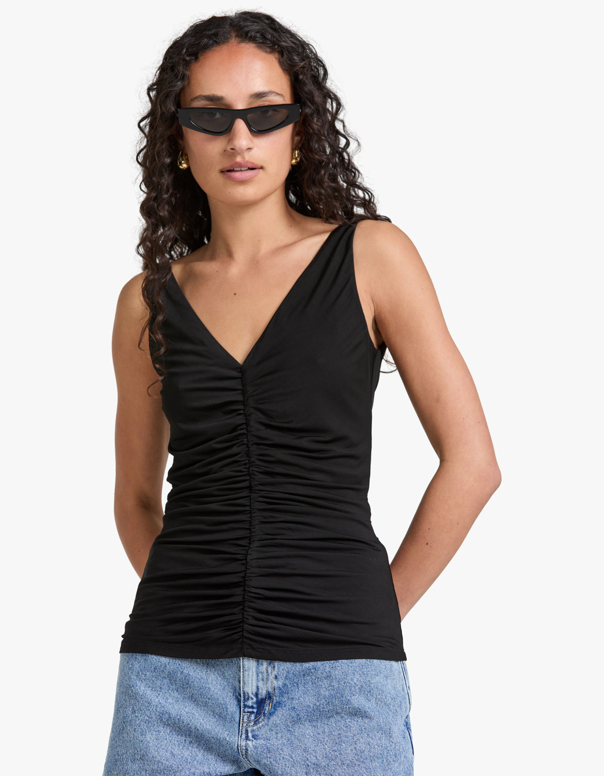 Elevate any outfit with this essential piece, featuring a unique ruched design that adds a touch of spice. Perfect for a night out or a day at the office. Embrace luxury and sophistication with this must-have top.