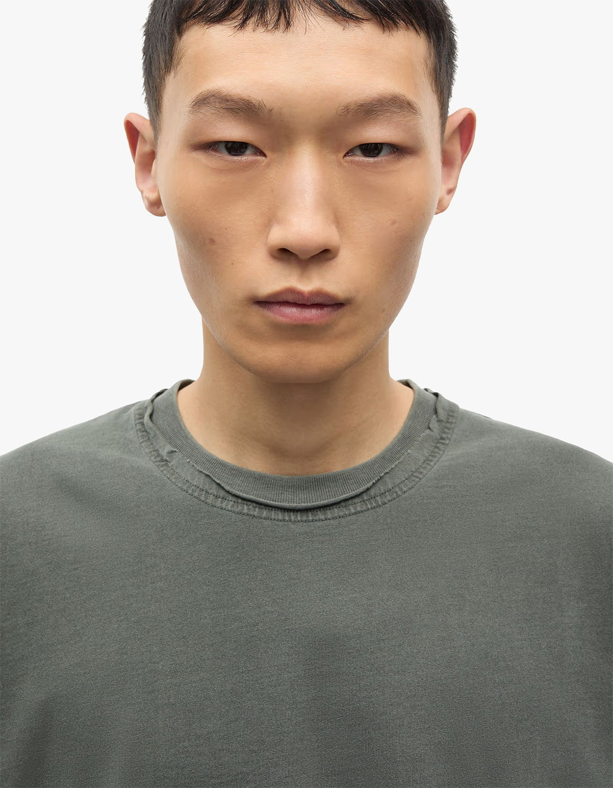 Crafted from 100% organic cotton with a distinctive pigment-dyed finish, it features a rib-knitted crewneck with raw edges for understated texture. The Dark Evergreen hue offers versatile sophistication, making it an essential layering piece or standalone staple for any wardrobe.