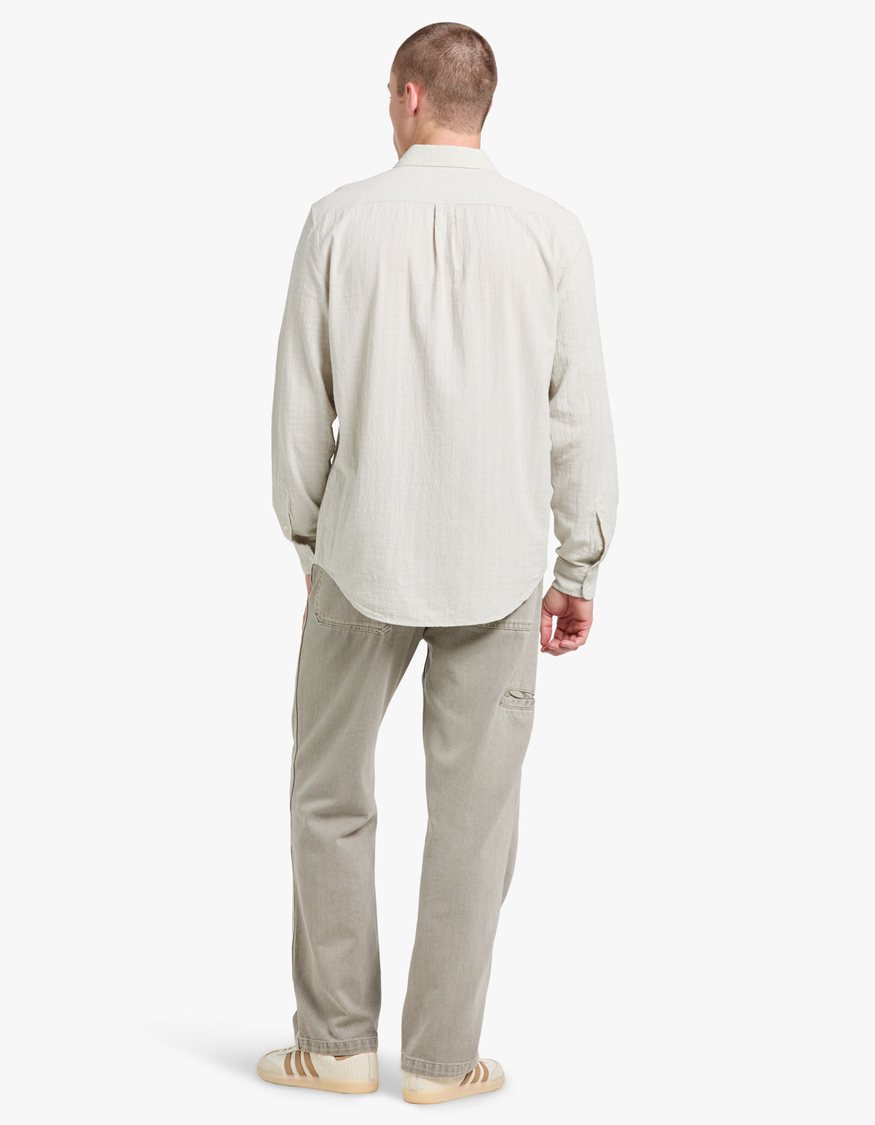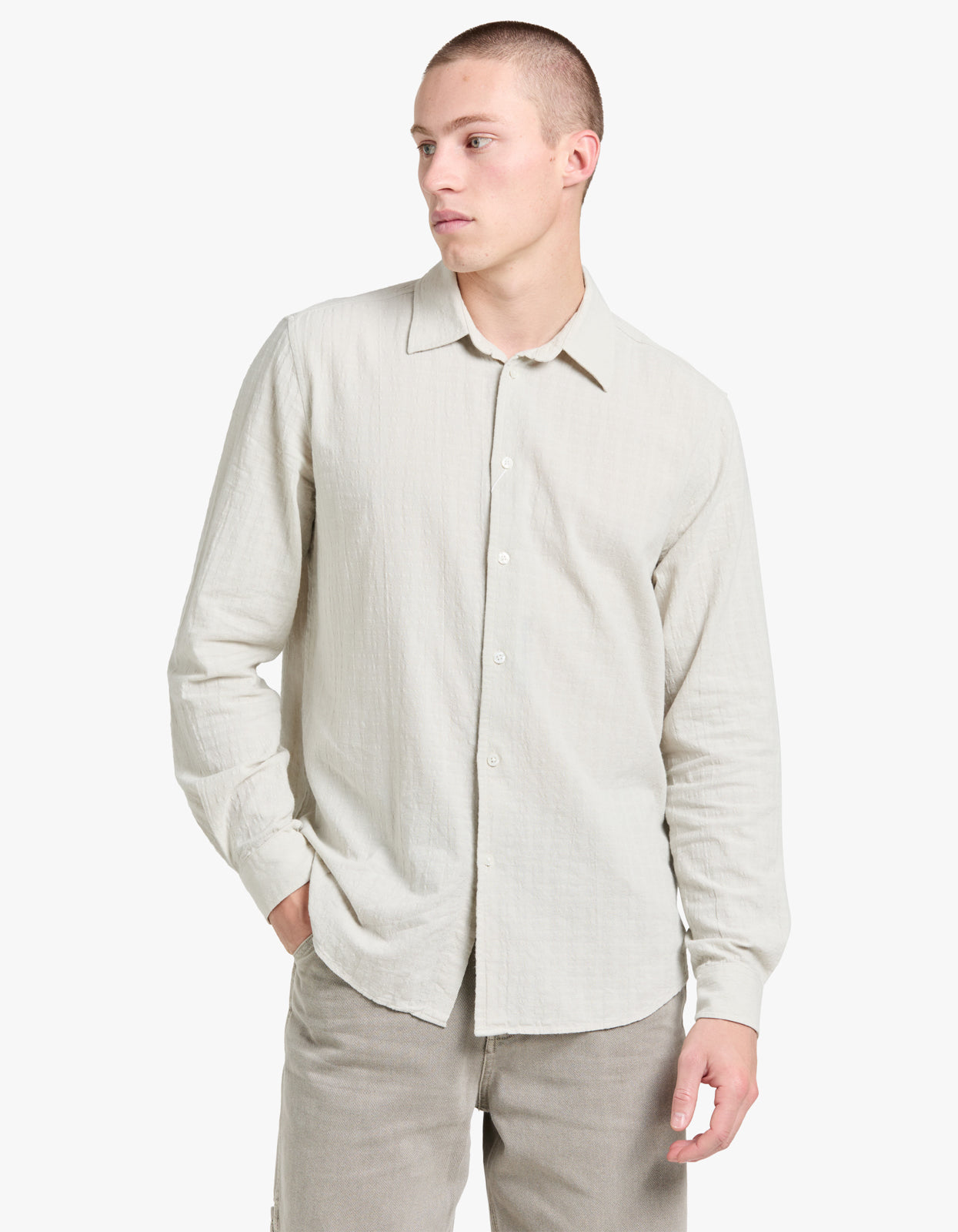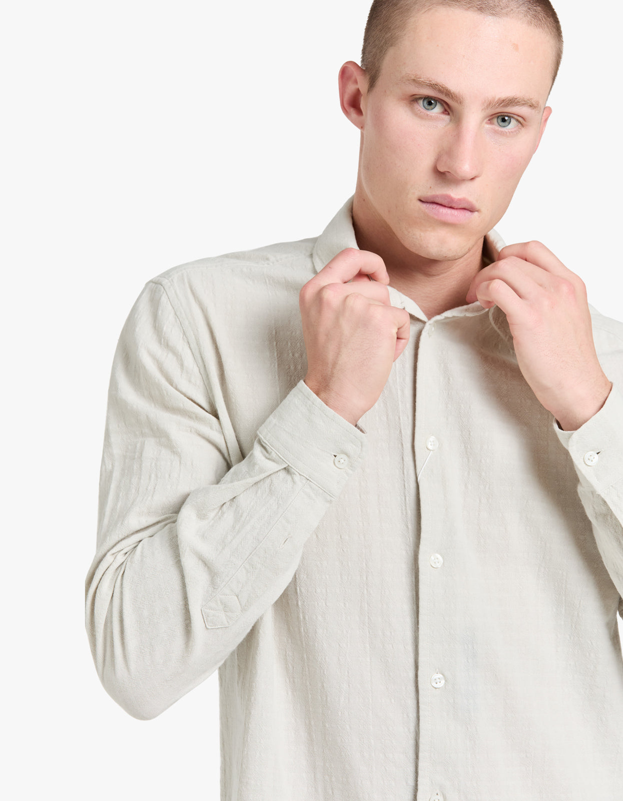 Crafted from premium fabric, this long-sleeved shirt features a regular fit and button closure on the front. The neck yoke seam with pleat and faint striped pattern add a touch of sophistication. Embrace effortless style and timeless elegance.